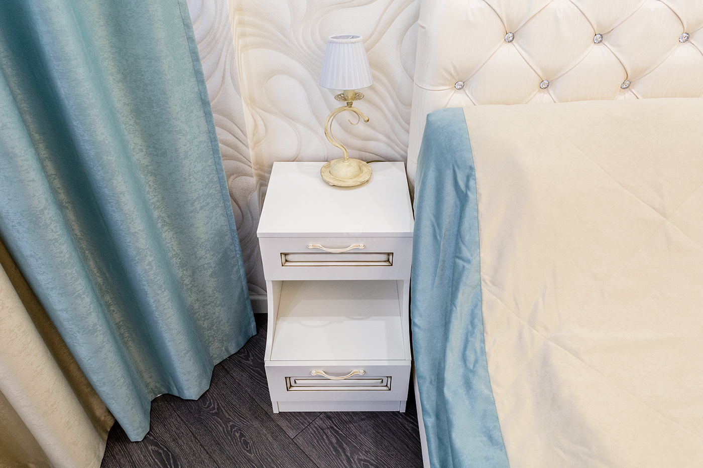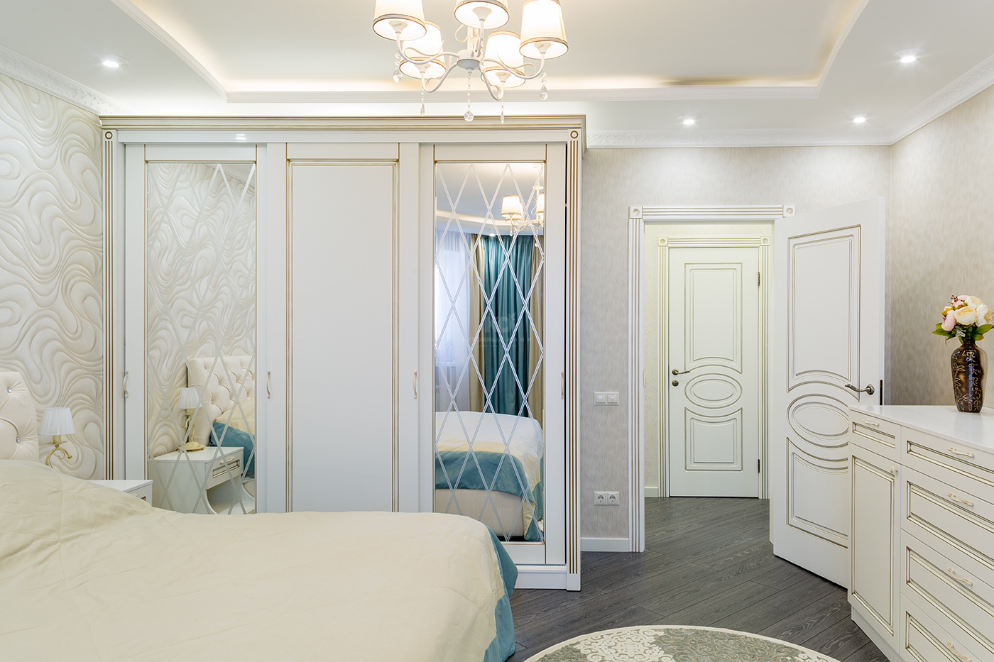 Светлые оттенки вкупе с классической фрезеровкой использованы и в мебели для ванной комнаты. А вот спальня выполнена уже в совсем ином стиле. Перед нами предстает модерн с обилием открытых полок, выверенными пропорциями и мебелью, избавленной от излишнего декорирования. Здесь первую скрипку играет функциональность, а также великолепие бело-серых оттенков.