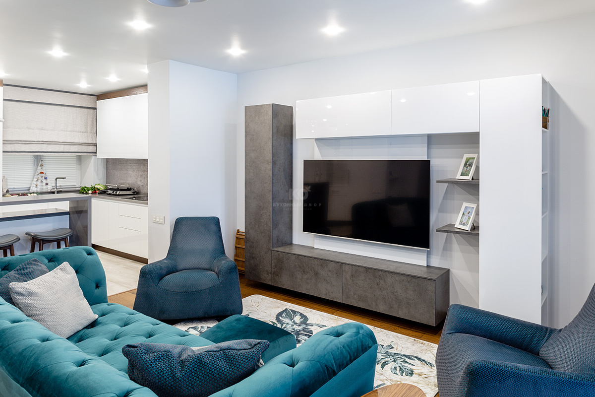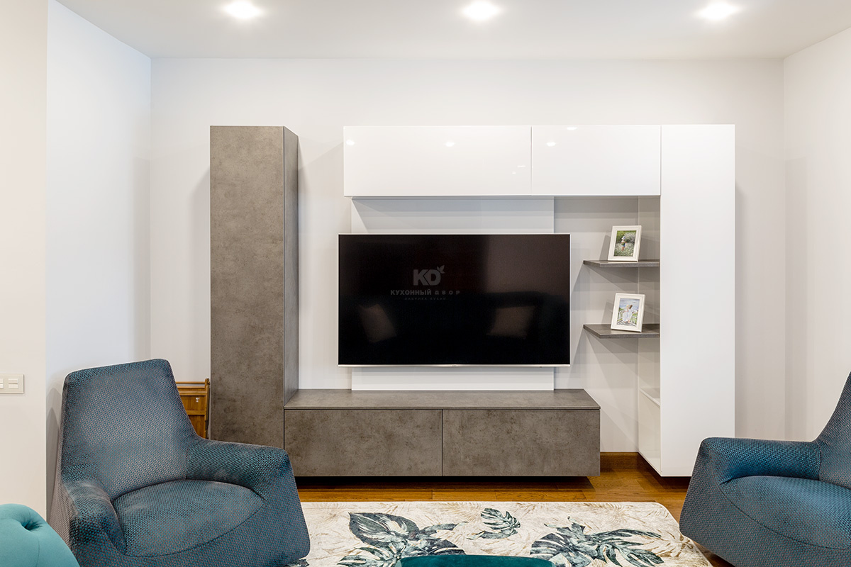 Белоснежные глянцевые фасады из МДФ вверху, и серо-бежевые «каменные» поверхности внизу. Инь и Ян переплелись вокруг телевизора, словно обрамляя окно в бесконечно интересный мир. Развивая философию двойственности, дизайнеры наделили этот проект не только красотой, но и практичностью. Так на «белой» стороне композиции были созданы открытые полки, которые хозяйка с удовольствием украсила любимыми фотоснимками. В торцевой части шкафа тоже есть полки, идеально подходящие для размещения книг и полезных мелочей.