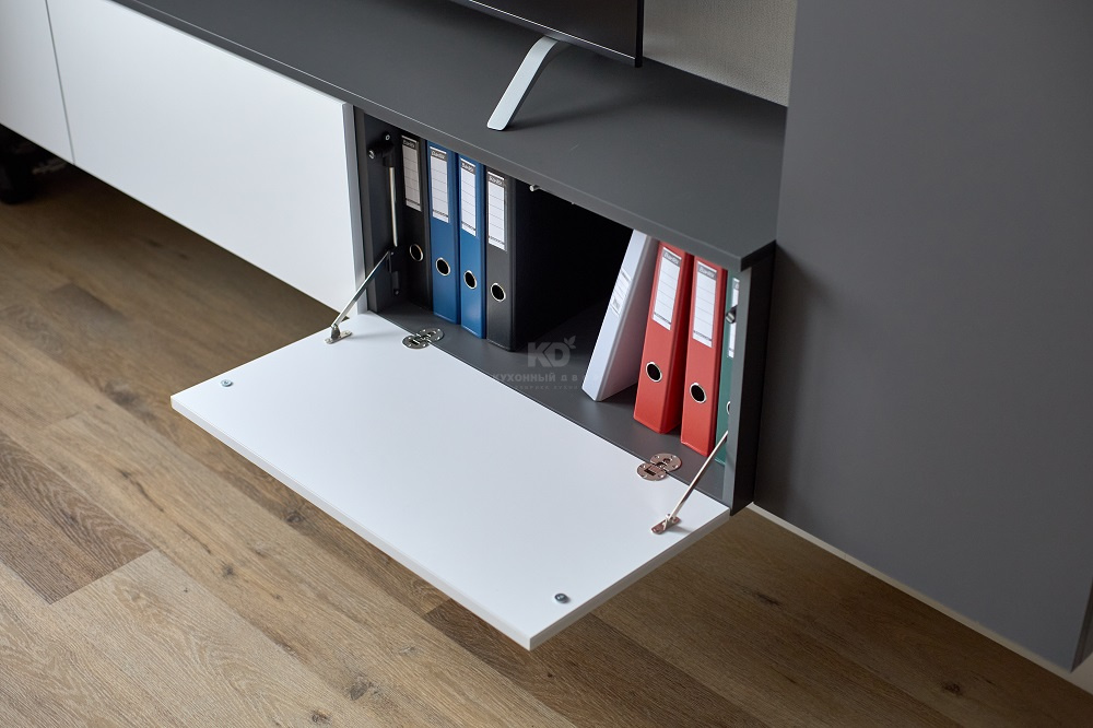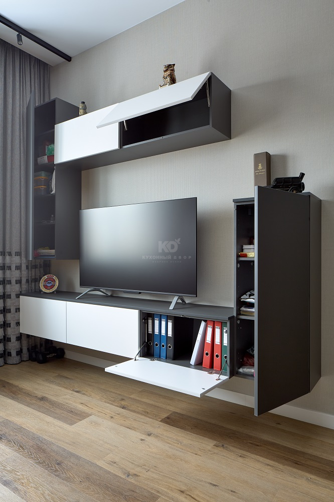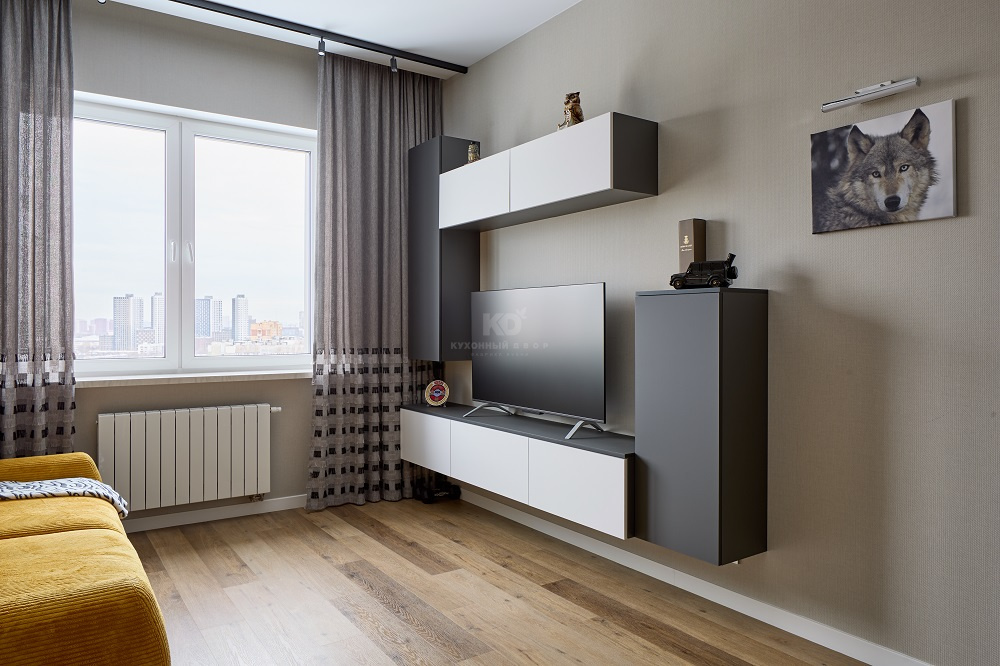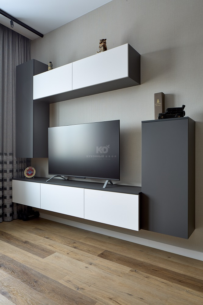 Гостиная идеально сочетается с кухней и создаёт в интерьерах единое настроение. Её модули словно «парят» над полом, объём внутреннего пространства поистине впечатляет, а фасады дарят уникальные тактильные ощущения. Секрет в покрытии «Экстра Тач Матт» с «бархатистой» текстурой. Прикасаться к нему – удовольствие совершенно особого порядка!