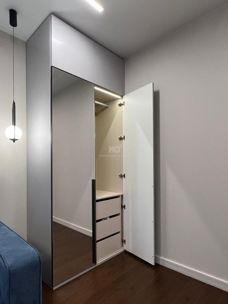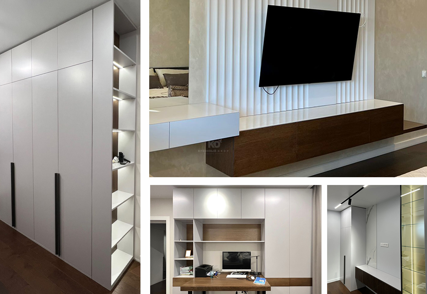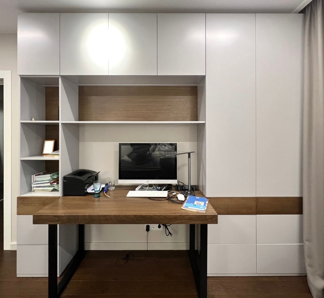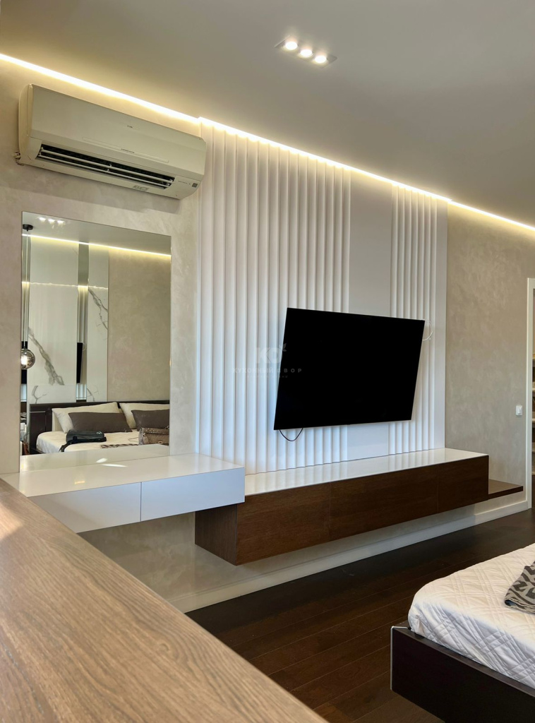 Дизайнеры КД получили огромное удовольствие, работая над этим масштабным и сложным проектом. Нами были созданы несколько высоких шкафов, мебель для спальни, две TV-зоны, а также шкафы с интегрированным в композицию рабочим столом. Каждый элемент выдержан в общей стилистике с несколькими характерными чертами. Среди них: