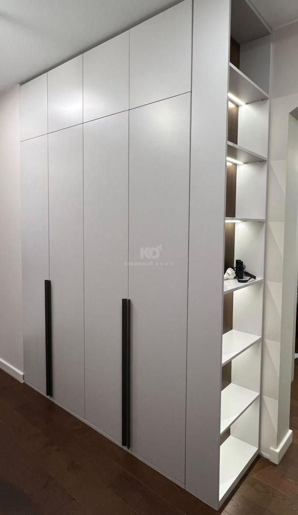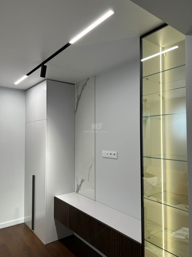 - Зоны с витражами и открытые полки, оснащённые подсветкой. Отлично подходят для размещения стильных предметов декора.
