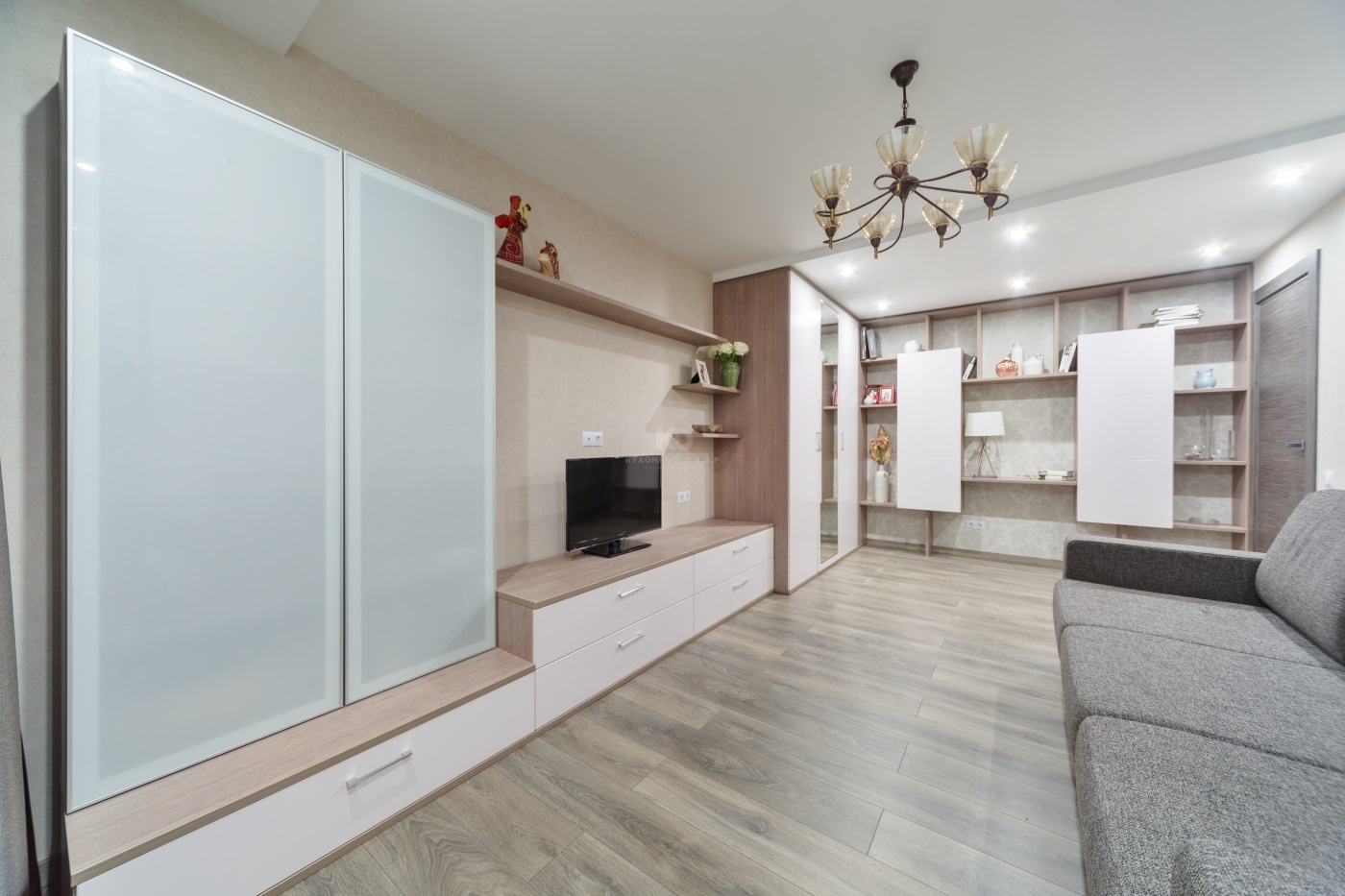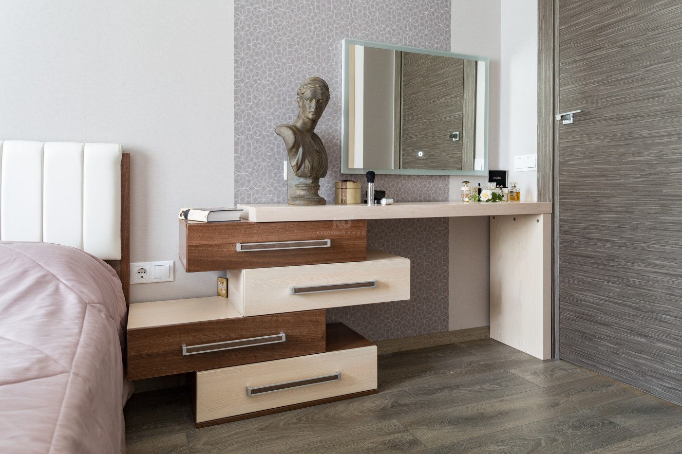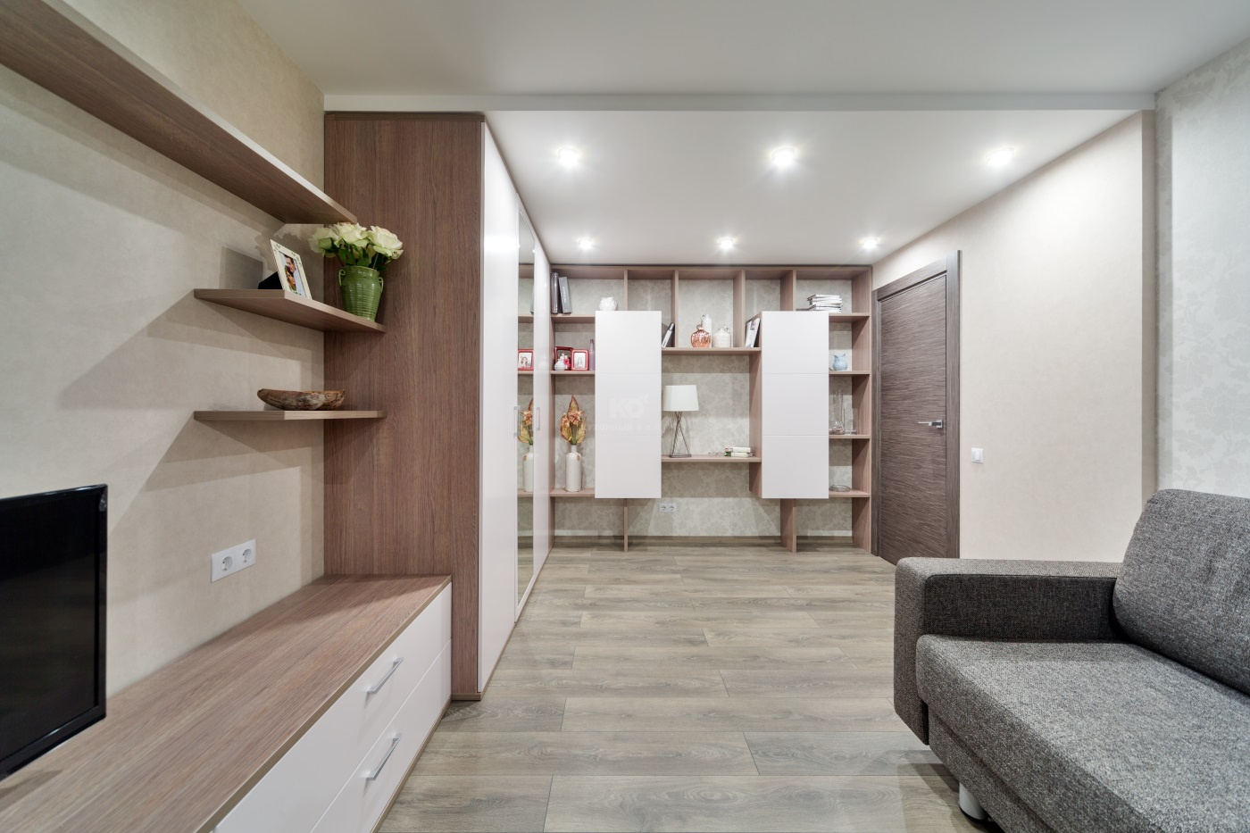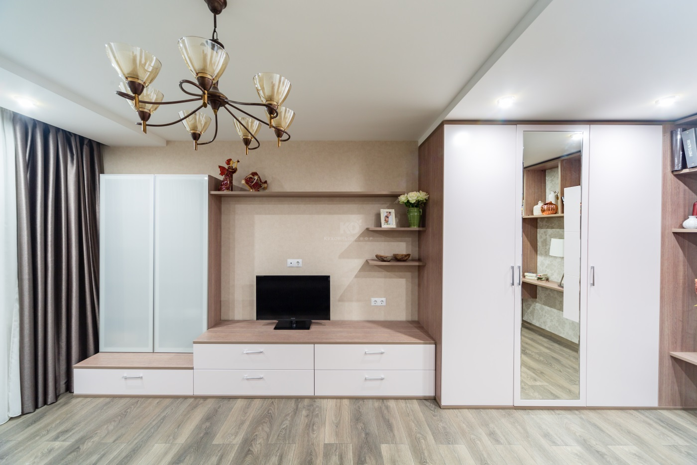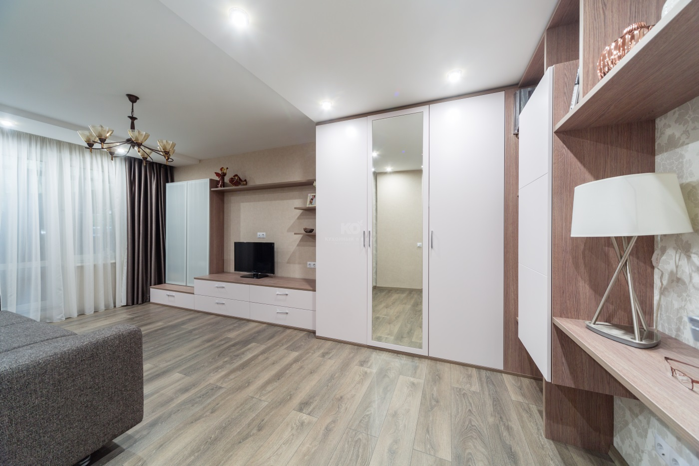 Перед вами яркий пример того, как выглядит квартира после заказа корпусной мебели в бренда "Кухонный Двор" : хозяйка квартиры, заказав у нас современный кухонный гарнитур "Эмма", решила привнести элементы стиля, в котором он выполнен, в спальню и гостиную. Современные материалы, из которых изготовлена мебель для этих комнат, не только выглядят эффектно и свежо, но еще и обладают рядом неоспоримых преимуществ, как-то: ударопрочность, влаго- и светоустойчвость, экологическая безопасность. Единый стиль прослеживается во всех элементах оформления квартиры. Разве это не прекрасно?