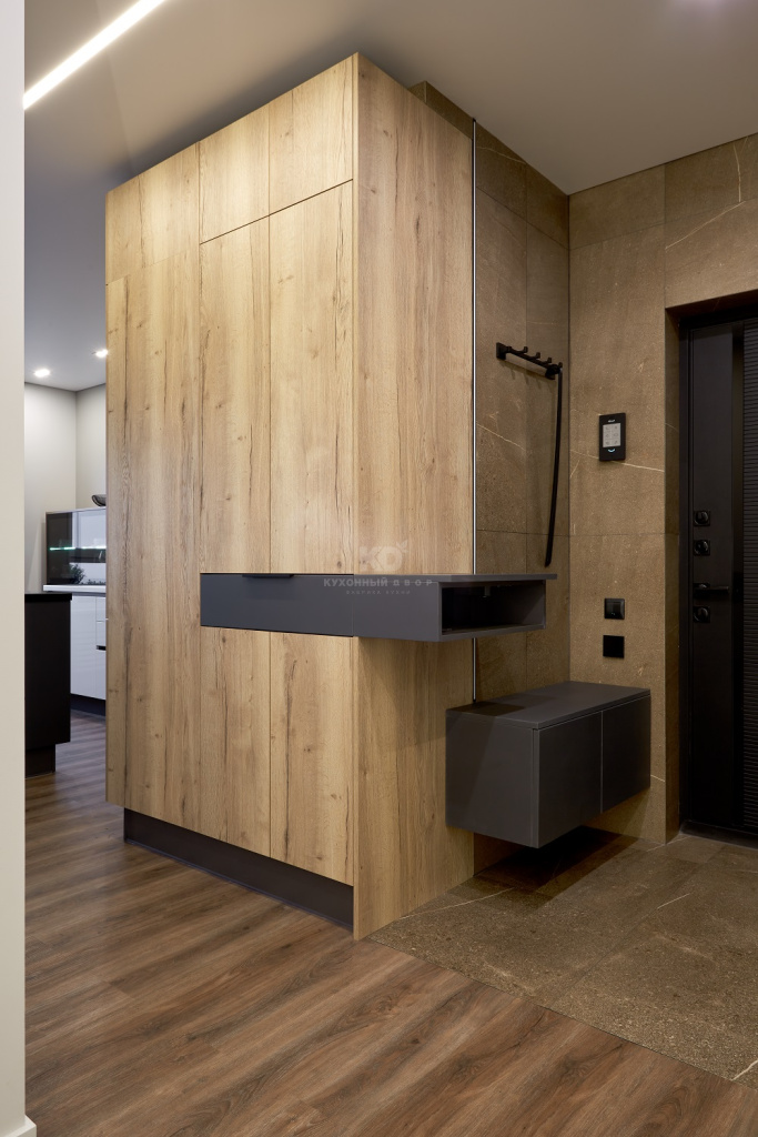Знаете, как с порога узнать по-настоящему модное жилище? Взглянуть на прихожую! Если она интригует с первого взгляда, остальные интерьеры, скорее всего, тоже будут хороши. Здесь всё получилось именно так. Перед вами входная мебельная группа, которая не только поражает красотой натуральных фактур, но и является…частью кухни!