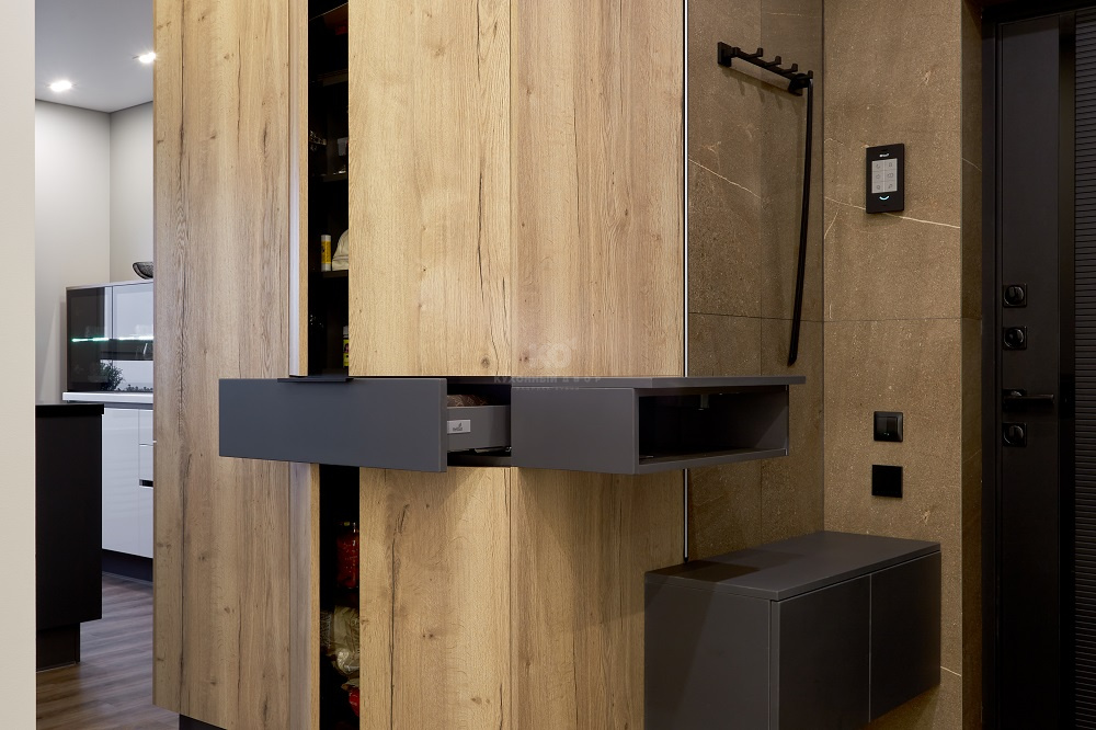 Хранить что-то компактное в этой прихожей удобно. А как насчёт предметов покрупнее? Их можно разместить в зонах над и под выдвижным ящиком! Эти зоны совершенно незаметны, ведь имеют глухие фасады без ручек и открываются лёгким нажатием. Шкаф над графитовом ящиком отлично подходит для хранения средств для ухода за обувью и одеждой. А в нижней зоне свободно помещаются самые крупные предметы – даже разносолы и объёмный пакет с кормом для крупной собаки.