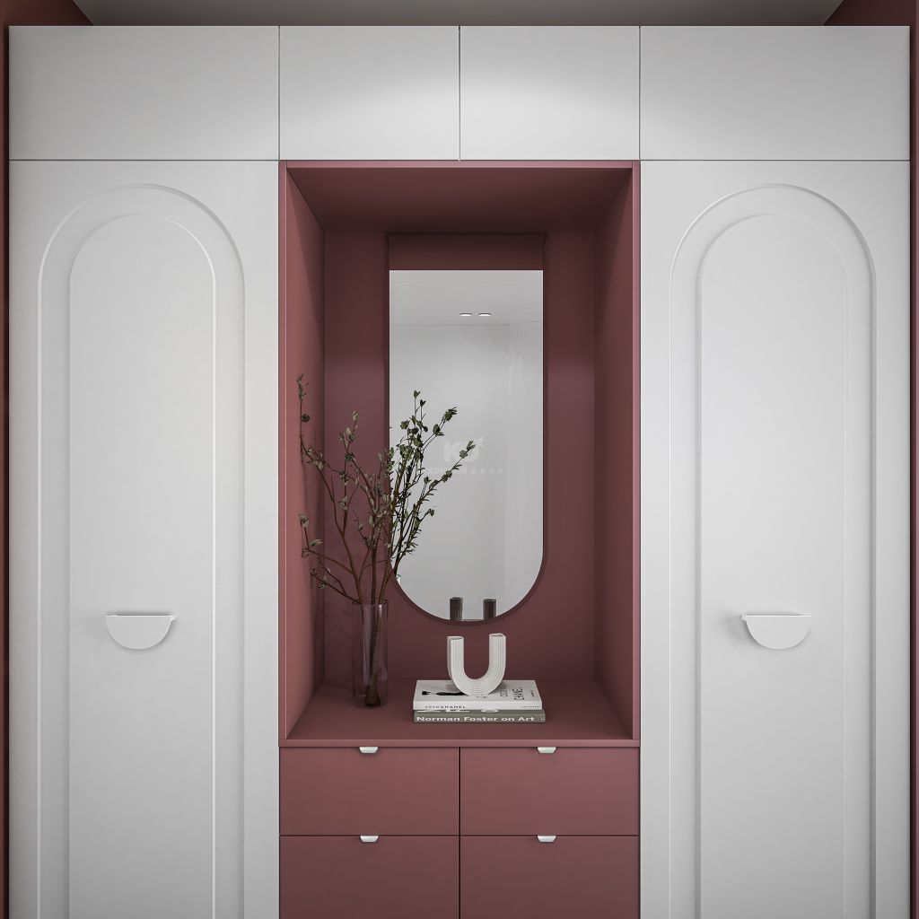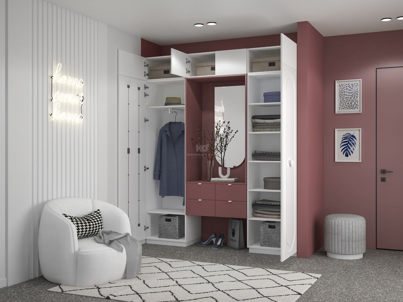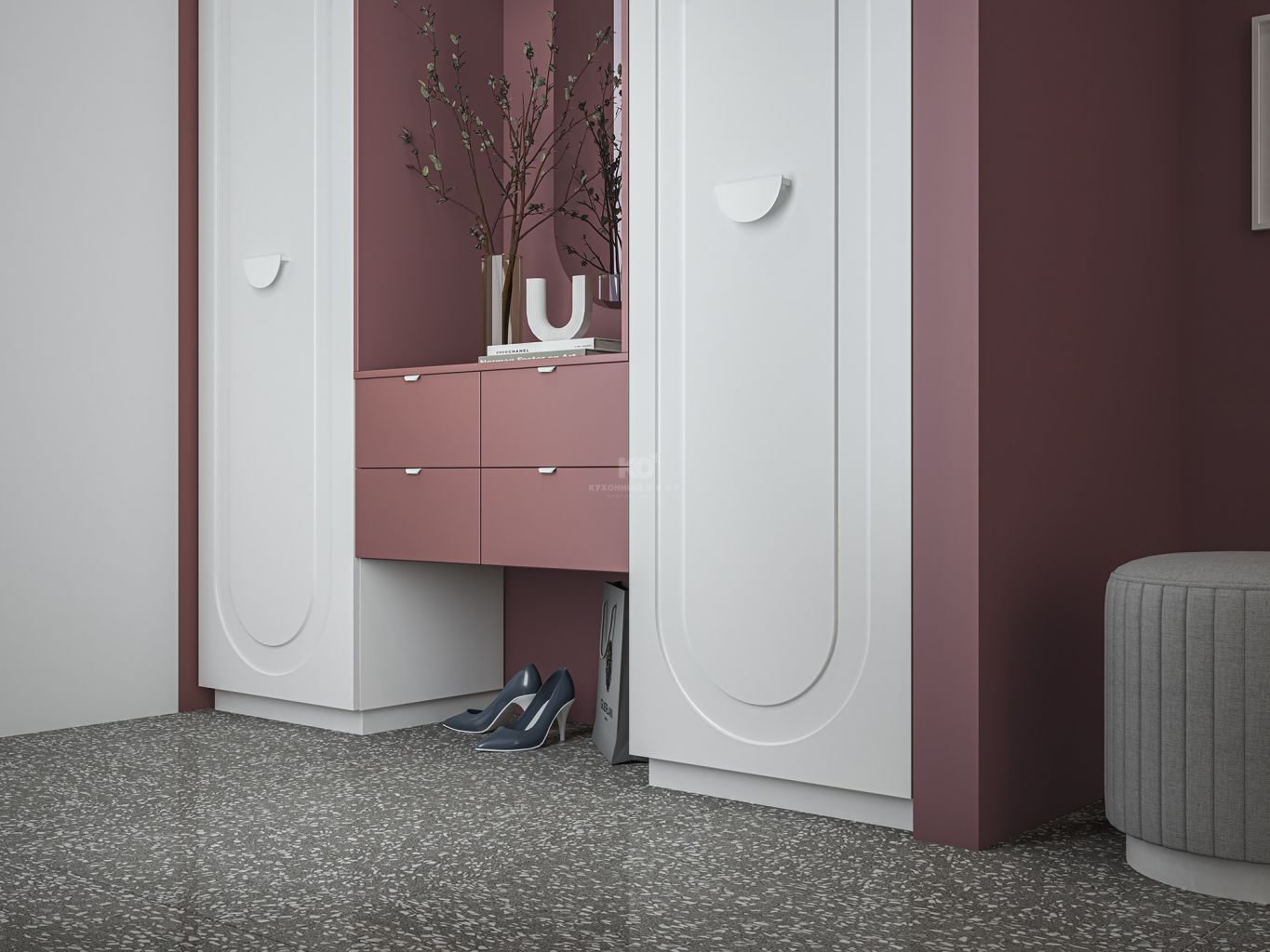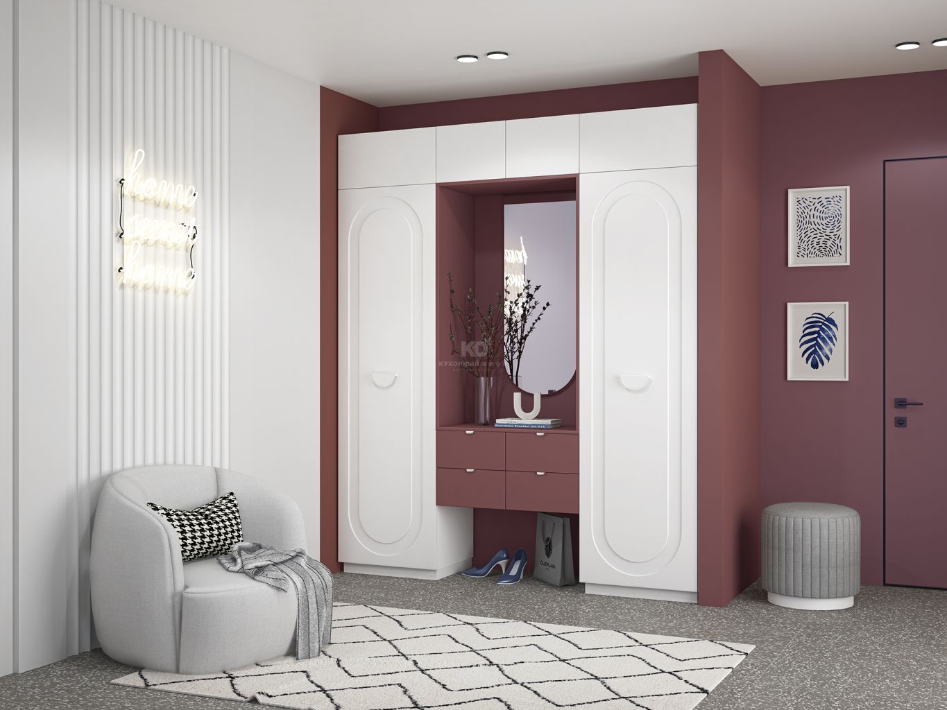 Сочетание внутренних боковин глубокого красно-коричневого оттенка в тон стенам и белоснежных фасадов с изящной закольцованной фрезеровкой создает эффект изысканного контраста. Белый оттенок фасадов придает композиции легкость, а утонченный винный — привносит глубину и камерность, превращая прихожую в парадную комнату дома.