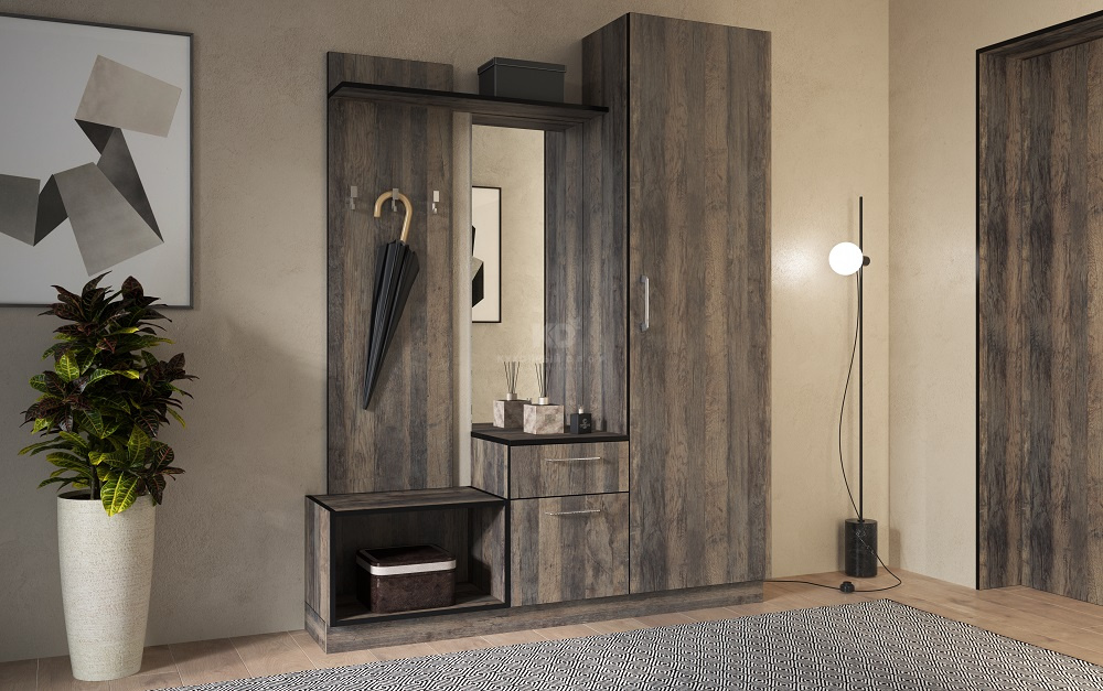 Прежде всего, в фасадах. Они создаются из немецкой экоплиты с оригинальной древесной фактурой. А чтобы сделать поверхности максимально выразительными, дизайнеры украсили торцевые части «Генриха» контрастными акцентами. Чёрный цвет очень идёт модели, привнося в её по-домашнему уютный облик люксовые нотки. Такая прихожая будет прекрасно смотреться в любых, даже самых статусных интерьерах!
