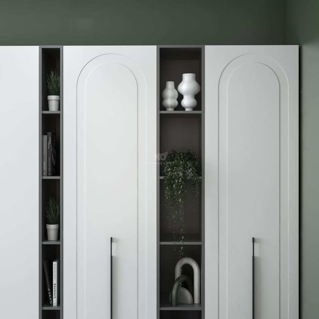 Шкаф Арко — продолжение фирменной эстетики одноименной линейки Арко от бренда «Кухонный Двор». Он создан для тех, кто хочет, чтобы мебель в доме говорила на одном языке и формировала цельный, гармоничный интерьер. Белоснежные фасады с устремленной вверх арочной фрезеровкой наполняют пространство легкостью и визуально поднимают потолки. Черные вытянутые ручки усиливают это впечатление, добавляя графичный акцент.
