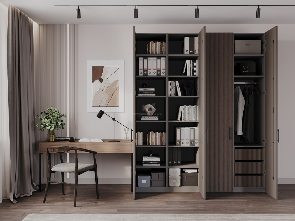 Четырёхстворчатый шкаф кофейного оттенка — настоящая мечта Мари Кондо. Он не требует «магической уборки» или марафонов по расхламлению: порядок становится естественным состоянием. Мы продумали всё: глубокие полки, удобные рейлинги, выдвижные ящики на нужной высоте — чтобы каждая вещь находилась на своём месте и была легкодоступна. Ноа Плиссе — это шкаф, который наводит порядок и в пространстве, и в мыслях.