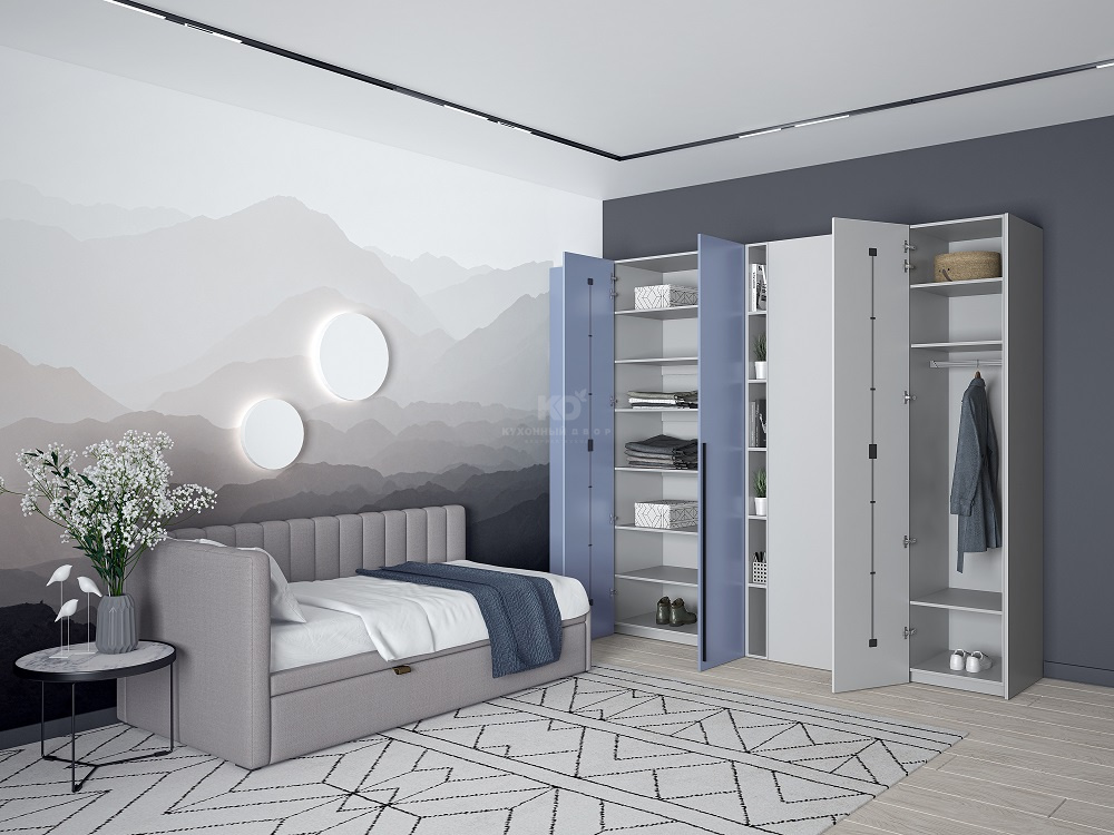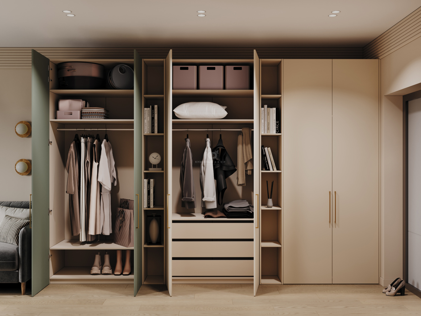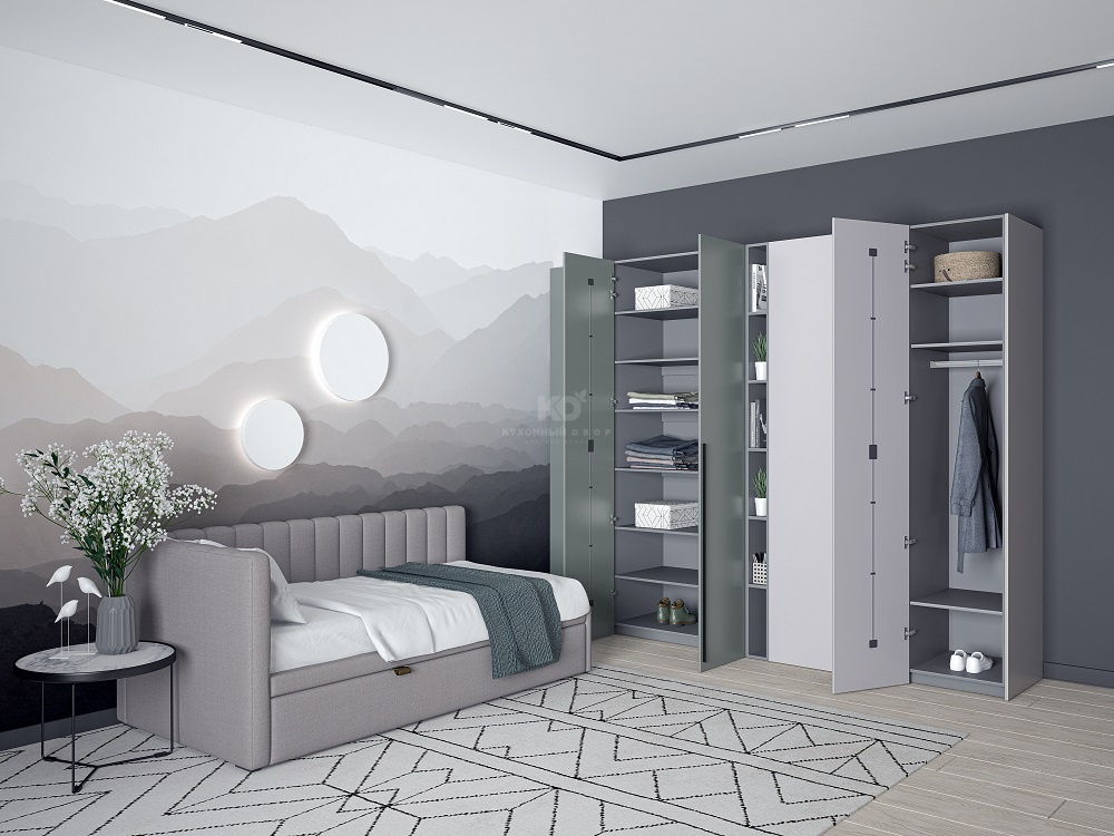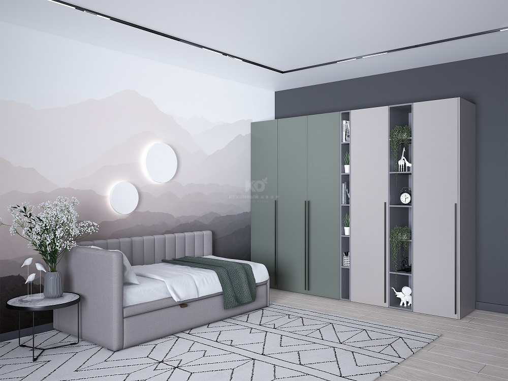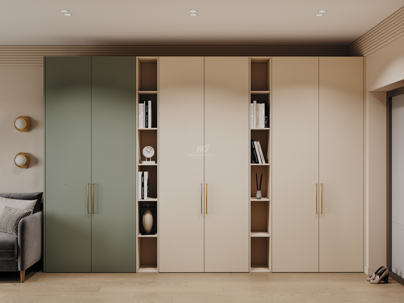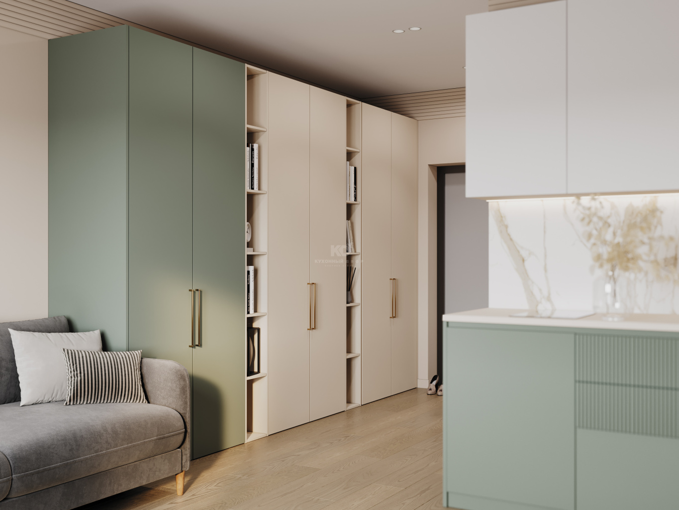 Сдержанная палитра сочетается с актуальным дизайном: элегантный шалфеевый оттенок контрастирует с тёплым бежевым, создавая уютную и в то же время современную атмосферу. Золотые ручки подчёркивают эстетику фасадов, а двери скользят легко и бесшумно благодаря качественной фурнитуре от наших партнёров.