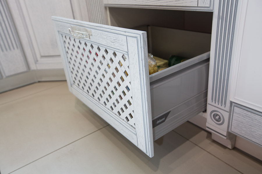 Внешний вид современной классики тоже имеет ряд специфических особенностей. «Виконт», как лучший образец перевоплощения, не перегружен деталями. Декор модели скорее сдержанный, чем кричащий. Стилевые акценты, подтверждающие классическое происхождение гарнитура, расставлены очень интеллигентно. Традиционные для классики филенчатые фасады, покрытые серебряной патиной, гармонично сочетаются с резными пилястрами, а декоративные решетки на нижних фасадах образуют слаженный дуэт с открытой сушкой для посуды. Прекрасно смотрится ниша над сушкой, обрамленная балюстрадой. Обращает на себя внимание винотека для удобного размещения бутылок вина. Еще один эксклюзивный элемент гарнитура — настольный буфет с открытой нишей. Красоту стекла с матовым рисунком, нанесенным по технологии «Кристалайзер», подчеркивает нежный свет встроенных за нижний карниз светильник. Белый цвет гарнитура собирает все стилевые детали в единую картину торжественного величия.