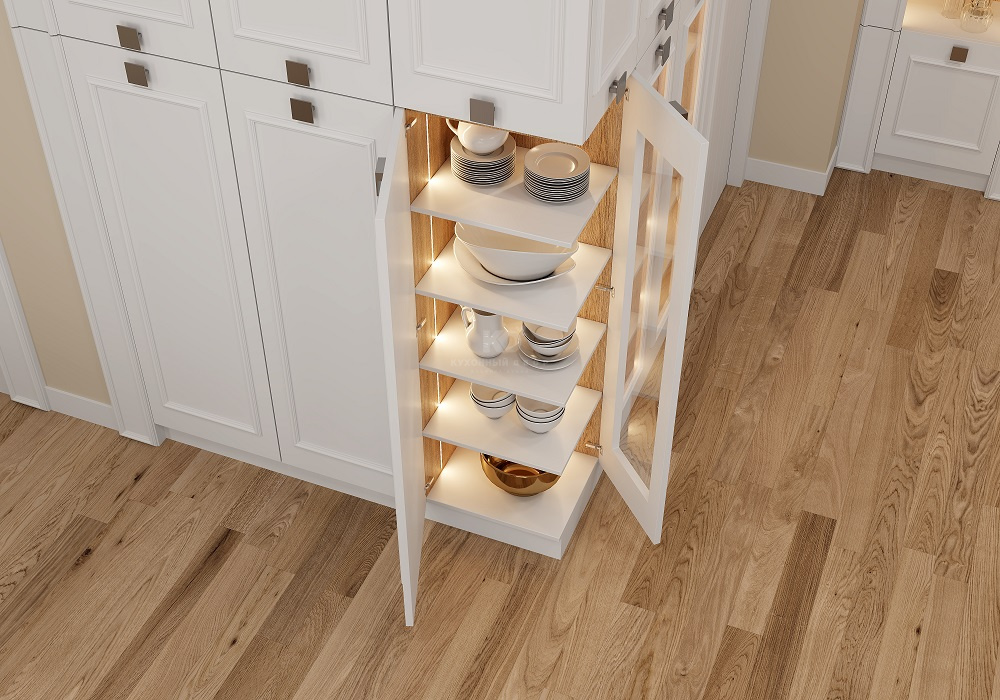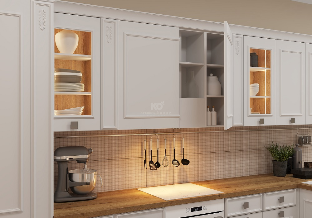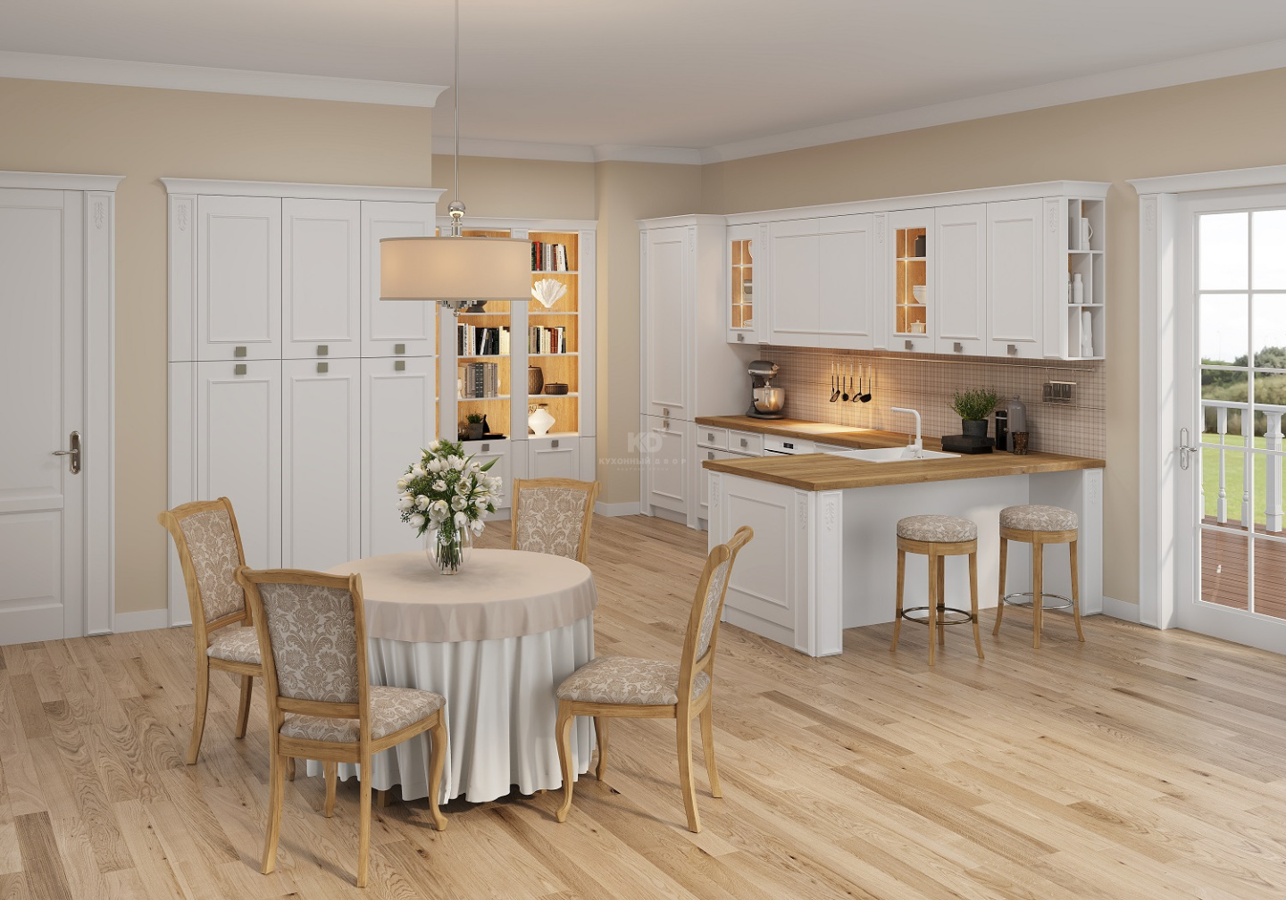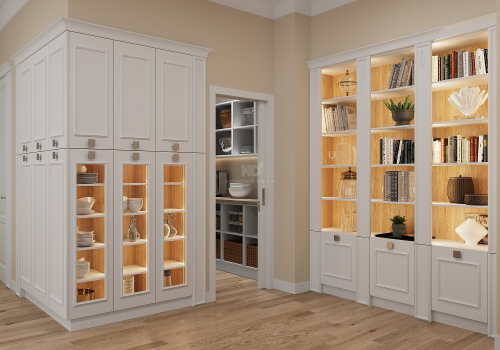 Впрочем, присмотритесь внимательней! Часто ли в чистой «классике» вам встречалась сеть небольших полочек разной ширины, расположенная в торцевой части кухни? А полуостров, одновременно являющийся барной стойкой? А высокие книжные шкафы прямо в зоне кухни? С точки зрения композиции и эргономики «Астрид» выстроена уже не по классическим, а по современным канонам.