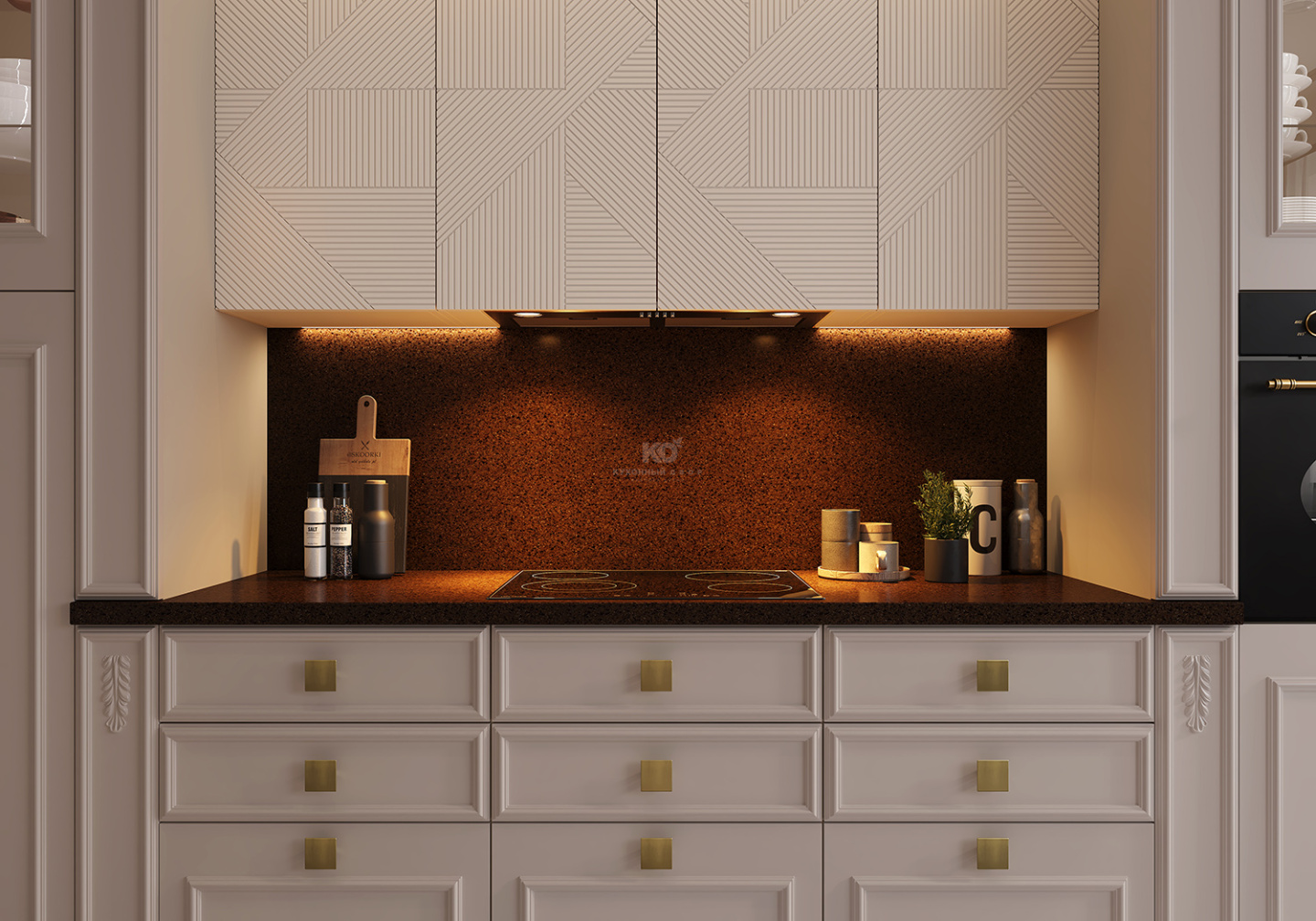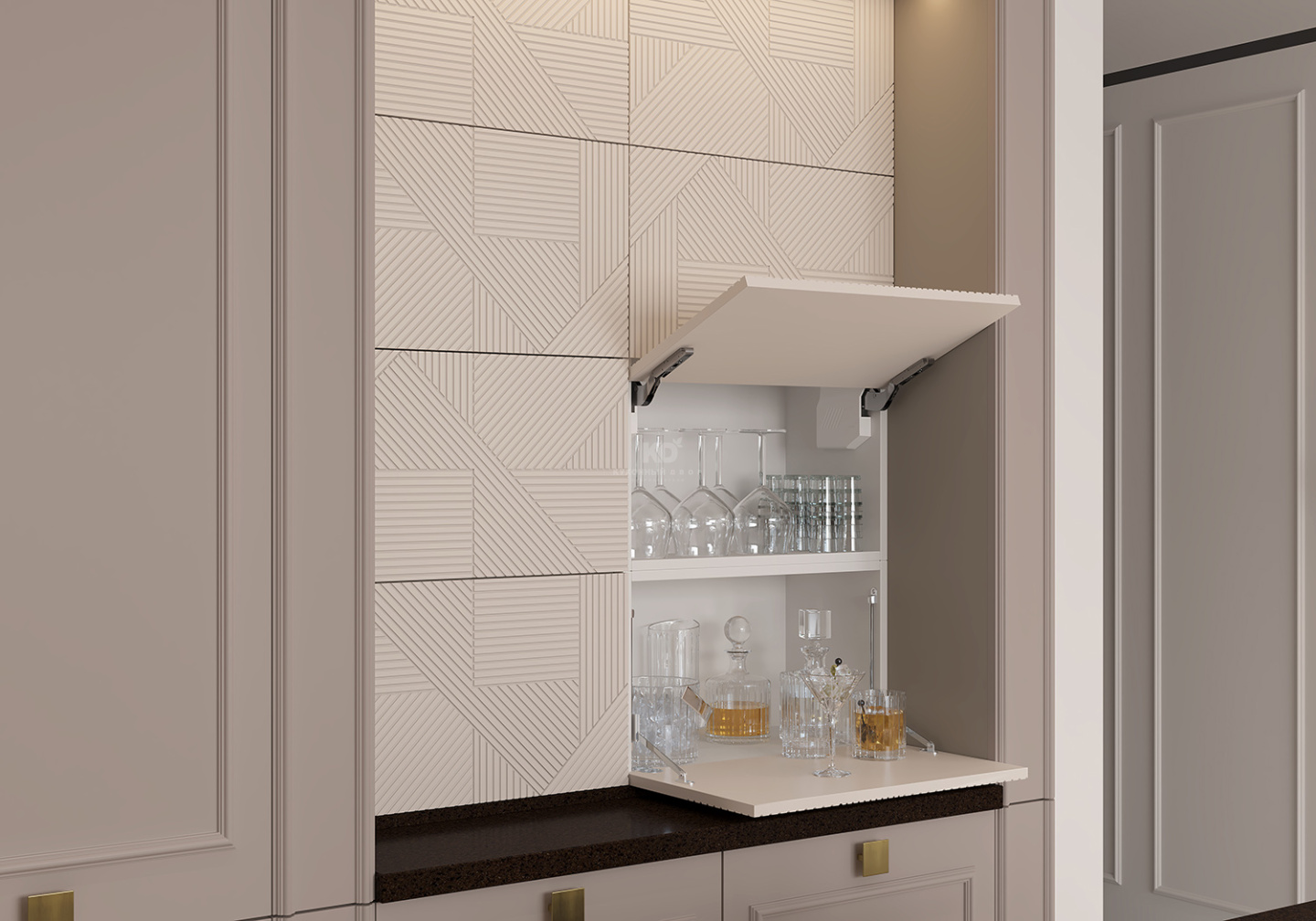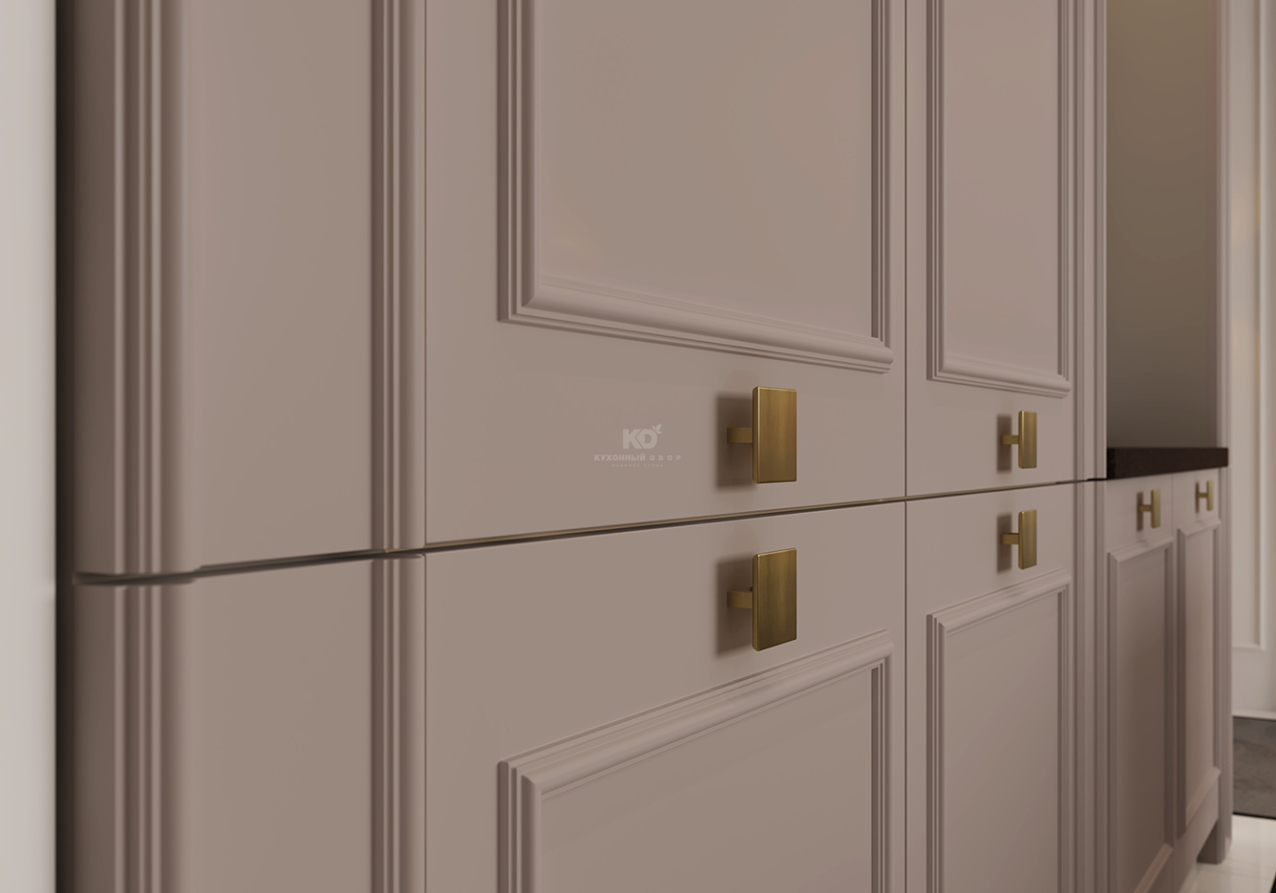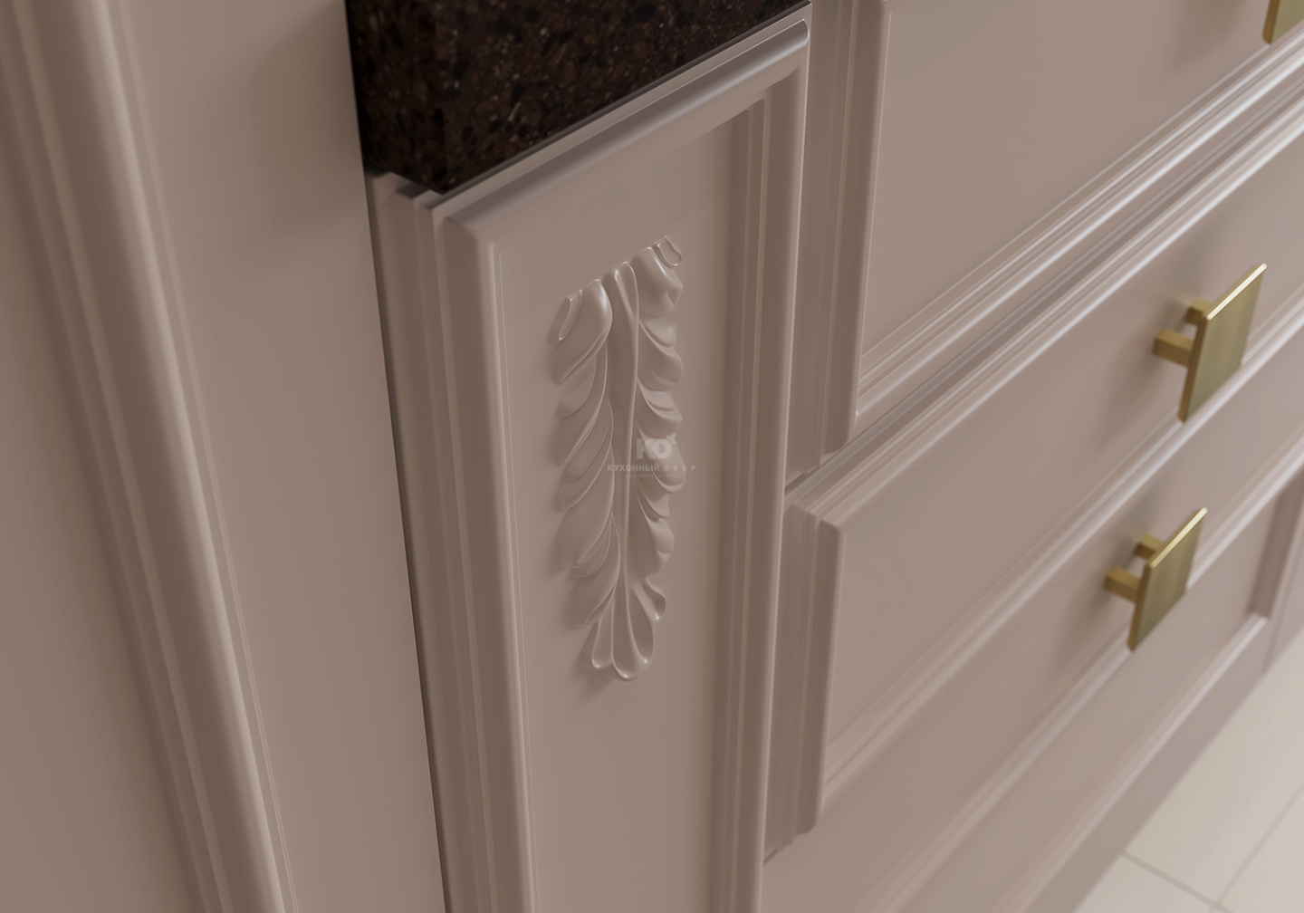 Только взгляните на искусную художественную фрезеровку фасадов в центральной зоне кухни и в основании острова! Как и стеклянная пирамида Лувра, эта фрезеровка одновременно выделяется на фоне окружающих элементов, и сочетается с ними. Форма фрез явно отсылает к модерну, тогда как остальные детали «Астрид» больше тяготеют к классическому стилю. Утончённые пилястры, изящная лицевая фурнитура и фасады с декоративными молдингами – явный реверанс в сторону классики.