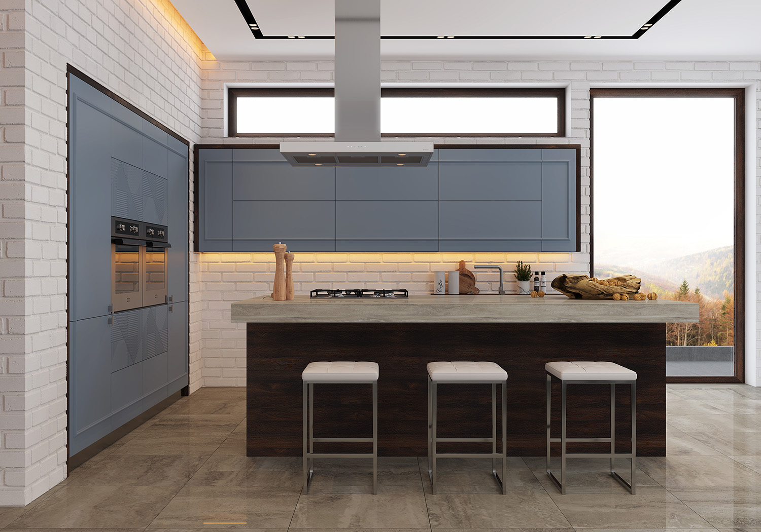 Подчеркнуть и дополнить столь нетривиальную внешность призваны корпуса и столешница, выполненные в единой цветофактуре под дерево. Окаймляя фасады словно рамка картины, они придают «Астрид» окончательный, завершённый вид. А минималистичная вытяжка и контрастная столешница в обеденной зоне – финальный штрих, вносящий нотку модерна в благородный неоклассический облик.