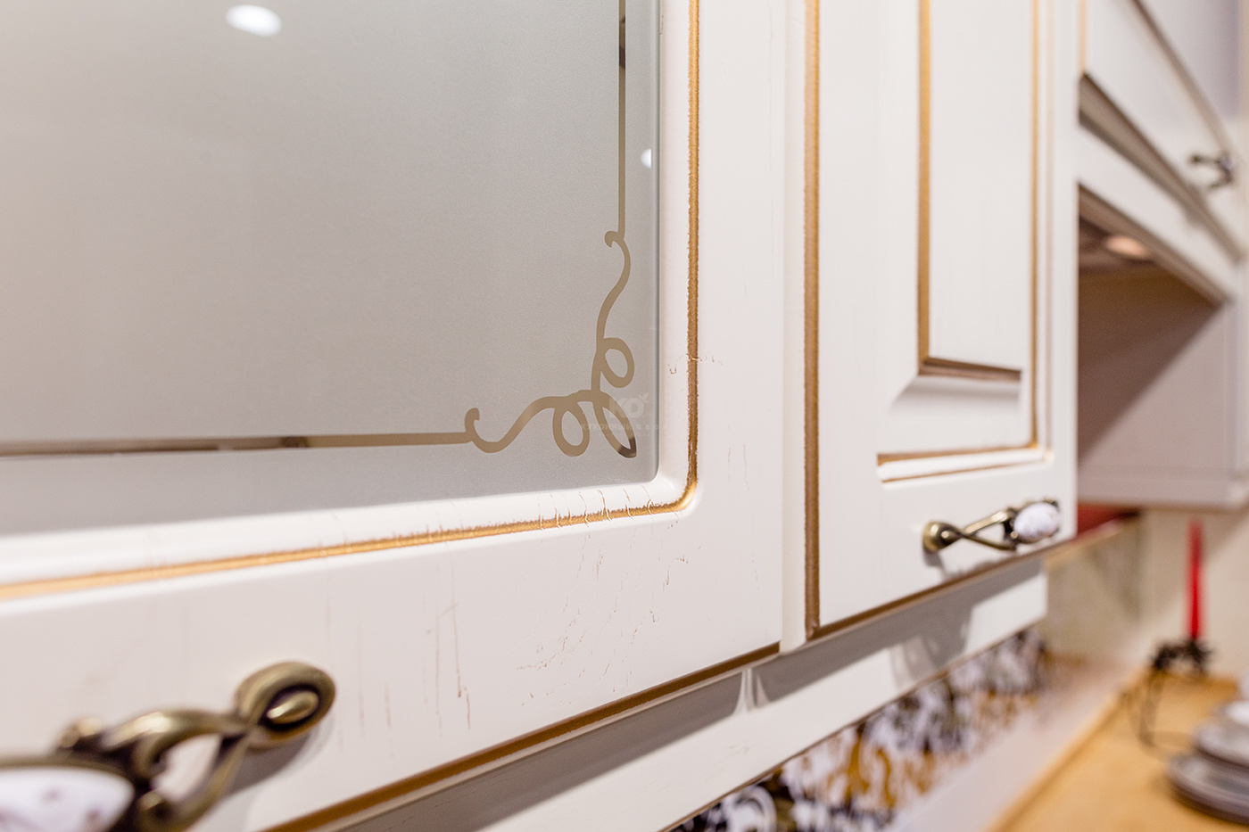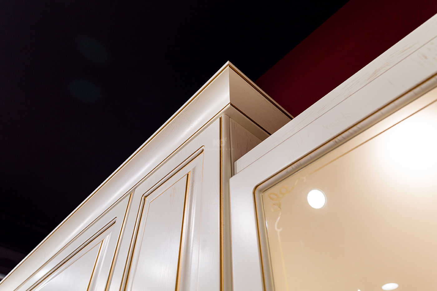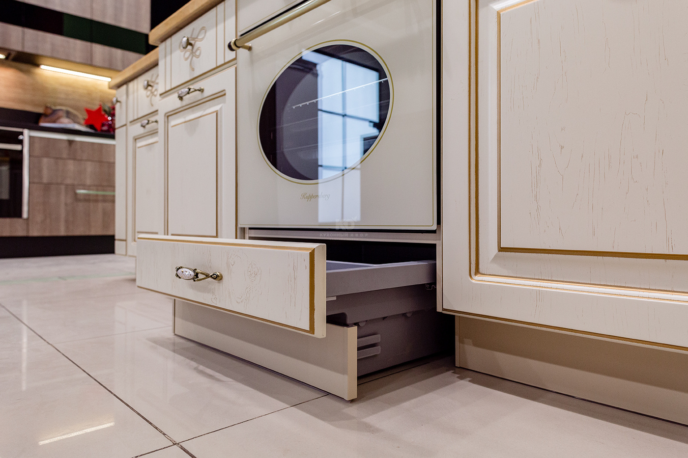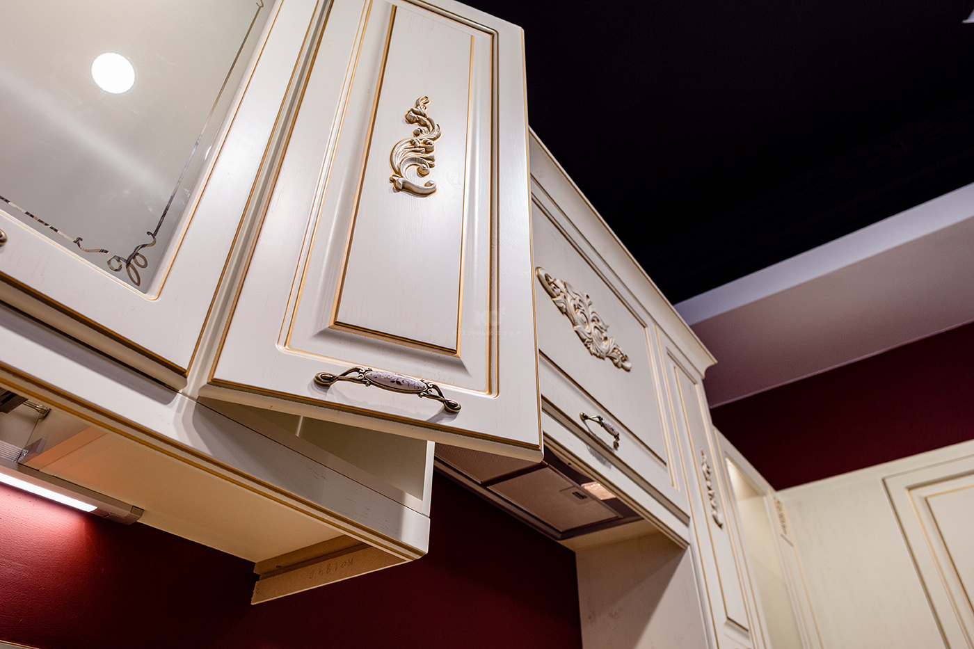 Фасады кухни изготовлены из МДФ и покрыты экомембраной, которая безукоризненно имитирует фактуру натурального дерева — беленого дуба. Классическая фрезеровка фасадов украшена патиной, которая, как благородная седина, придает любому образу некую таинственность. Эффектно смотрятся декоративные вензеля на фоне фигурных стильных ручек. Индивидуальная особенность модели — верхние фасады со стеклом, стилизованные под антресоли. Буазери, расположенные по бокам центрального элемента кухни, выполнены из того же материала, что кухня и «увенчаны» легкими открытыми полочками. Как нотки на нотном стане, развешены на рейлингах кухонные мелочи. Бытовая техника занимает отдельную просторную нишу — она размещена за глухими фасадами большого кухонного шкафа. «Катарина» — кухня, которая может стать стилистическим акцентом любого интерьера. Светлая цветовая гамма визуально увеличит небольшое помещение, а в просторном во всей красе покажет «микс» современных этюдов на классическую тему.