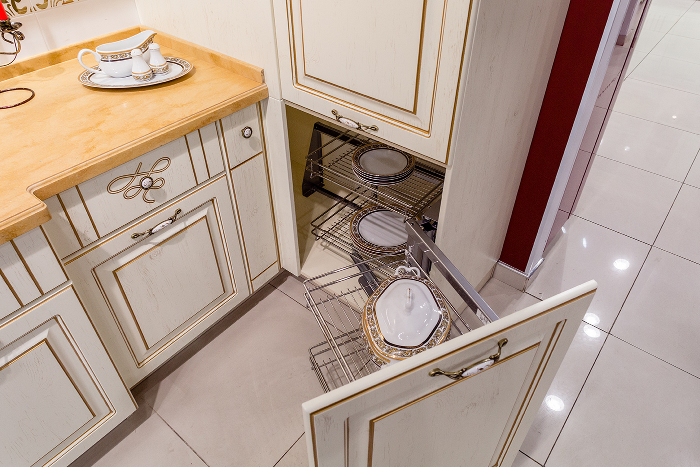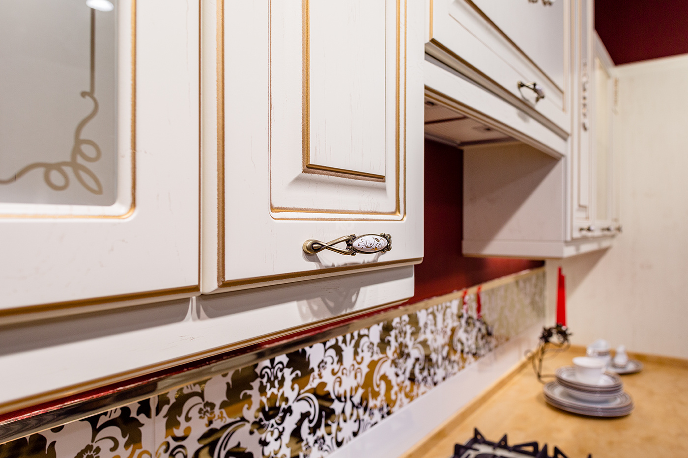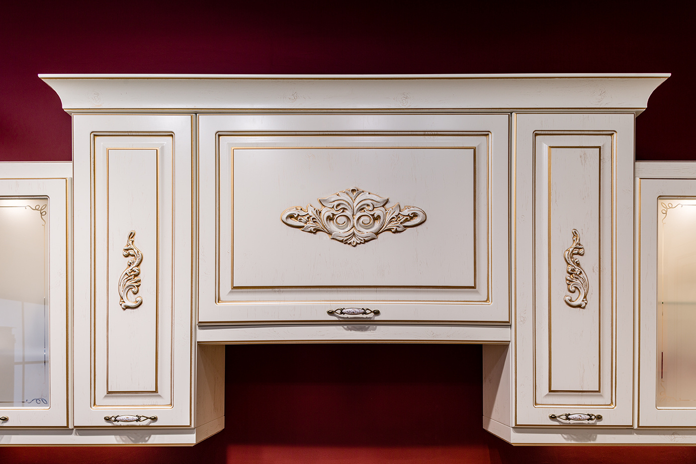 Фасады кухни изготовлены из МДФ и покрыты экомембраной, которая безукоризненно имитирует фактуру натурального дерева — беленого дуба. Классическая фрезеровка фасадов украшена патиной, которая, как благородная седина, придает любому образу некую таинственность. Эффектно смотрятся декоративные вензеля на фоне фигурных стильных ручек. Индивидуальная особенность модели — верхние фасады со стеклом, стилизованные под антресоли. Буазери, расположенные по бокам центрального элемента кухни, выполнены из того же материала, что кухня и «увенчаны» легкими открытыми полочками. Как нотки на нотном стане, развешены на рейлингах кухонные мелочи. Бытовая техника занимает отдельную просторную нишу — она размещена за глухими фасадами большого кухонного шкафа. «Катарина» — кухня, которая может стать стилистическим акцентом любого интерьера. Светлая цветовая гамма визуально увеличит небольшое помещение, а в просторном во всей красе покажет «микс» современных этюдов на классическую тему.