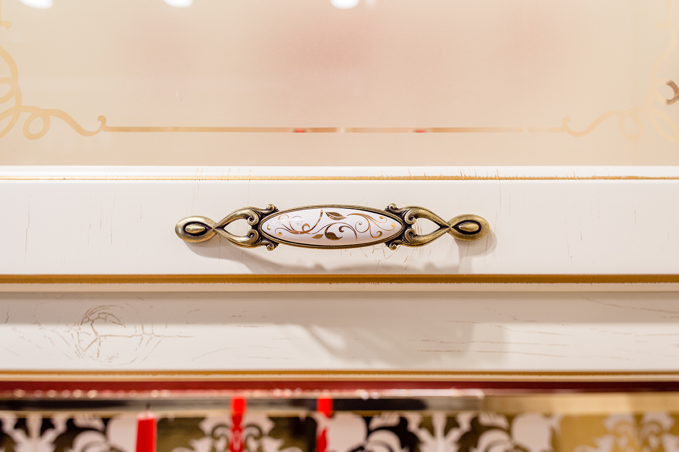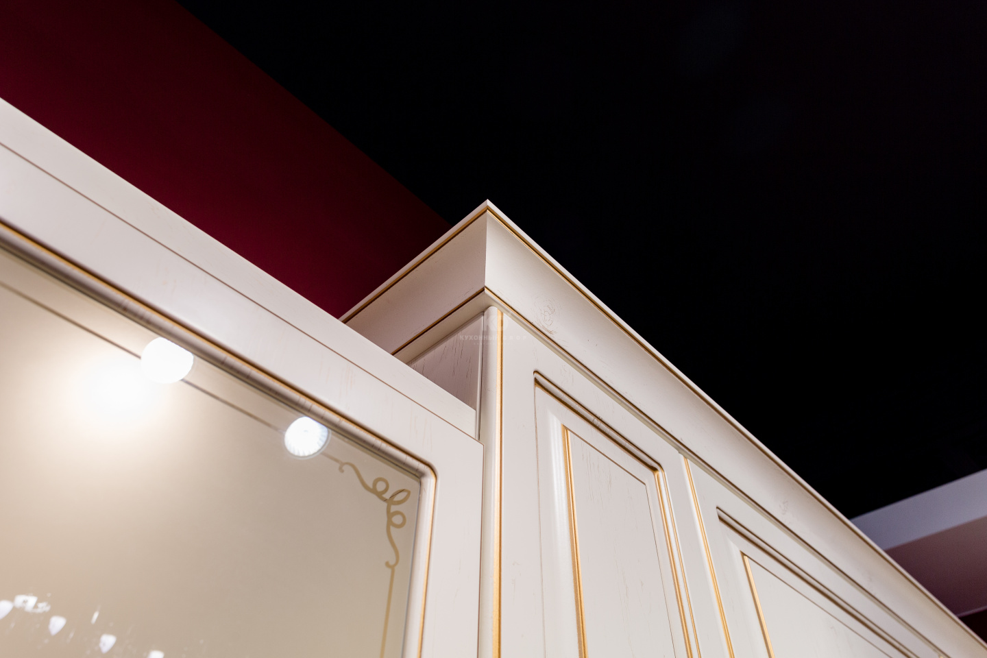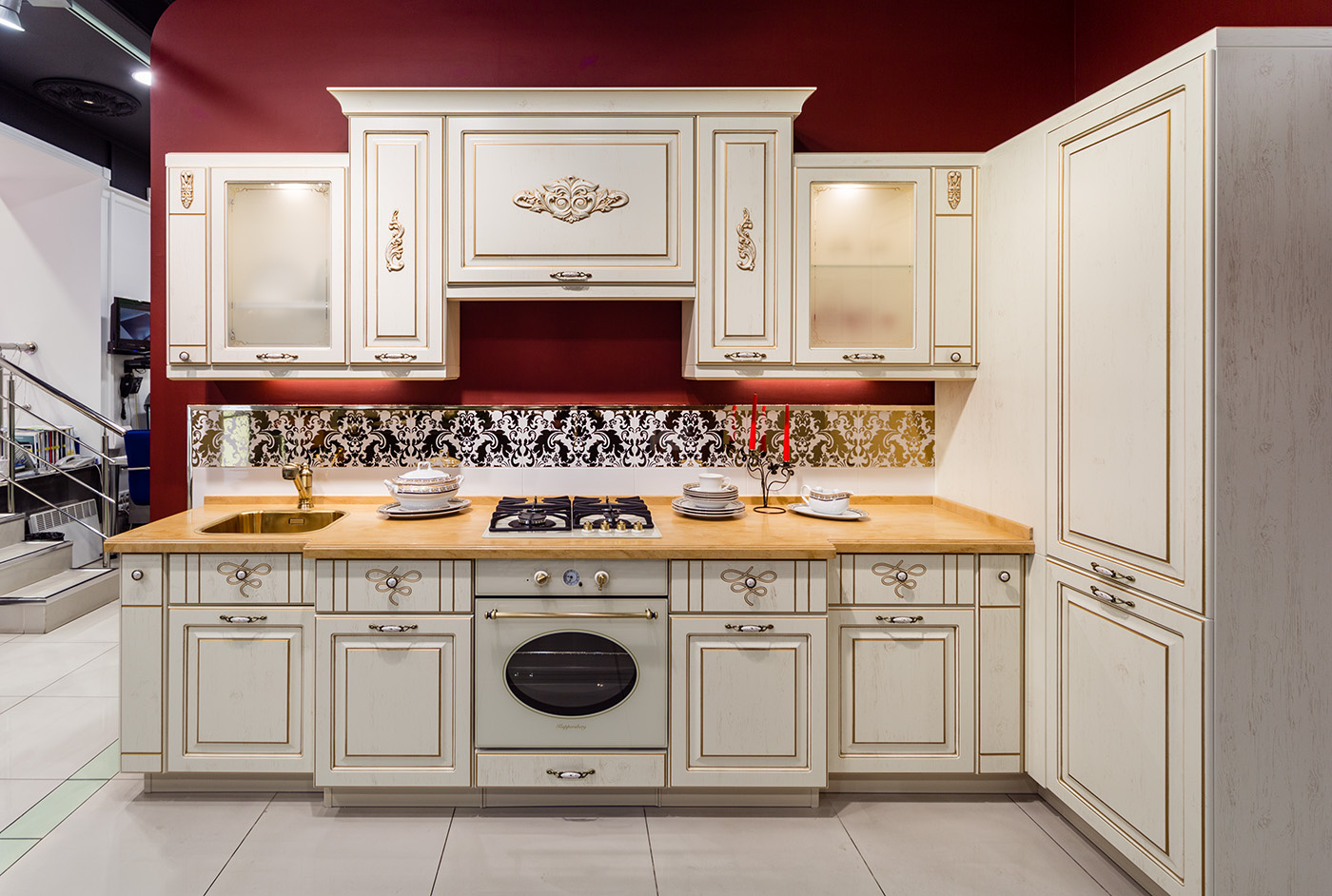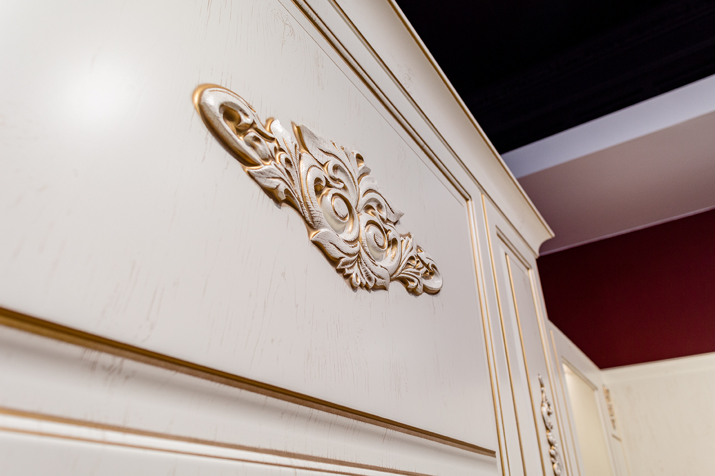Фасады кухни изготовлены из МДФ и покрыты экомембраной, которая безукоризненно имитирует фактуру натурального дерева — беленого дуба. Классическая фрезеровка фасадов украшена патиной, которая, как благородная седина, придает любому образу некую таинственность. Эффектно смотрятся декоративные вензеля на фоне фигурных стильных ручек. Индивидуальная особенность модели — верхние фасады со стеклом, стилизованные под антресоли. Буазери, расположенные по бокам центрального элемента кухни, выполнены из того же материала, что кухня и «увенчаны» легкими открытыми полочками. Как нотки на нотном стане, развешены на рейлингах кухонные мелочи. Бытовая техника занимает отдельную просторную нишу — она размещена за глухими фасадами большого кухонного шкафа. «Катарина» — кухня, которая может стать стилистическим акцентом любого интерьера. Светлая цветовая гамма визуально увеличит небольшое помещение, а в просторном во всей красе покажет «микс» современных этюдов на классическую тему.
