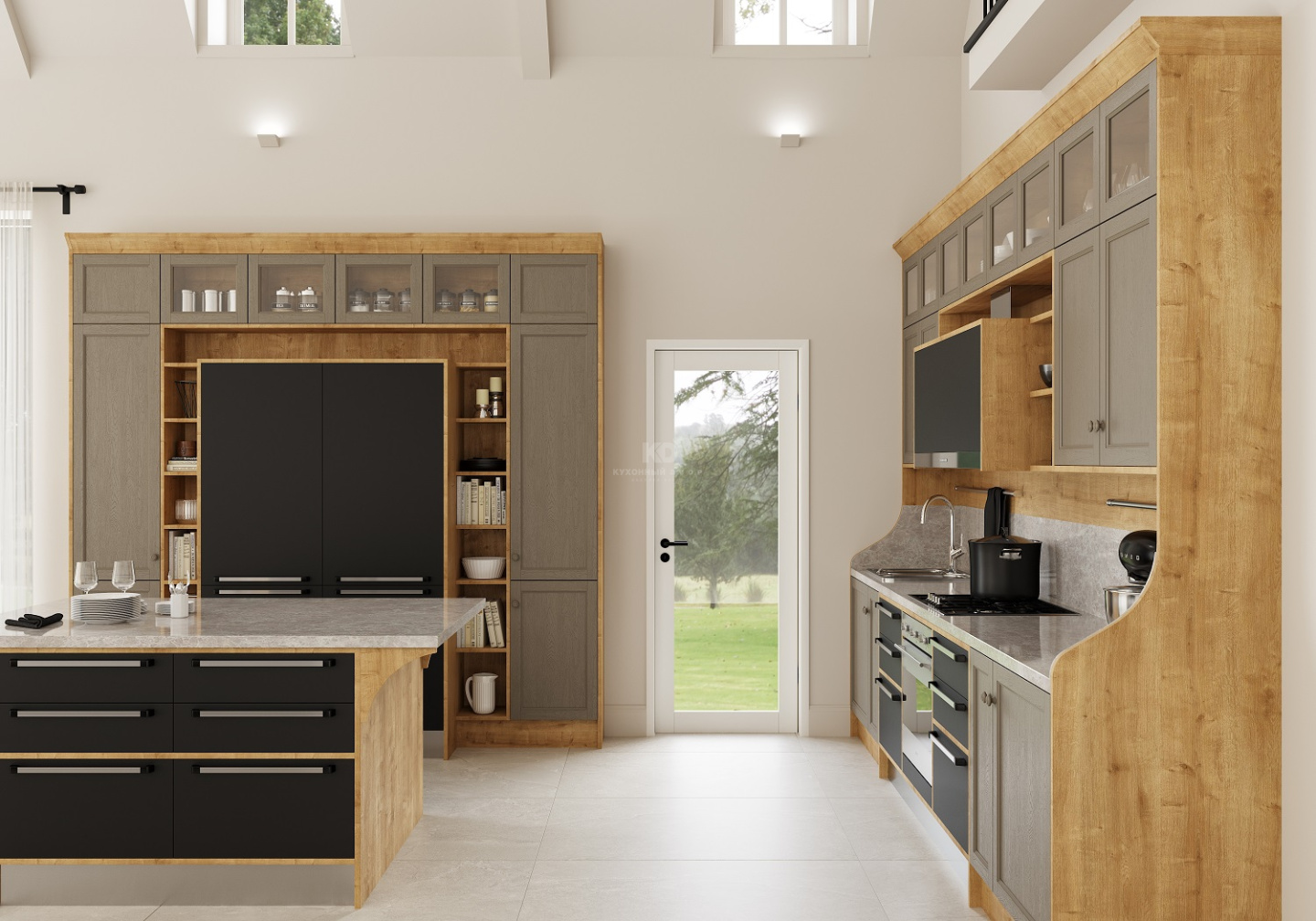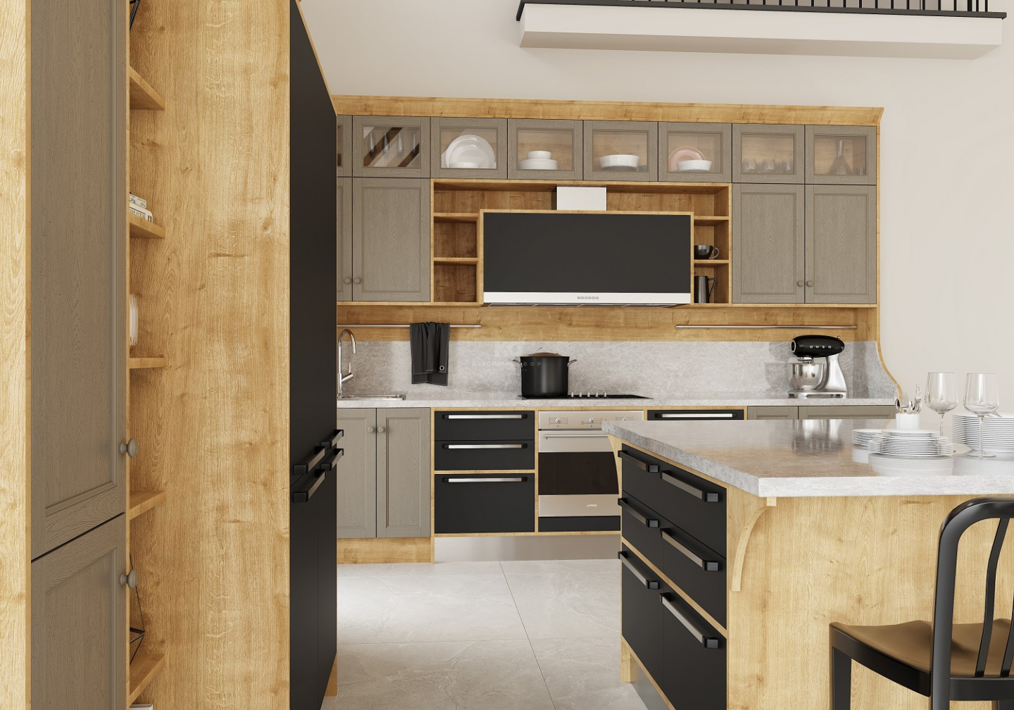 Оригинальность и колорит – это про «Хельгу»! Ее образ мысленно отсылает нас к добротной мебели американских салунов времен Дикого Запада. Эта кухня наполнена таким же шармом, свободой и тягой к смелым решениям. «Хельга» создана с использованием роскошного шпона дуба. В ней прекрасно сочетаются классические рамочные фасады и абсолютно гладкие фасады в стиле «модерн». Взгляните, сколь обворожительна эта комбинация, особенно если цвета подобраны со знанием дела. Благородный «табачный» отлично смотрится в паре с чарующим графитовым, не так ли?