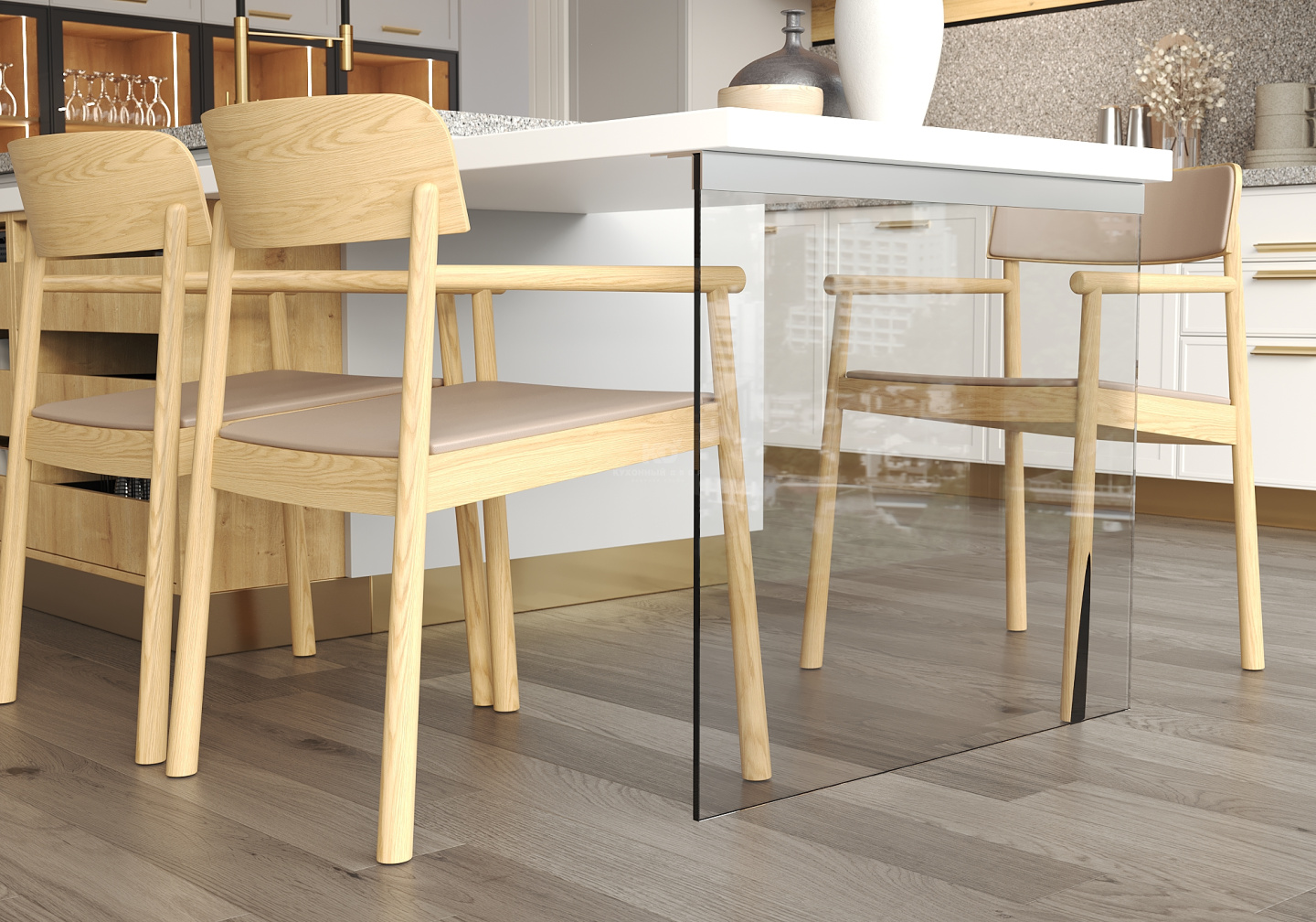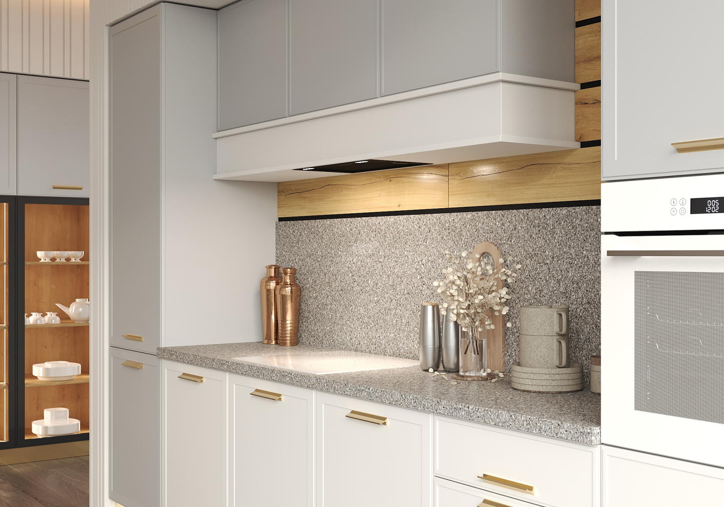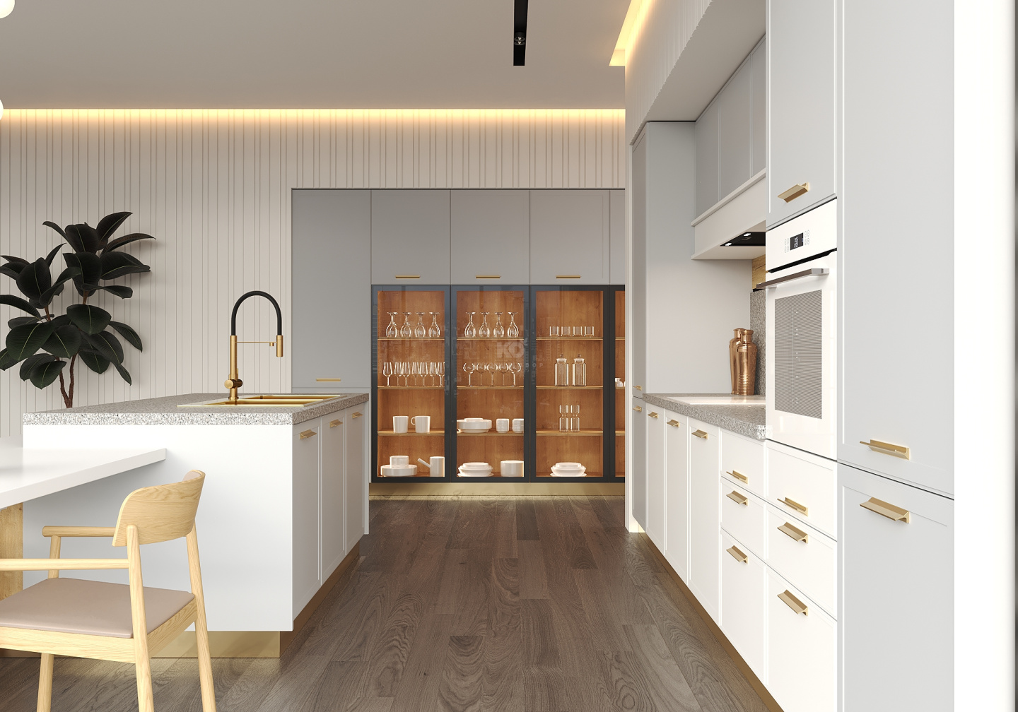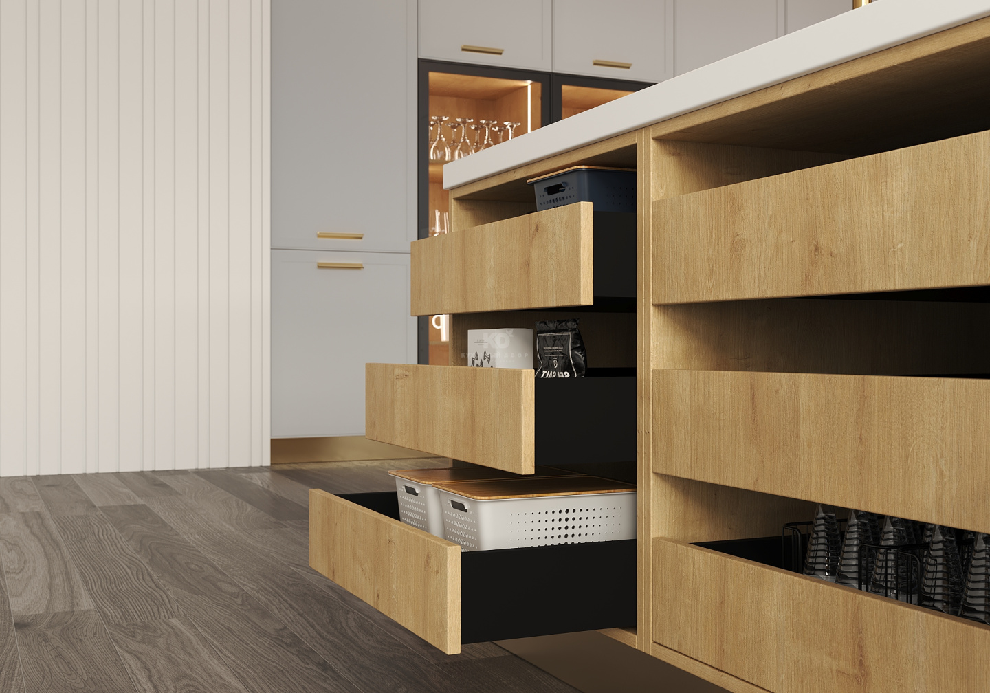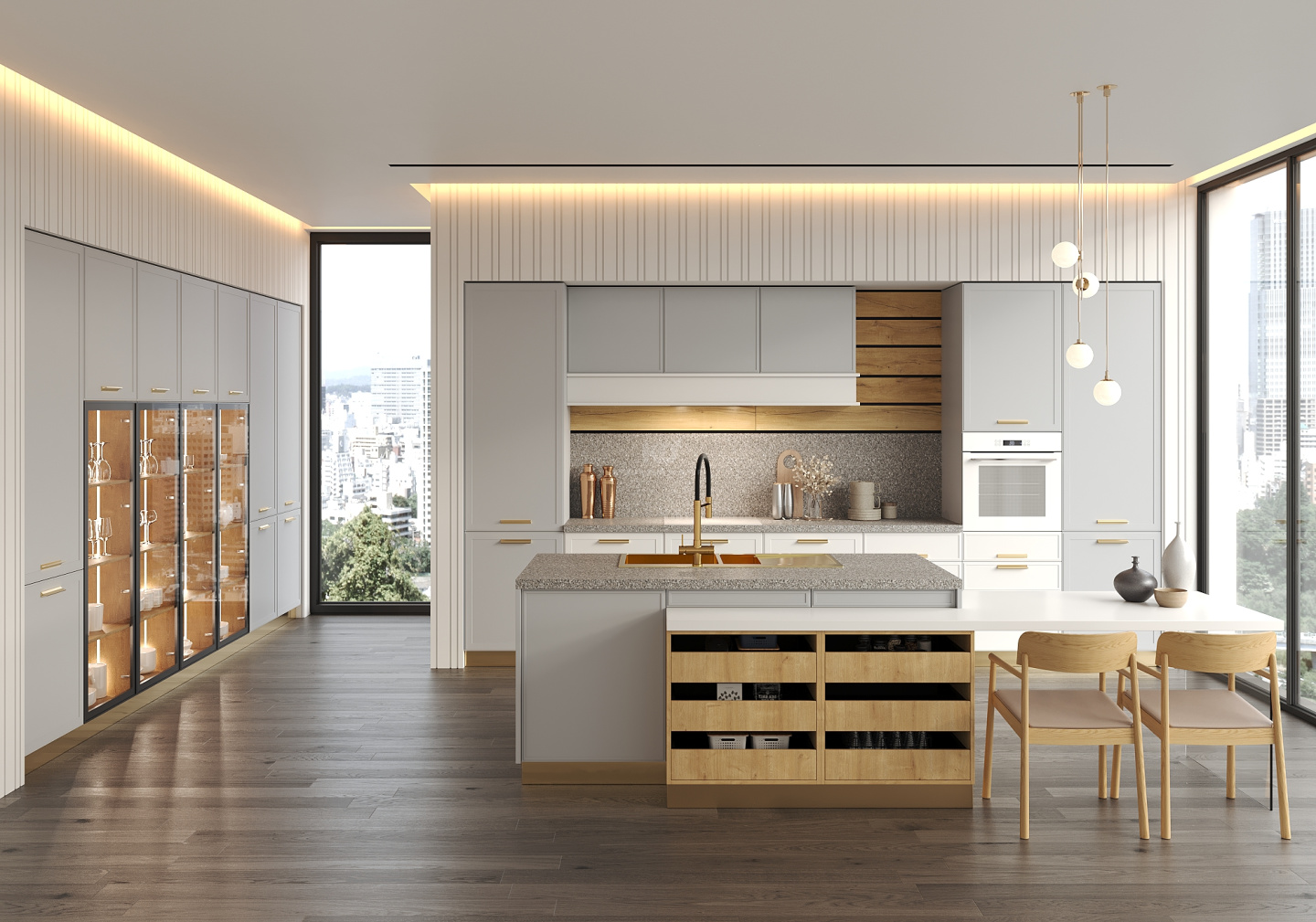 Дизайнеры предлагают поддержать ритм линий, заданных ящиками открытого стола, оформлением стены похожими панелями в районе кухонного фартука. Обращает на себя внимание и подвесная нижняя обвязка под верхними полками, выполненная в цвете фасадов нижних модулей.