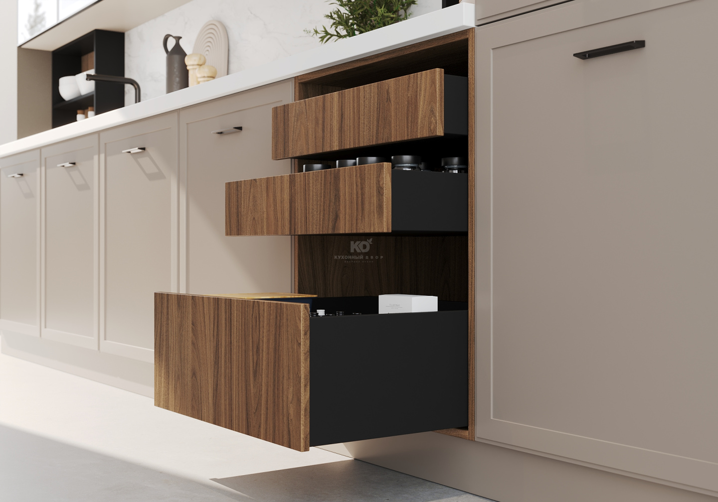 Фасады модели производятся из МДФ и покрываются экомембраной по особой запатентованной технологии 3D-окутывания, которая обеспечивает не только безупречный внешний фасадам, но и прекрасные эксплуатационные характеристики. А надежная фурнитура от мировых брендов обеспечивает возможность хранения всей домашней утвари, запасов и десятки тысяч открываний фасадов.