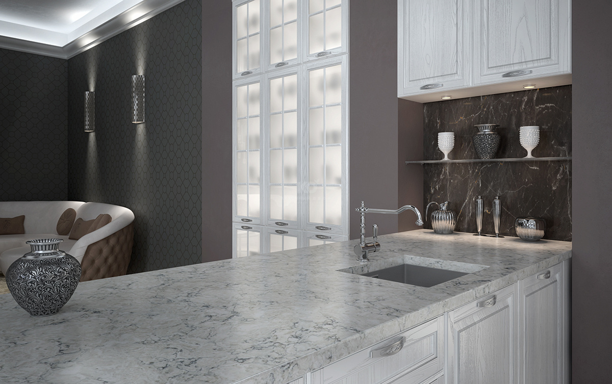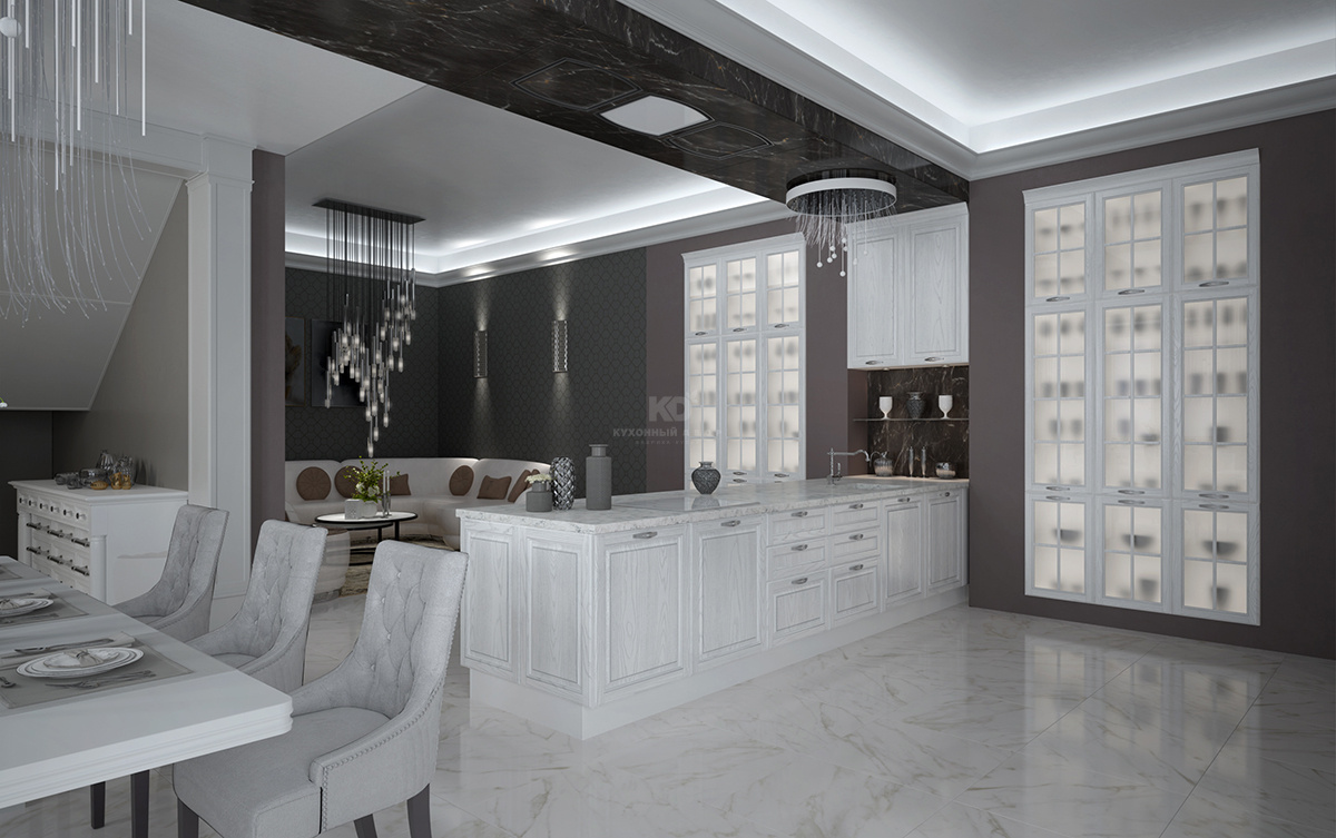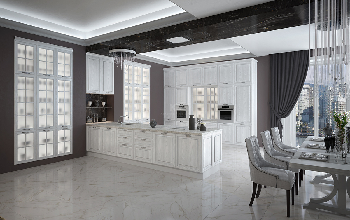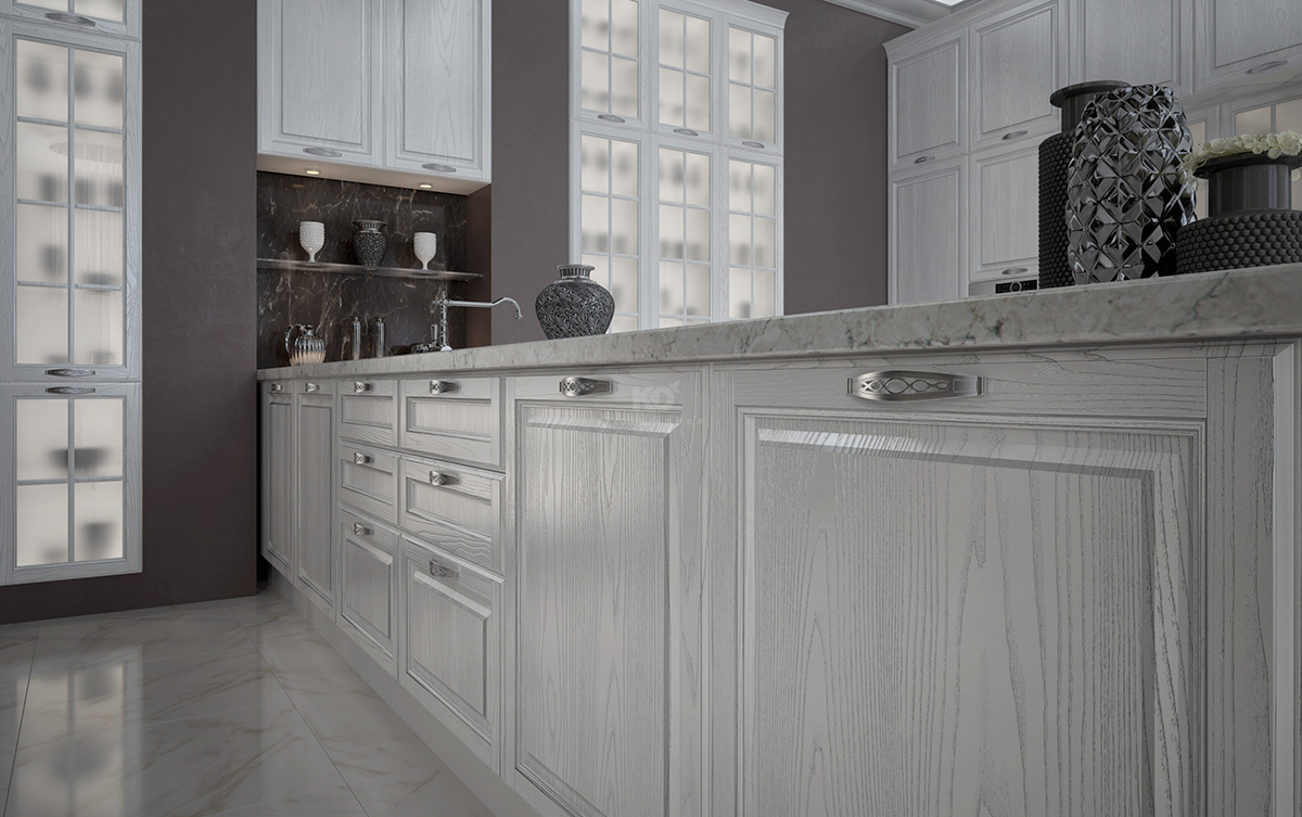 Фасады «Виконта» изготовляются из массива натурального дуба. Они бесподобно смотрятся в лёгком, словно предрассветная дымка, белом цвете с серебристой патиной. Фасады украшает красивая классическая филёнка и элегантные посеребрённые ручки с тонким кружевом. Чистоте и лёгкости линий вторят и матированные витражи высоких, интегрированных прямо в стены буфетов. Присмотритесь внимательно к получившемуся образу. Это просто отличная кухня? Нет, это нечто намного большее!