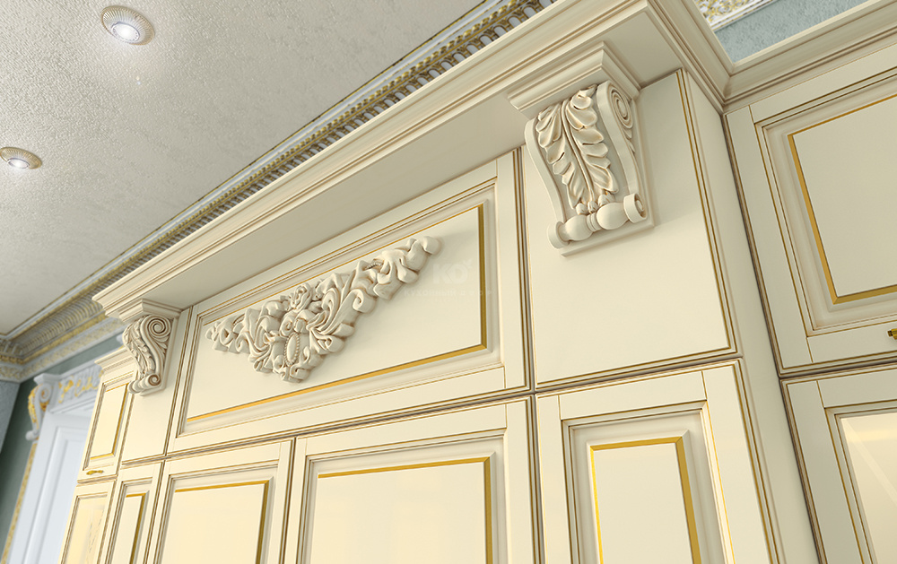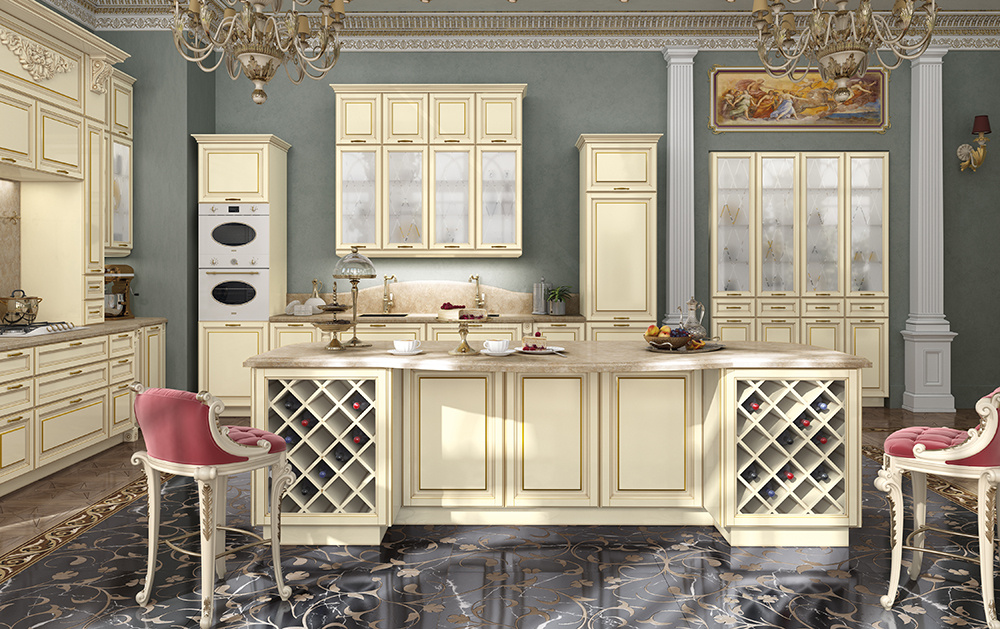 Эта торжественная и помпезная модель ванильной кухни с золотой патиной в дворцовом стиле словно досталась в наследство от предков королевских кровей. Резные архитектурные элементы, золотая патина на ванильных фасадах из массива бука, - каждая деталь кухонного гарнитура подчеркивает выбранный стиль. Данная классическая ванильная кухня с золотом ярко демонстрирует новые элементы мебели, а именно винотеку.