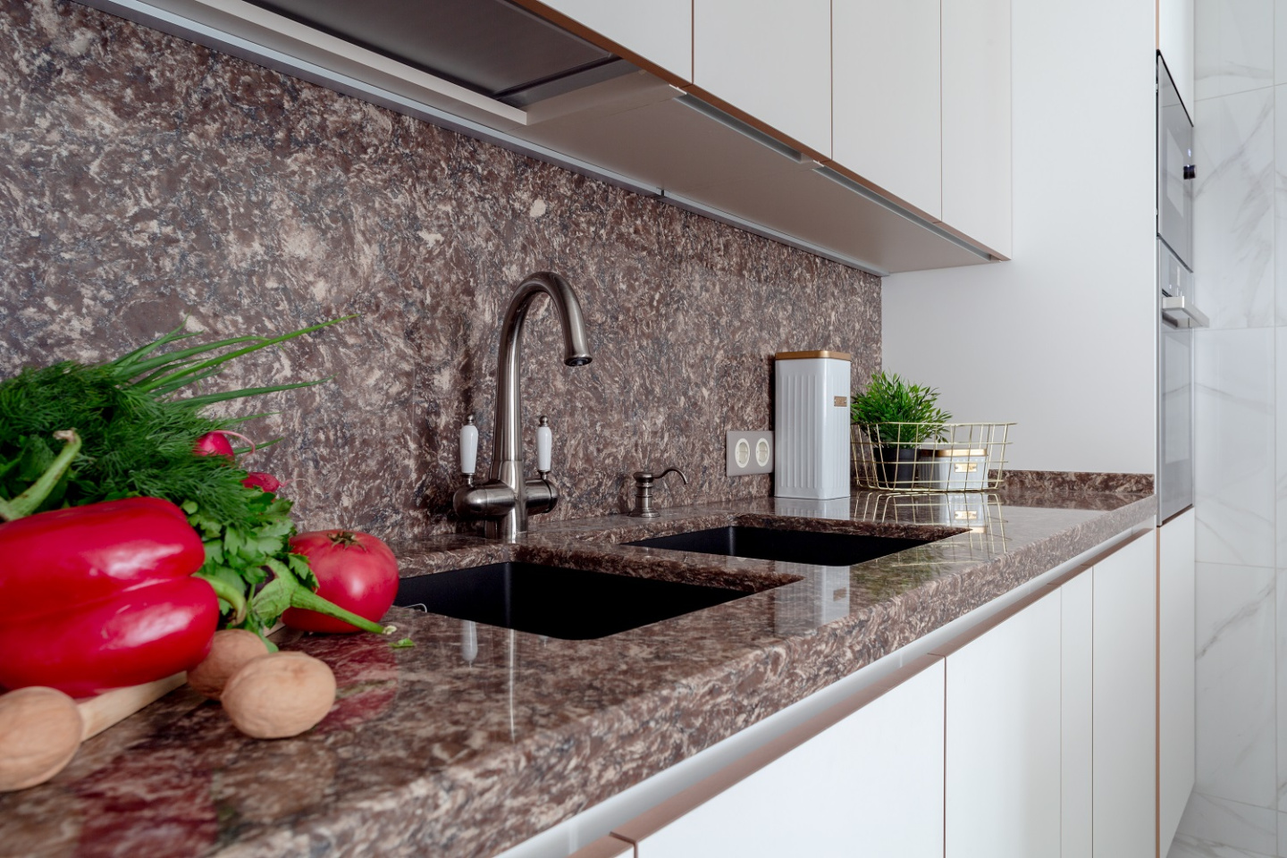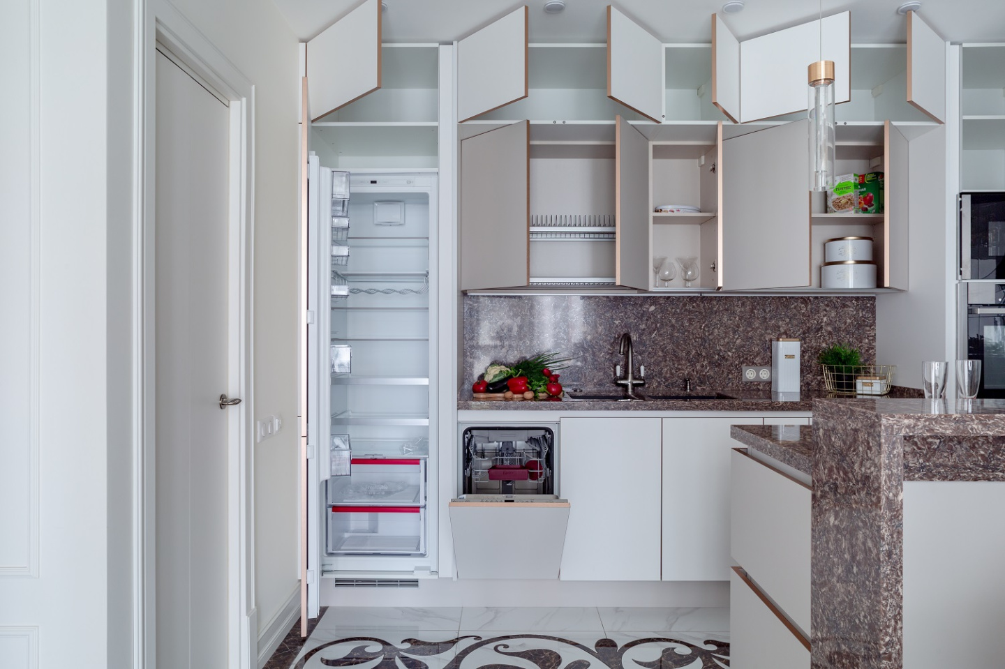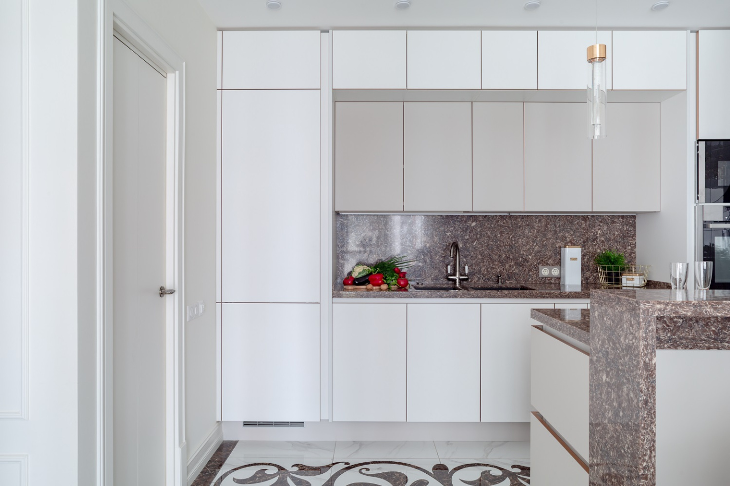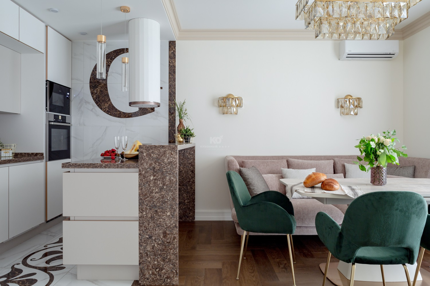 • Магия камня. Как одновременно выделить нежность матовых фасадов и величественный блеск золотых кромок? Добавить камня! Барная стойка, рабочие поверхности и фартук здесь выполнены из натурального кварца. Этот великолепный материал прекрасно справляется с ролью связующего звена для разных зон интерьера!