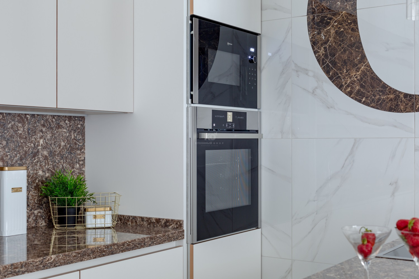 Перед Вами эксклюзивная версия кухни «Ханна Стил» – плод совместного творчества бренда «Кухонный Двор» и дизайнера Натальи Апухтиной. Наталья всегда старается подарить своим клиентам нечто уникальное, а КД разделяет это стремление! В нашем совместном проекте мы соединили притягательность фасадов «Extra Touch Matt», эффектный блеск золотых кромок, роскошь каменных поверхностей и уникальную систему открывания «Space Line». Каждая из этих деталей делает кухню особенной!