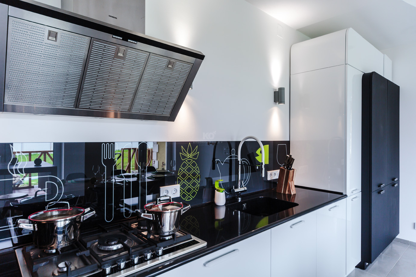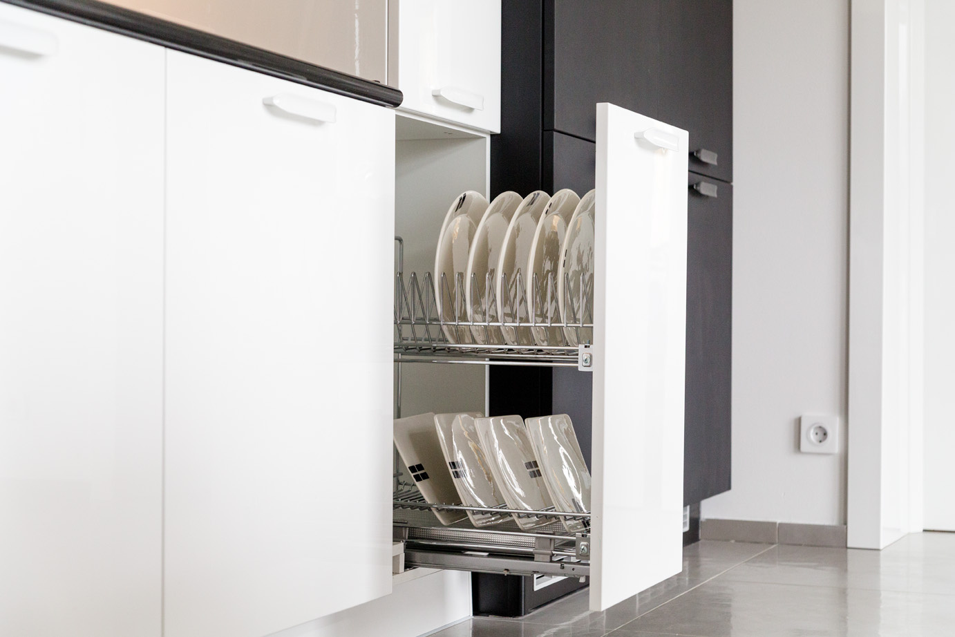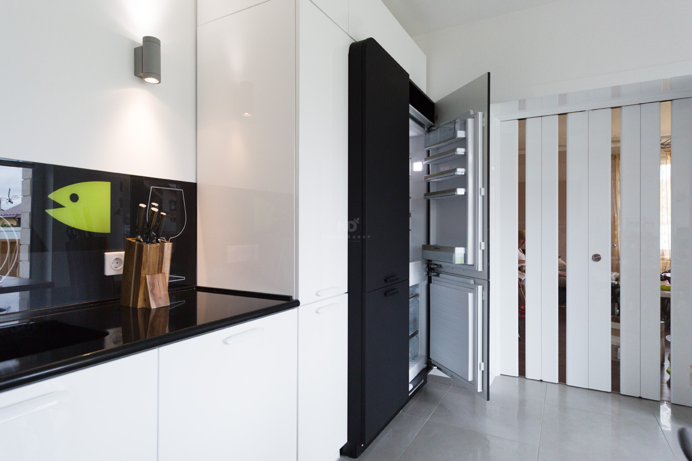Белые фасады почти сливаются со стенами, и на первый план выходят черные: они расположены в разных частях комнаты, а столешница – своеобразный мостик между ними. Гарнитур не выглядит строгим благодаря скругленным формам. Все шкафчики глубокие – 58 см. Корпуса сделаны из ламинированной ДСП, фасады – из MDF, сверху нанесена эмаль, все дверцы оснащены доводчиками для бесшумного закрывания.Основная рабочая зона находится между двумя высокими шкафами для хранения продуктов и встроенной техники. В шкаф, расположенный параллельно столешнице, встроены два холодильника и выкатная колонна для сухих продуктов. Под рабочей поверхностью – посудомоечная машина, сушилка для посуды и эргономичные выдвижные ящики для хранения столовых приборов и тарелок разного размера. Они оснащены удобными металлическими и деревянными держателями.Белый шкаф, расположенный ближе к окну, открывается с торца и состоит из ящика для мелочей и выкатного ящика для бутылок. Над ними – полка с открытыми нишами, где можно, например, хранить мобильные устройства и подзаряжать их.