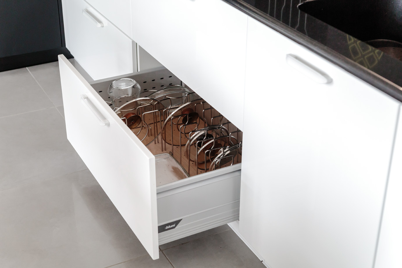 За черными распашными дверцами верхнего яруса скрываются полки для посуды, а центральные пеналы безраздельно принадлежат современной бытовой технике. «Мертвая» зона в углу кухни тоже задействована – ящики с выдвижной арматурой превращают ее в полезное пространство для хранения.
