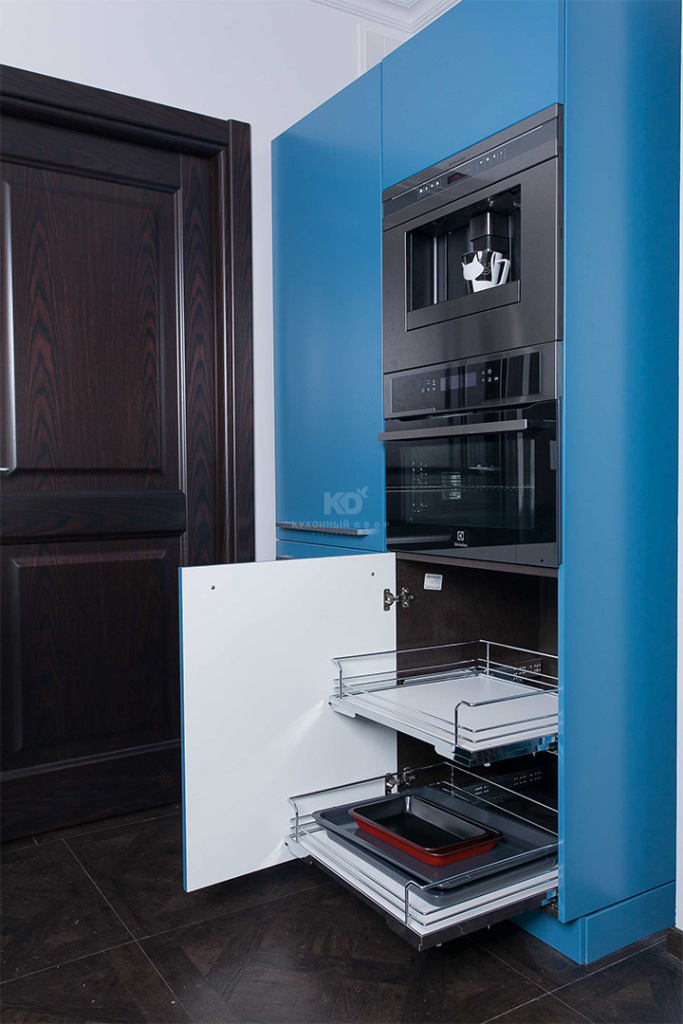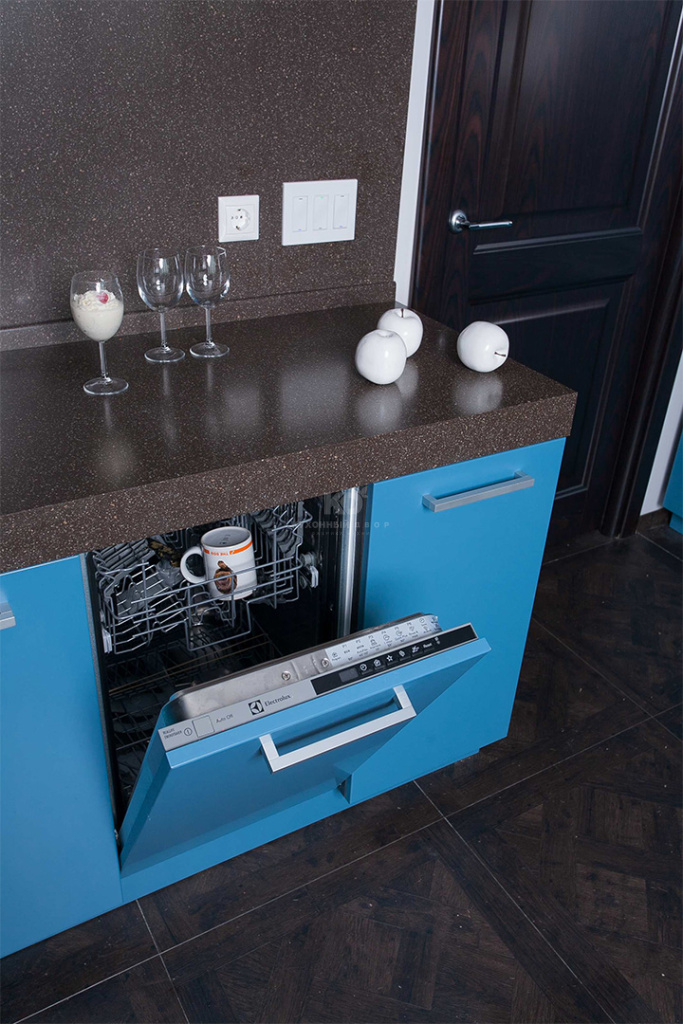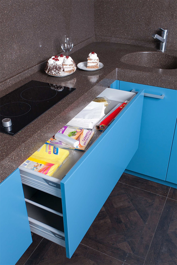 Помещение, пусть даже и сложно оформленное, все равно лишь оправа достойной мебели. Чтобы кухня стала единой геометрической фигурой, нижние модули пришлось сделать уже, а верхние шире чем обычно — только так удалось добиться, чтобы нижние ящики переливались в верхние и являлись продолжением друг друга. Всю эту конструкцию не поставили на пол, а прикрепили к стене так, чтобы создавалась иллюзия парения в воздухе. Строгость мебели ограничивается лишь внешним видом. Можно сказать, это — кухня будущего! Дизайнер проекта решила сделать из искусственного камня всю рабочую поверхность кухни: и фартук, и столешницу. Благодаря пластичности, камню можнопридавать совершенно невообразимую форму. Из него можно делать мебель, светильники, раковины и все остальное, на что только хватит фантазии.