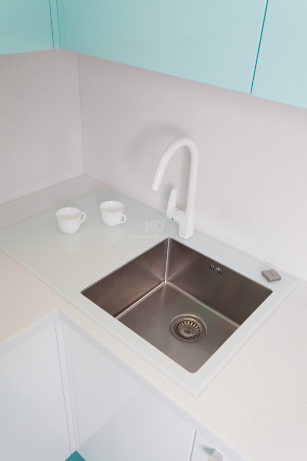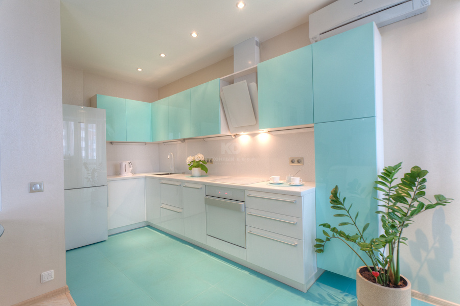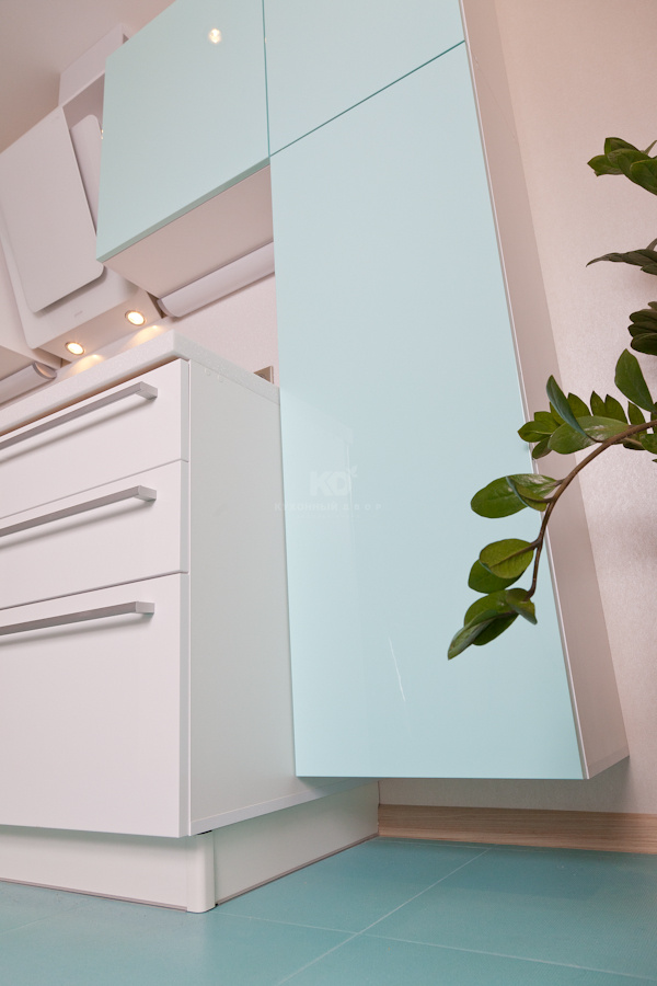 Голубой гармонично сочетается со многими оттенками цветовой палитры. Это открывает широкие возможности при проектировании дизайн-проекта. Если в чистом виде оттенок может показаться слишком холодным, то в сочетании с другими оттенками он преображается. Идеальным компаньоном выступает белый, с подобными фасадами голубая кухня выглядит ярко и стильно.