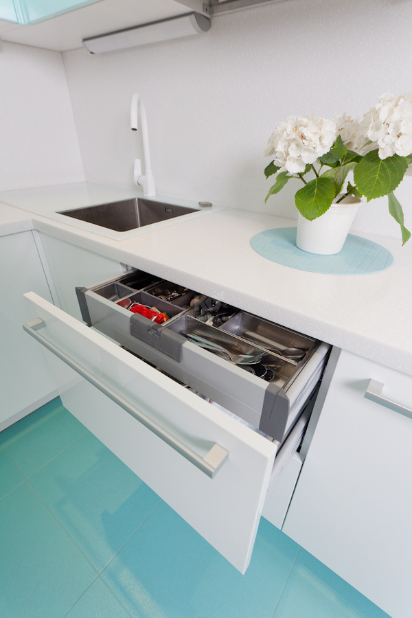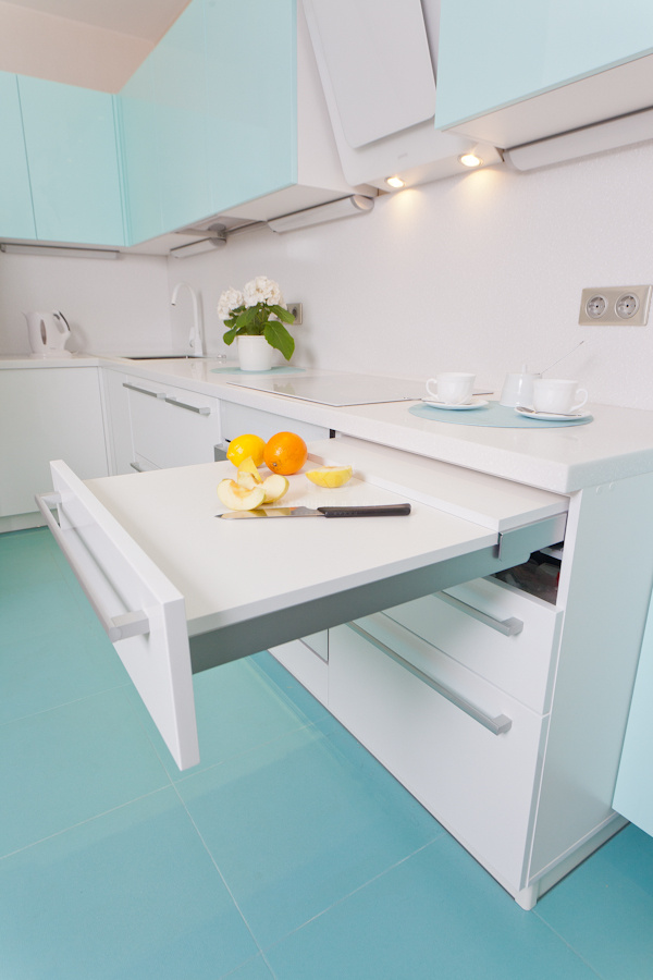 Для того, чтобы цвет выглядел наиболее выразительно, используется глянцевое покрытие фасадов. Они отражают свет и расширяют пространство кухни. А для того, чтобы ничего не отвлекало от их великолепного блеска, предусмотрена современная фурнитура. Наличие дверных ручек перестало быть обязательным, теперь достаточно одного касания для того, чтобы получить доступ к содержимому шкафа или ящика.