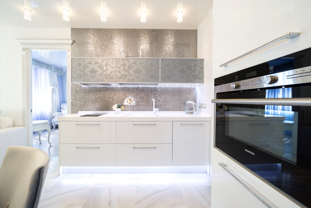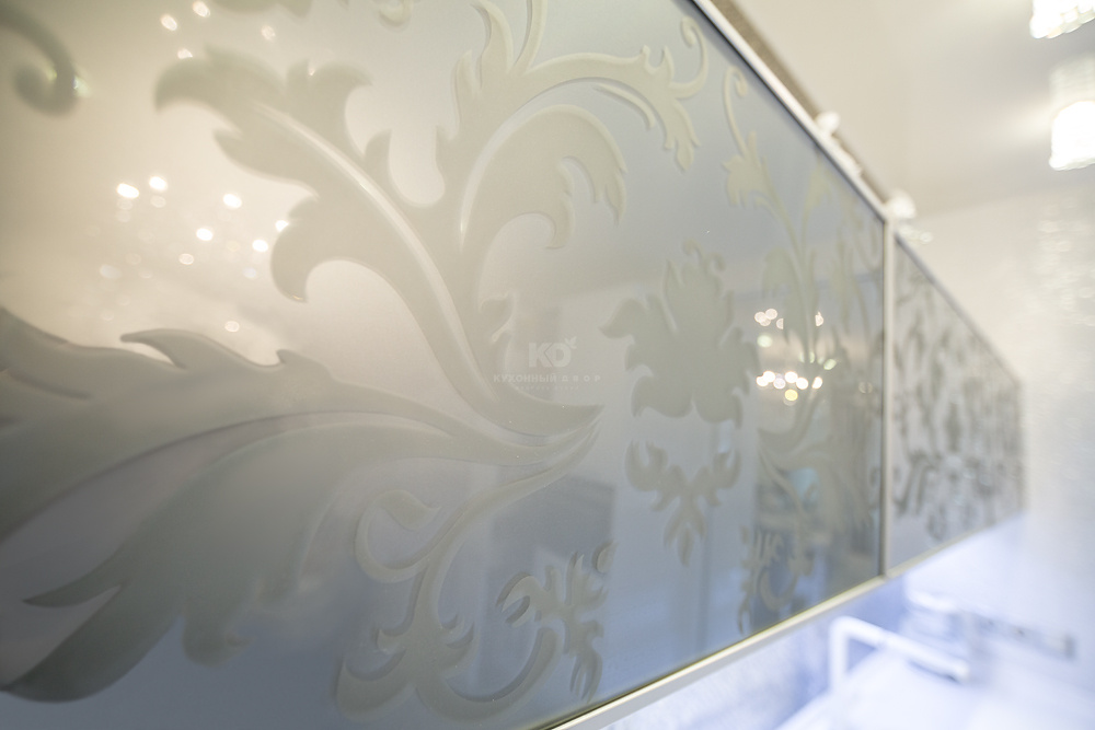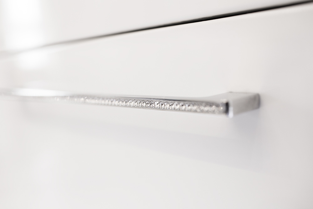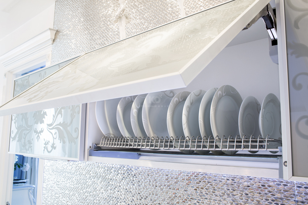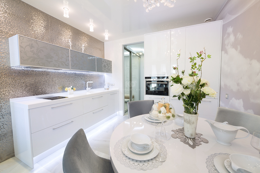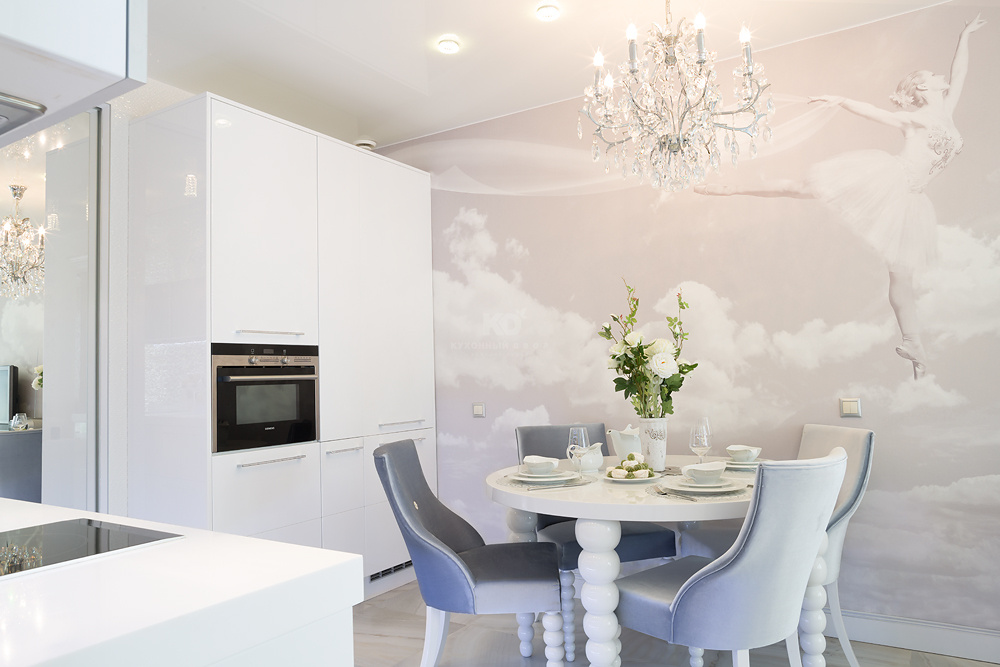 Хозяева квартиры сделали выбор в пользу элегантной, изысканной и современной модели «Фаворит» в белом варианте исполнения. Интересно, что именно цвет является основным выразительным элементом декора данного интерьера. Безусловный авторитет белого не случаен: дочь хозяйки квартиры не представляет своей жизни без танца, а как известно, король танца — балет, ассоциирующийся с белоснежными пачками, пуантами... Фреска на стене изображением дочери Инны Григорьевны подчеркивает атмосферу, наполненную любовью к хореографии. Изящная и утонченная модель с тонкими современными чертами вдохновлена классическими образами для жизни в современном мире. Гарнитур укомплектован совершенными системами открывания, выдвижения и хранения, все ящики оснащены доводчиками. Все элементы кухни максимально функциональны. Фасады гарнитура глухие, гладкие, без фрезеровок. Тем не менее, о торжестве высокого стиля напоминают ручки, инкрустированные стразами Swarovski. Еще один шикарный акцент — панно из золотой плитки над рабочей зоной с белоснежной столешницей. Подсветка цоколя рабочей зоны эффектно подчеркивает чистоту цвета и фактуры.