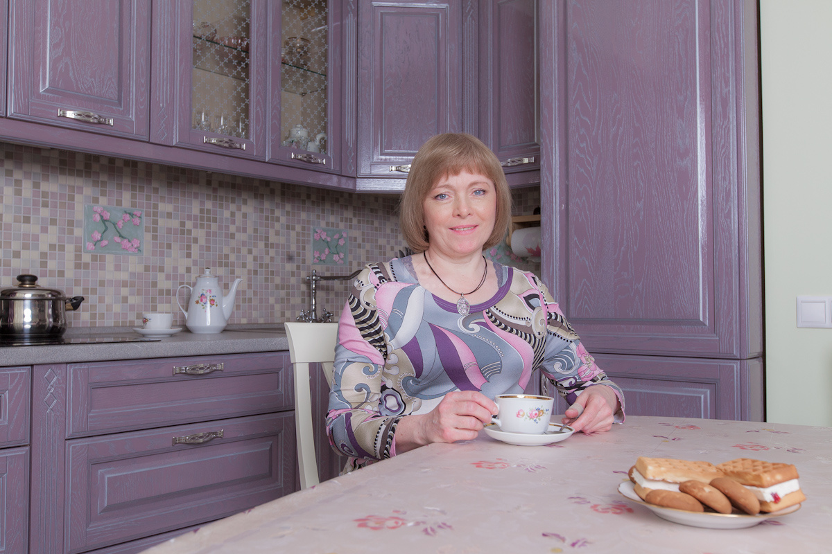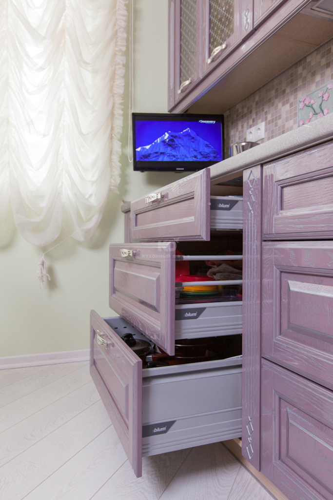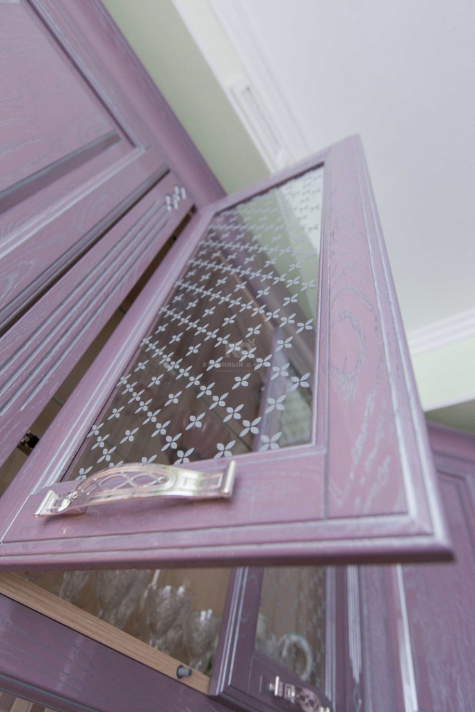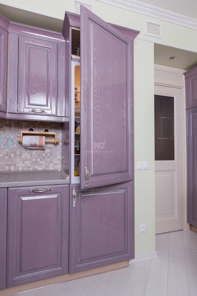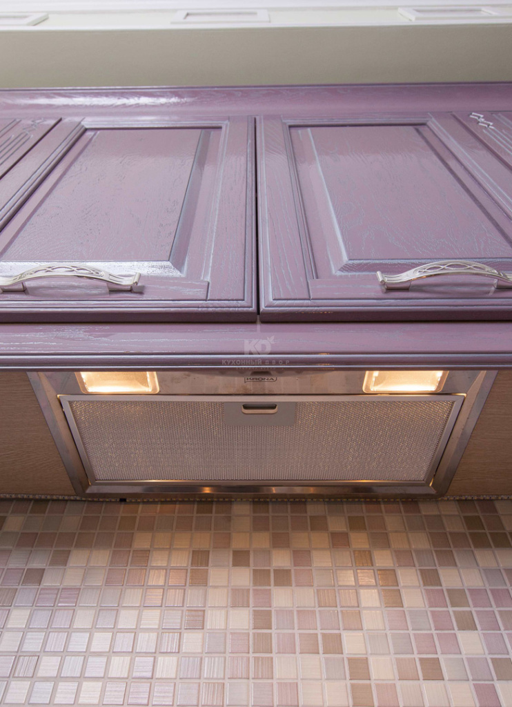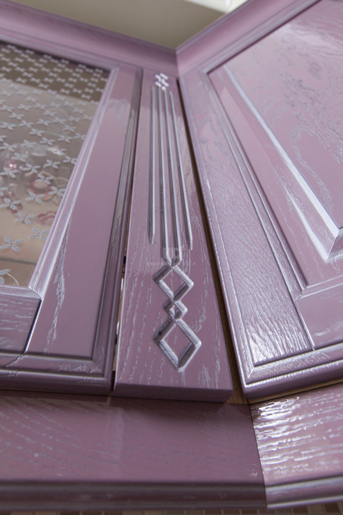 Изящный теплый лиловый цвет, создан благодаря смешению шоколадного, розового и серебряного оттенков и является настоящей сенсацией для коллекций классических кухонь. Для кого-то он ассоциируется с самым вкусным домашним какао, для кого-то — с цветущей орхидеей, а может быть это просто самый модный романтичный оттенок в богатой палитре красок жизни. Безусловно, правы все! Кстати, авторство данного цвета принадлежит ведущему дизайнеру бренда «Кухонный Двор» Марии Сергее вой. Серебряная патина и глянцевый лак лишь подчеркнули совершенство фасадов из натурального дуба, покрытых оригинальной эмалью.