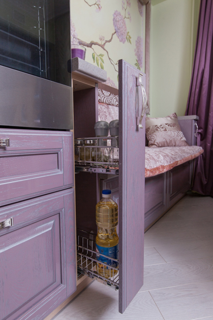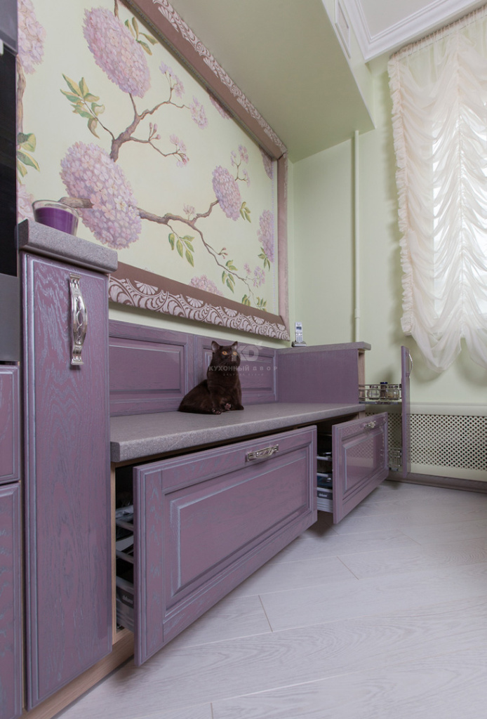 Данный проект был эксклюзив но разработан для участников теле проекта «Школа ремонта». В представленном интерьере на себя обращает особое внимание своеобразная зона отдыха. Высокие ящики, установленные в нижней части, бережно сохранят кастрюли и фигурные формы - важные инструменты заботливой хозяйки. Поверхность тумб изготовлена из натурального дерева очень практична в уходе. Безусловно, уникальные диванчики станут любимым местом отдыха не только хозяев и их гостей, но и пушистых питомцев.