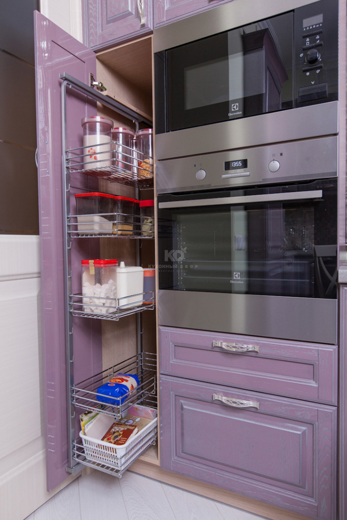 Использование удобного функционального наполнения, заботящегося об эргономике кухне, - фирменный почерк бренда «Кухонный Двор». Различные выкатные системы, разделители для столовых приборов и бутылочницы грамотно распределяют полезную площадь внутреннего убранства гарнитура. Мойка из нержавеющей стали, выдвижные ящики с доводчиками, здесь предусмотрена каждая мелочь, чтобы хозяйке на кухне было в радость готовить и делать заготовки.