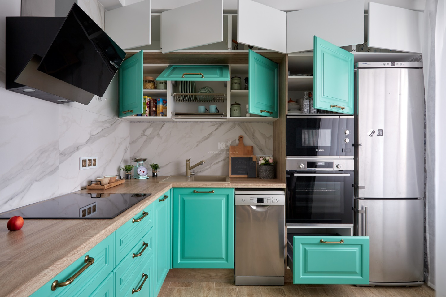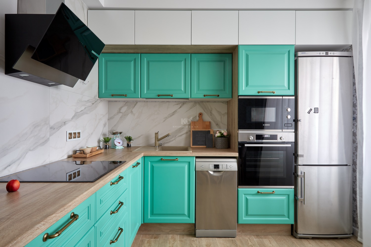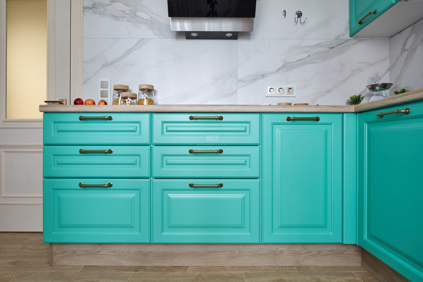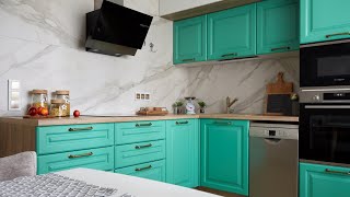 От кухни «Айвори» этому проекту достались сочные бирюзовые фасады из МДФ с прямоугольной фрезеровкой. Фрезеровка полностью имитирует филёнку классического фасада.