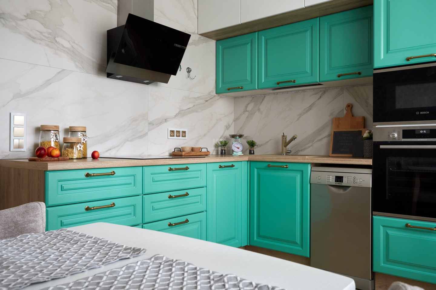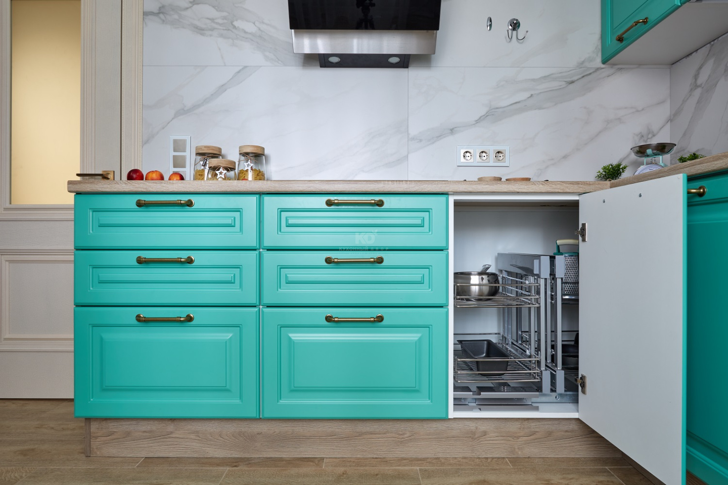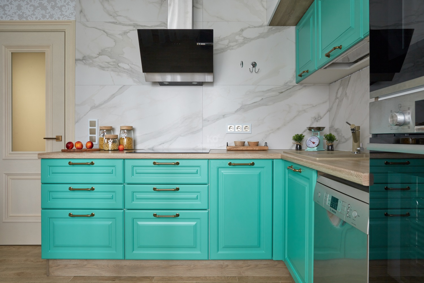 От кухни «Айвори» этому проекту достались сочные бирюзовые фасады из МДФ с прямоугольной фрезеровкой. Фрезеровка полностью имитирует филёнку классического фасада.