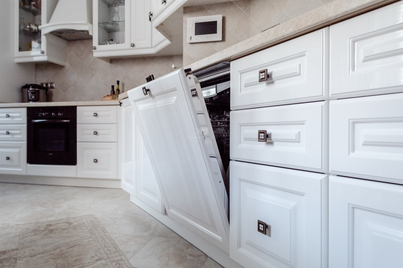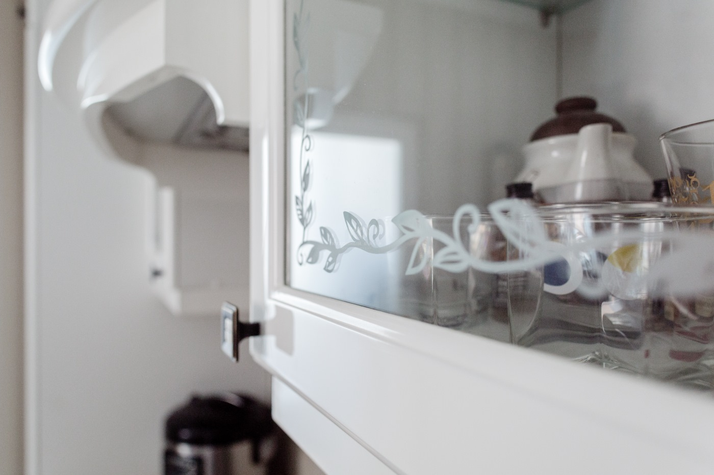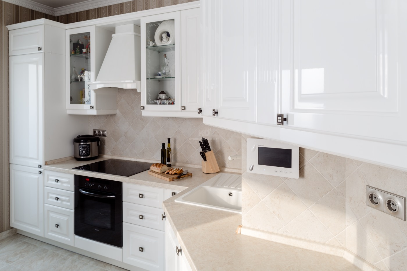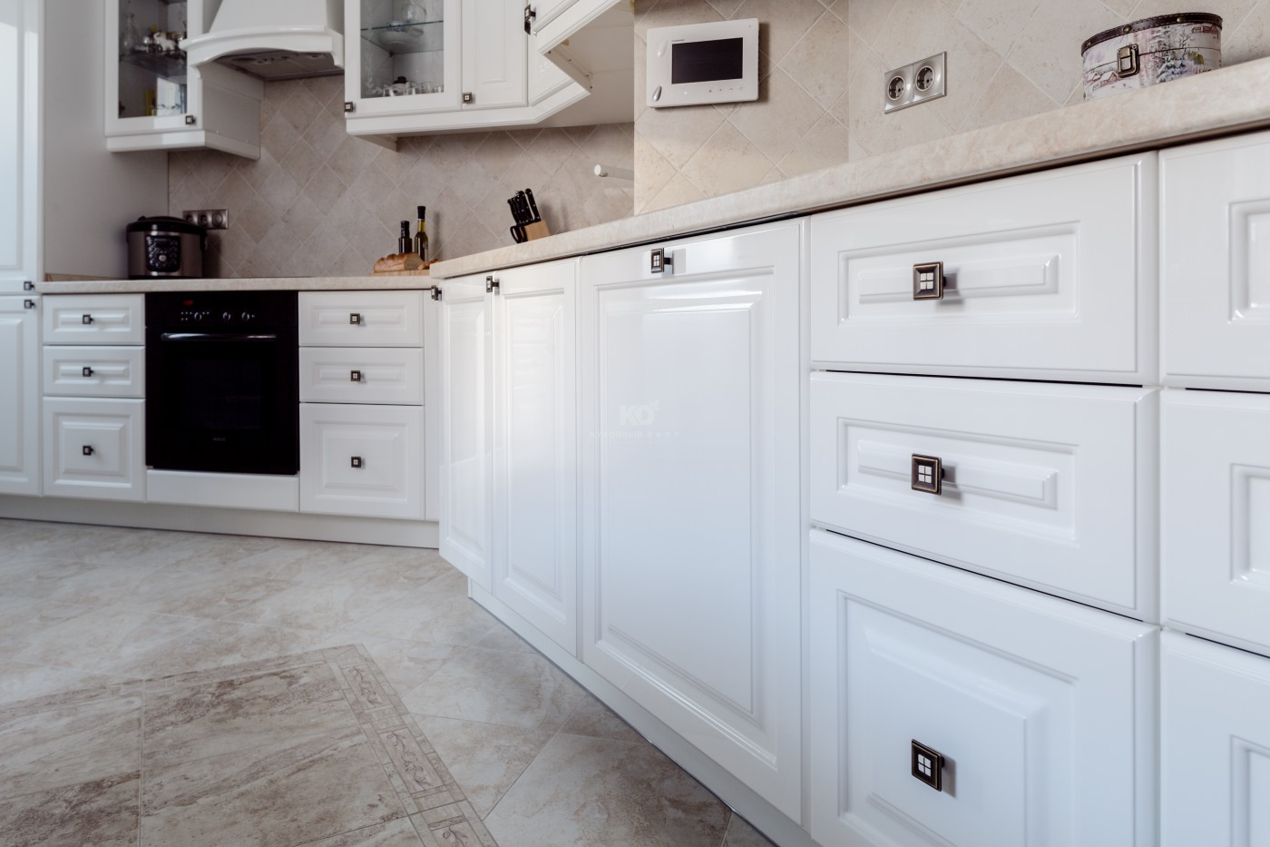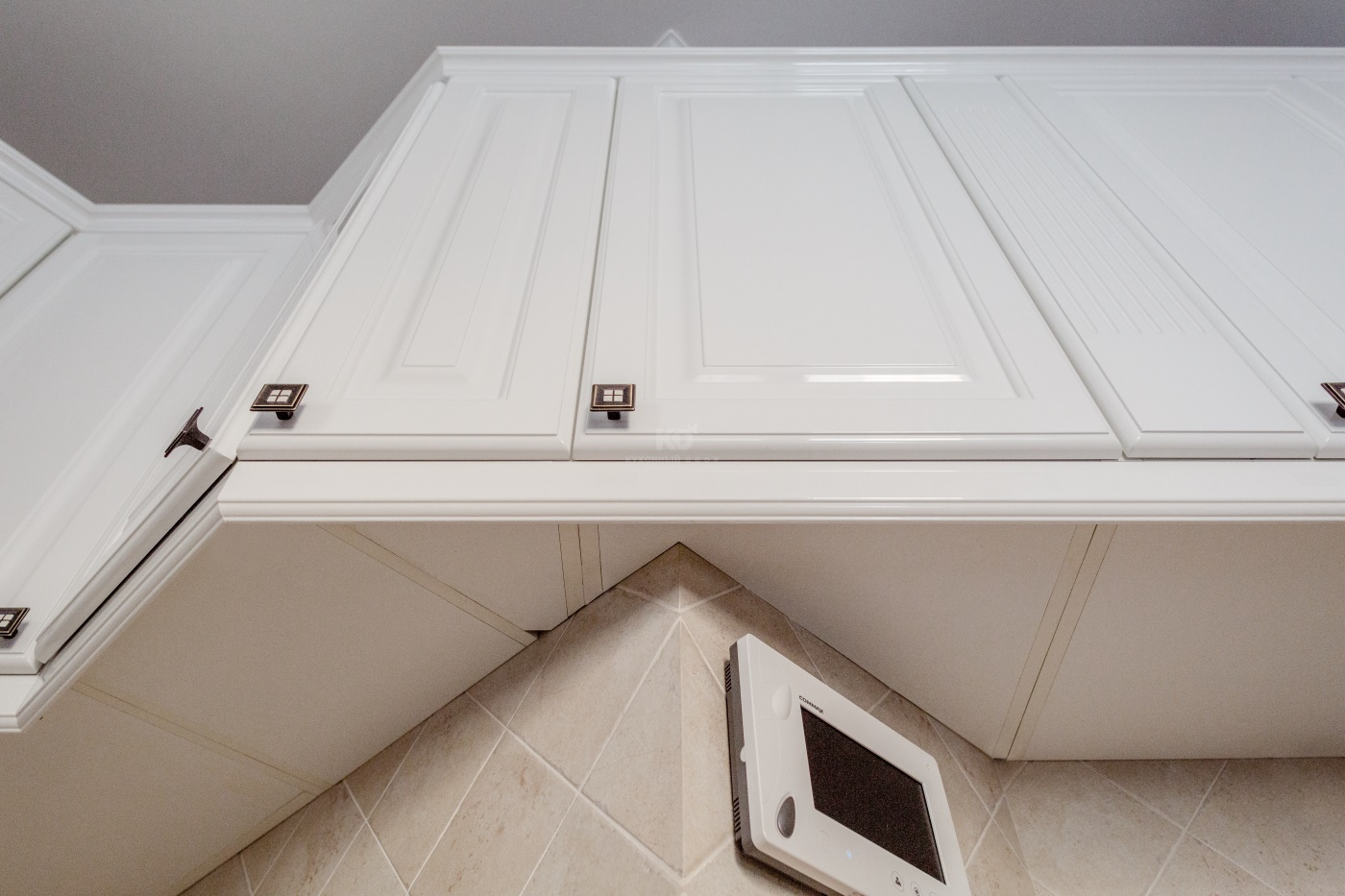 Кстати о фасадах. В 2011 году ни одна бренд, кроме «Кухонного Двора», не изготовляла их в белом ультраглянце. И вот, спустя семь лет использования, каждый модуль «Айвори» выглядит так, словно был создан вчера. Покрытие выдержало длительную активную эксплуатацию, не потеряв ни в качестве, ни в эстетике. Грации этой модели придают и стекла в открытых фасадах. Они окаймлены узорами, нанесенными методом пескоструйной обработки. Узоры с идеальной точностью повторяют орнамент напольной плитки. Этот невесомый штрих создает связь между гарнитуром и окружающим интерьером, придавая помещению цельный облик.