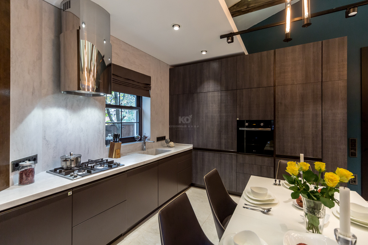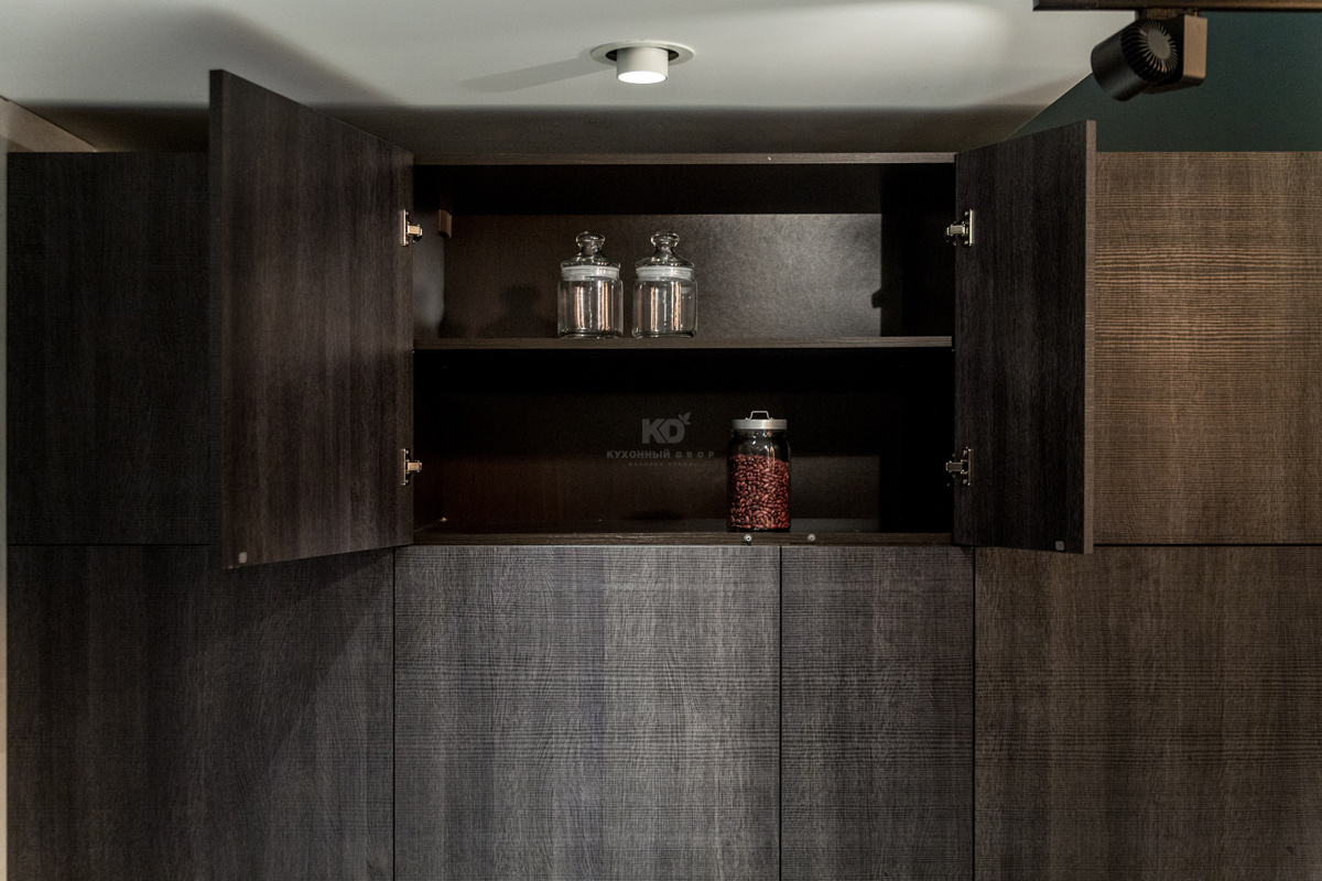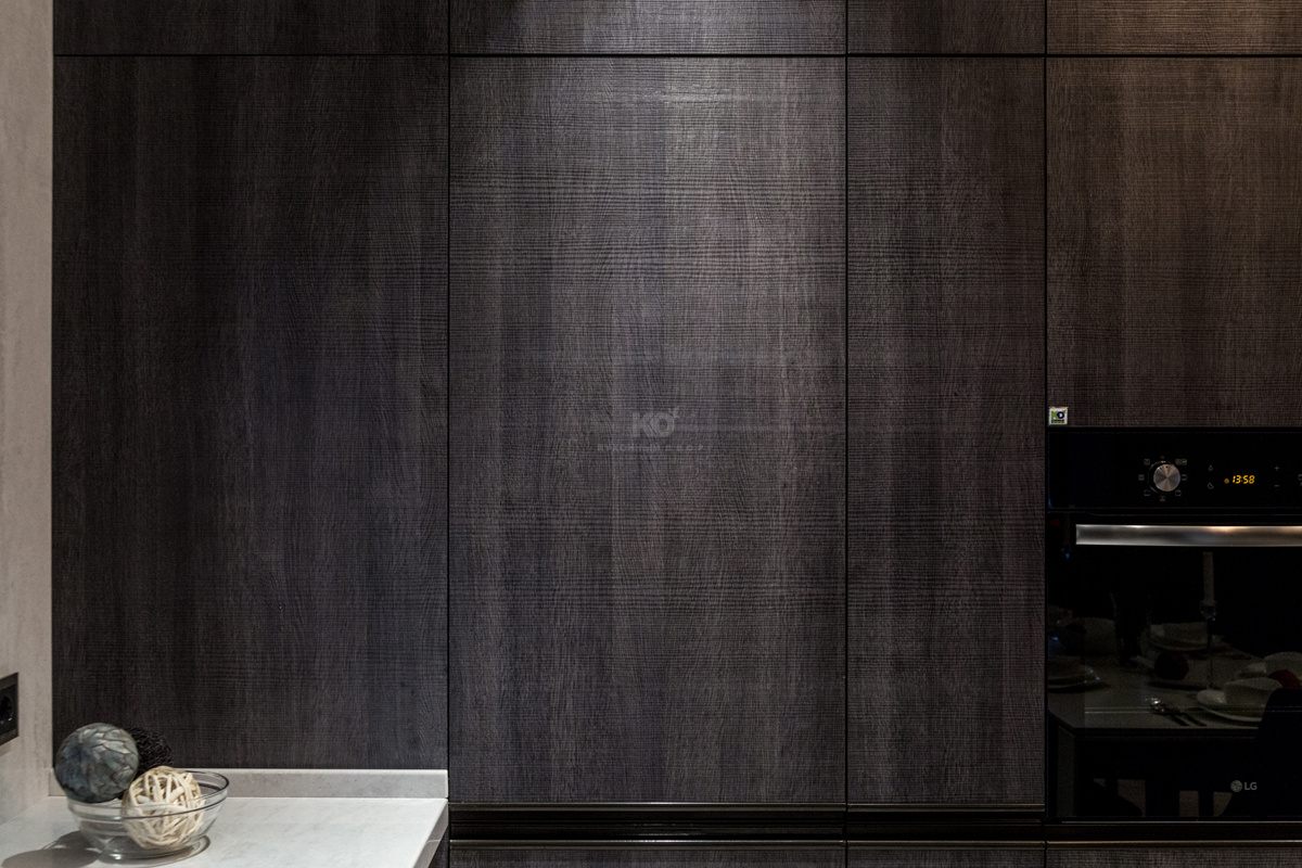Авторы проекта решительно освободили место для гостиной, урезав кухню. В выигрыше остались все: у хозяев появилась полноценная гостиная с мягкой зоной, вместо двух столов появился один, зато трехметровый, а «похудевшая» кухня стала стройнее и вместительнее прежней.Горизонтальную систему хранения, которая была у наших героев до переделки, заменили вертикальной. В результате часть боковой стены, практически до двери, заняли высокие шкафы в корпусах из ЛДСП цвета «венге». Эта лаконичная коллекция разрабатывалась совместно с немецкими дизайнерами.За фактурными фасадами из экомассива с красивым глубоким рельефом расположены антресольные шкафчики и выдвижные ящики. Кроме того, в «мертвых углах» установлены выкатные сетки LeMans, каждая из которых выдерживает нагрузку до 25 кг, а рядом с духовым шкафом расположена диспенса – цельная выкатная сетка, которая выдерживает до 100 кг нагрузки при ширине всего 30 см. Здесь же и встраиваемая техника: поднятая на комфортную высоту духовка и вместительный холодильник.
