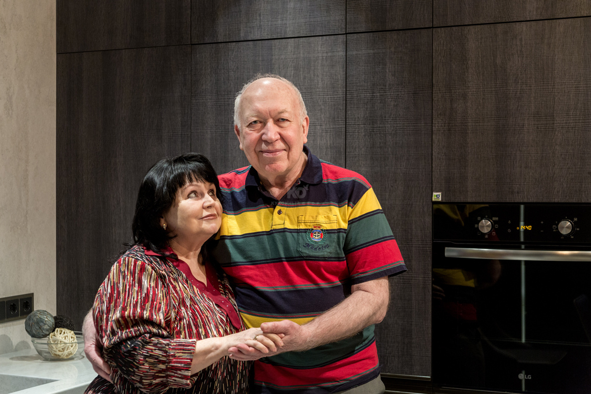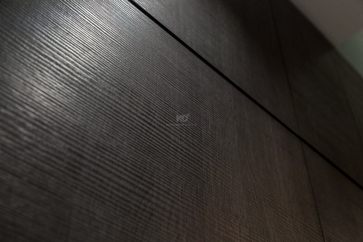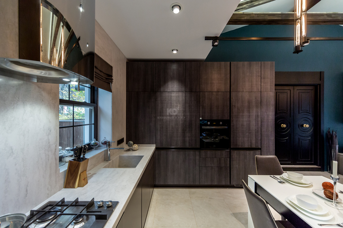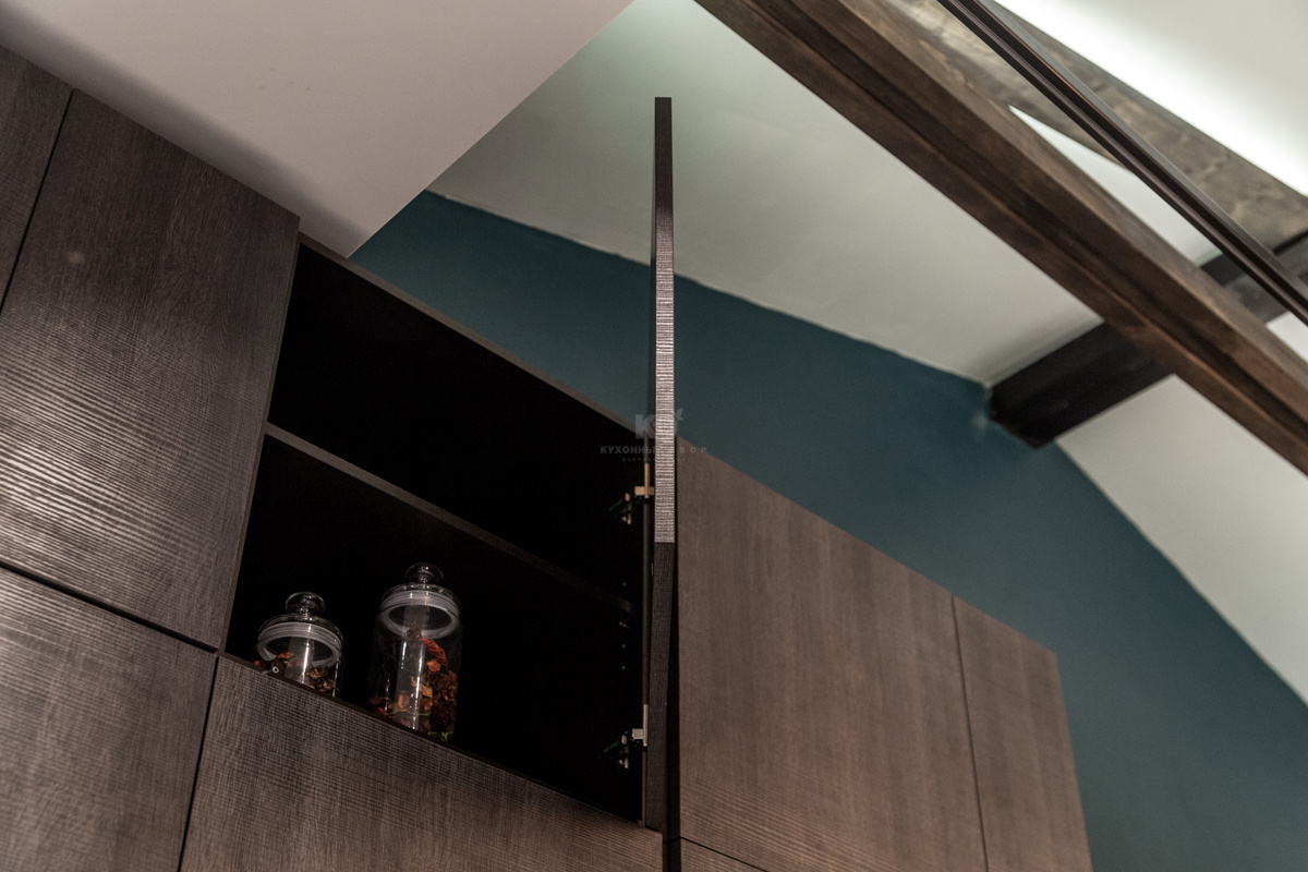 Авторы проекта решительно освободили место для гостиной, урезав кухню. В выигрыше остались все: у хозяев появилась полноценная гостиная с мягкой зоной, вместо двух столов появился один, зато трехметровый, а «похудевшая» кухня стала стройнее и вместительнее прежней.Горизонтальную систему хранения, которая была у наших героев до переделки, заменили вертикальной. В результате часть боковой стены, практически до двери, заняли высокие шкафы в корпусах из ЛДСП цвета «венге». Эта лаконичная коллекция разрабатывалась совместно с немецкими дизайнерами.За фактурными фасадами из экомассива с красивым глубоким рельефом расположены антресольные шкафчики и выдвижные ящики. Кроме того, в «мертвых углах» установлены выкатные сетки LeMans, каждая из которых выдерживает нагрузку до 25 кг, а рядом с духовым шкафом расположена диспенса – цельная выкатная сетка, которая выдерживает до 100 кг нагрузки при ширине всего 30 см. Здесь же и встраиваемая техника: поднятая на комфортную высоту духовка и вместительный холодильник.