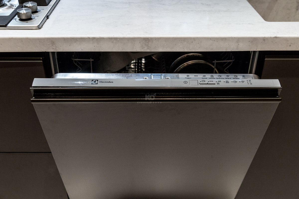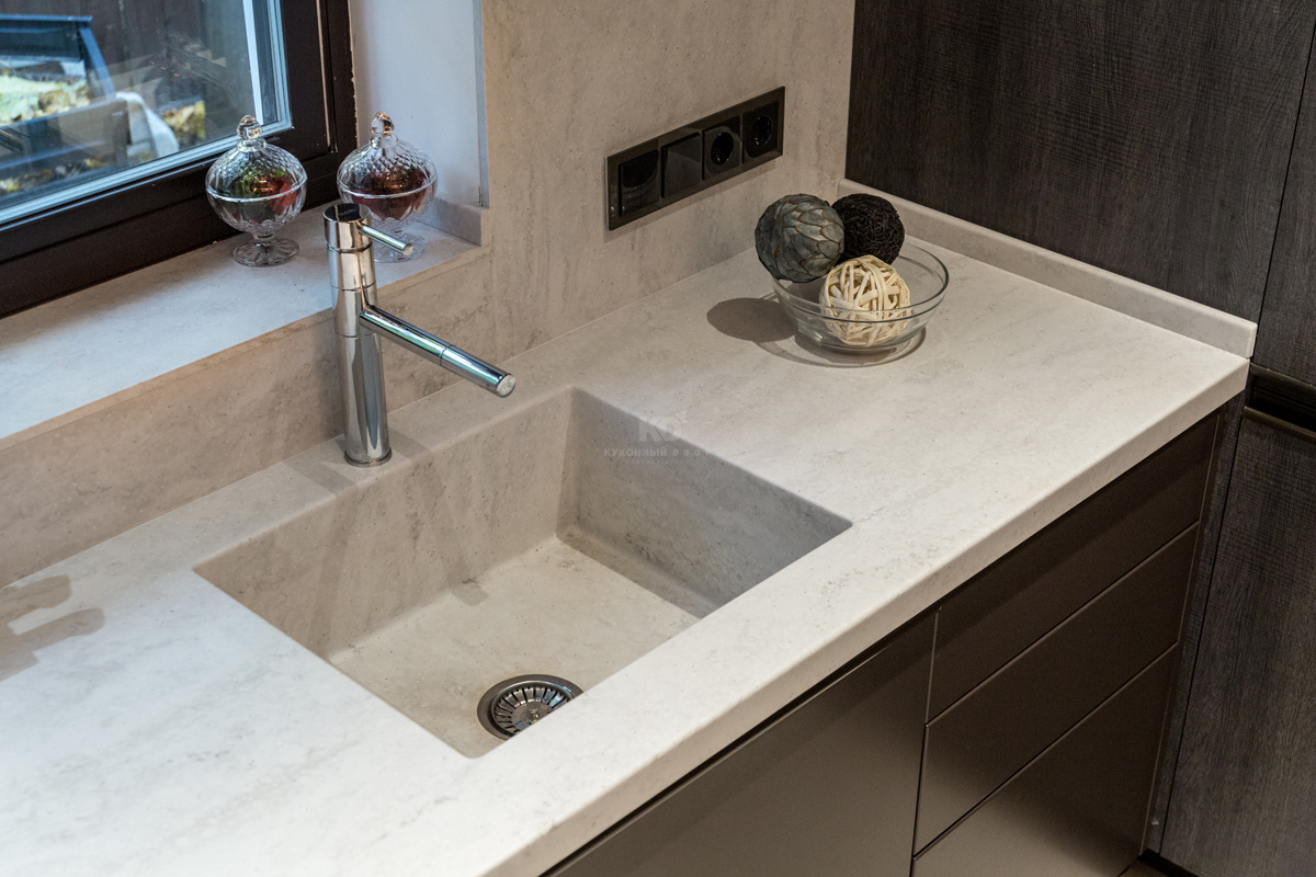 В отличие от шкафа-колонны, в основной рабочей зоне гладкие фасады из МДФ с интегрированными ручками. Пространство за ними тоже не пустует: здесь и выдвижные ящики, и отделение для двойного мусорного ведра с сеткой для хранения чистящих средств, и глубокие полки для кухонной утвари. Выдвижные ящики – с удобными лотками для хранения столовых приборов и необходимых хозяйственных мелочей. Выдвигаются и задвигаются ящики мягко и плавно благодаря доводчикам.Столешница с интегрированной мойкой внешне напоминает натуральный камень – этому способствует и характерный рисунок поверхности, и «природные» вкрапления. На самом деле они сделаны из акрилового камня – это водоотталкивающий материал высокой плотности, который производится из гидроксида алюминия, полиэфирных смол и стекловолокна. Чтобы подчеркнуть единство образа, стену за рабочей зоной и окно оформили тонкими плитами из того же материала.