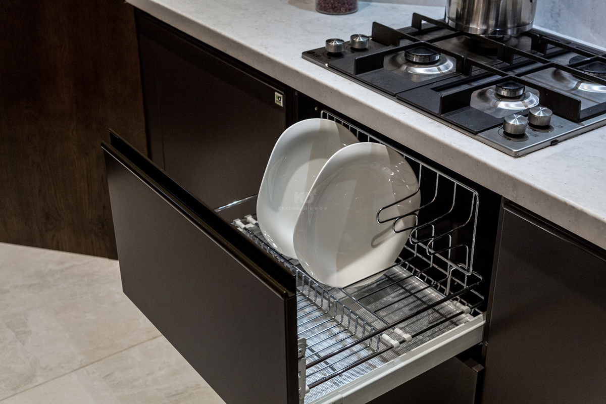 Обращаем Ваше внимание, что цена за погонный метр включает в себя: фасады выбранной категории, влагостойкую столешницу HPL (Германия) высокой прочности, корпуса ЛДСП Egger (Германия) с кромкой ABS, ящики с доводчиками , петли с доводчиками, ручки, алюминиевый поддон в стол под мойку, сушка (Италия), цоколь Volpato (Италия). Из расчета в размере 2400 мм.