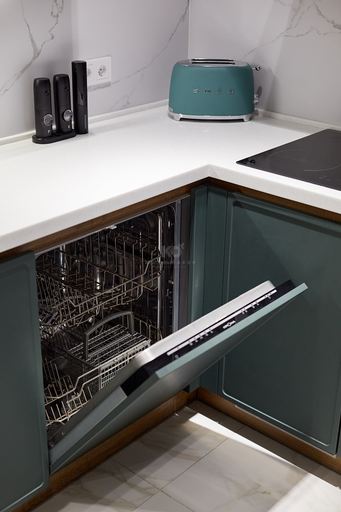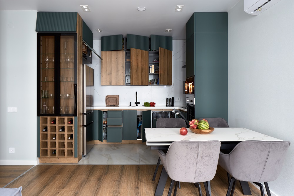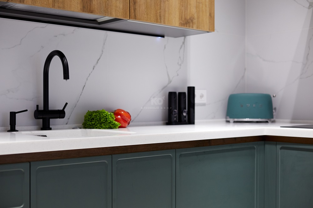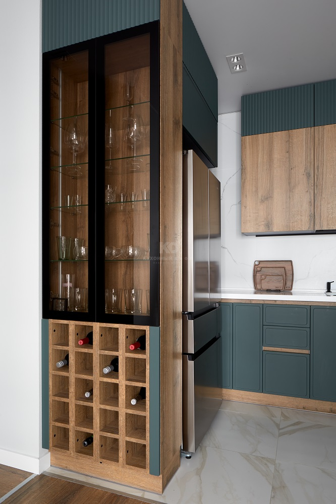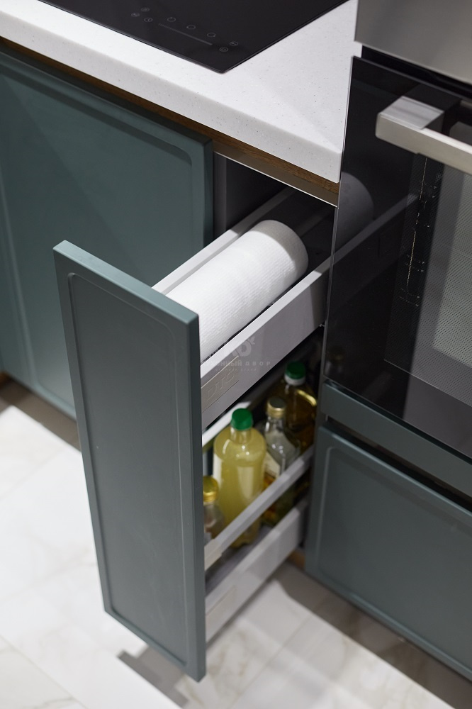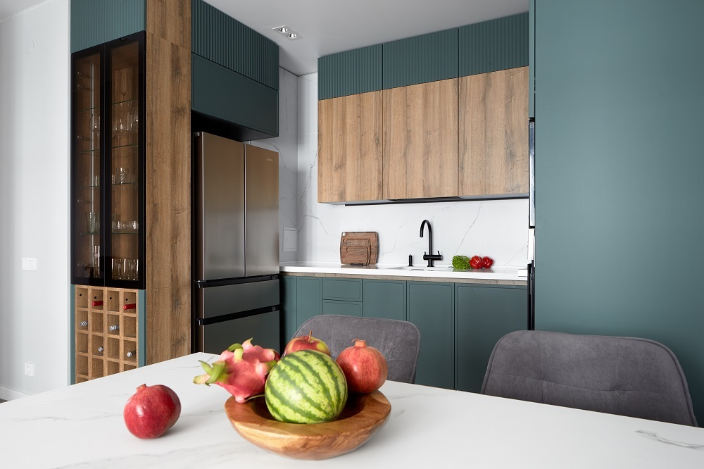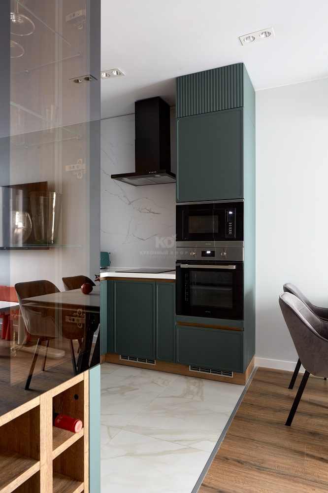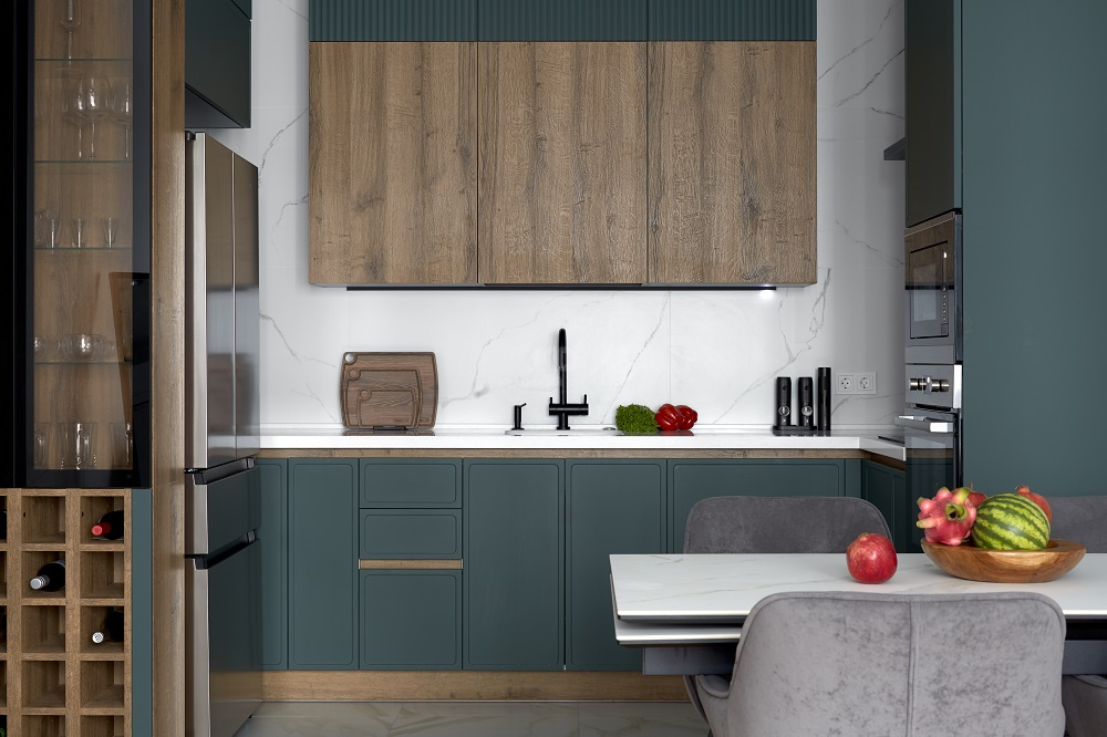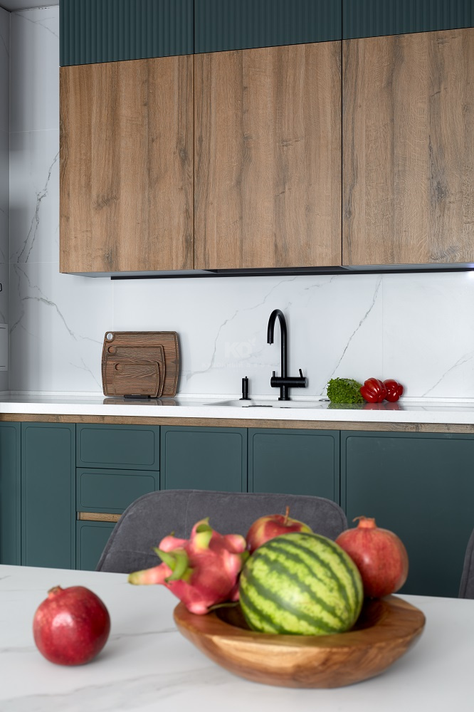 1. Цвета, фактуры и фрезеровка. В проекте реализовано великолепное сочетание глубокого зелёного цвета и фактур дуба. Зелёные фасады созданы из МДФ с «дышащей» экомембраной и украшены декоративной фрезеровкой (рамочная и вертикальная волнообразная). А элементы под дерево выполнены из лёгкой, прочной и долговечной экоплиты «Эггер» (Германия), с неповторяющимся древесным рисунком. Облик кухни – это стопроцентное попадание в актуальные тренды, основанные на комбинации современного стиля и природной красоты!