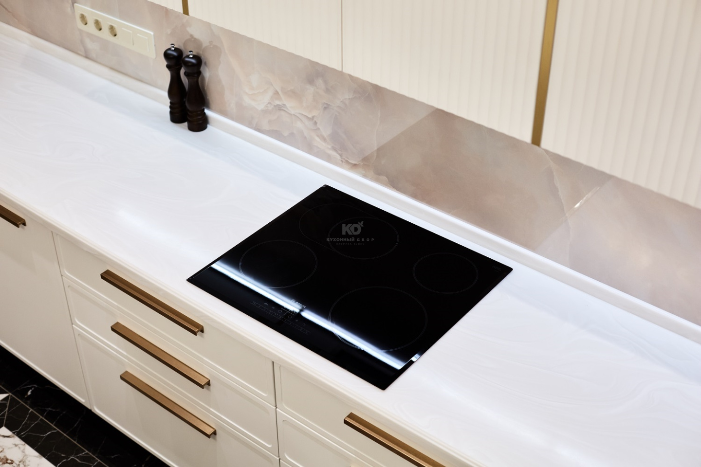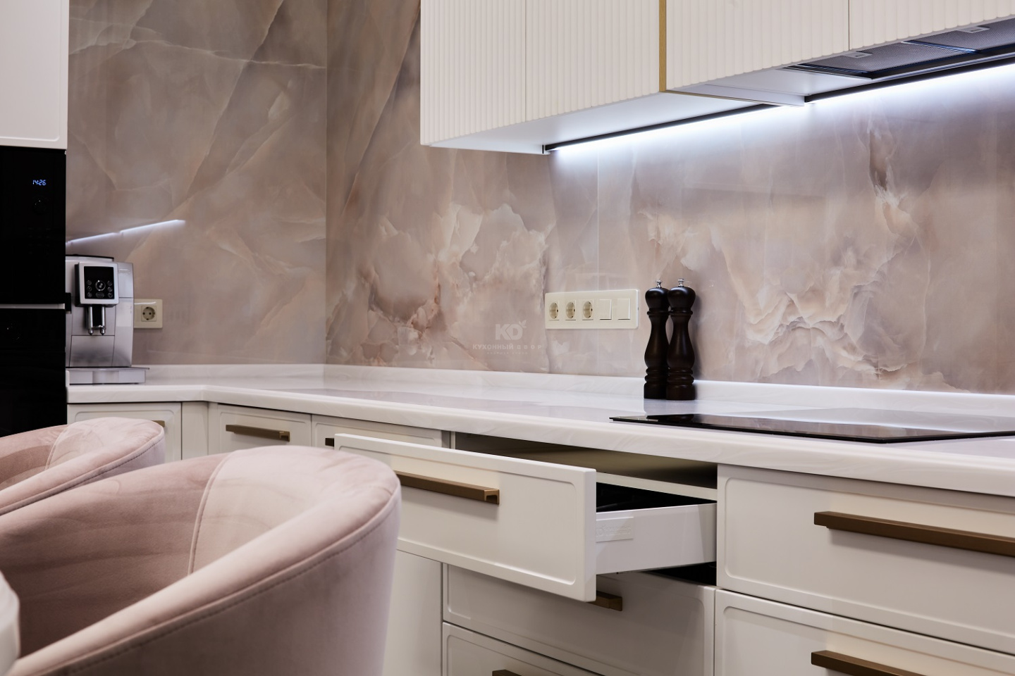 А что по внутреннему оснащению? Оно под стать внешней красоте! «Джейн» имеет ультрасовременную варочную поверхность, СВЧ и духовой шкаф на удобной высоте, скрытую вытяжку высокой мощности, полноразмерную ПММ, два холодильника и мойку с двумя чашами, интегрированную в столешницу из искусственного камня. Зона мойки оснащена дозаторами для моющих средств и фильтром для очистки воды, а под одной из чаш установлен мощный измельчитель пищевых отходов.