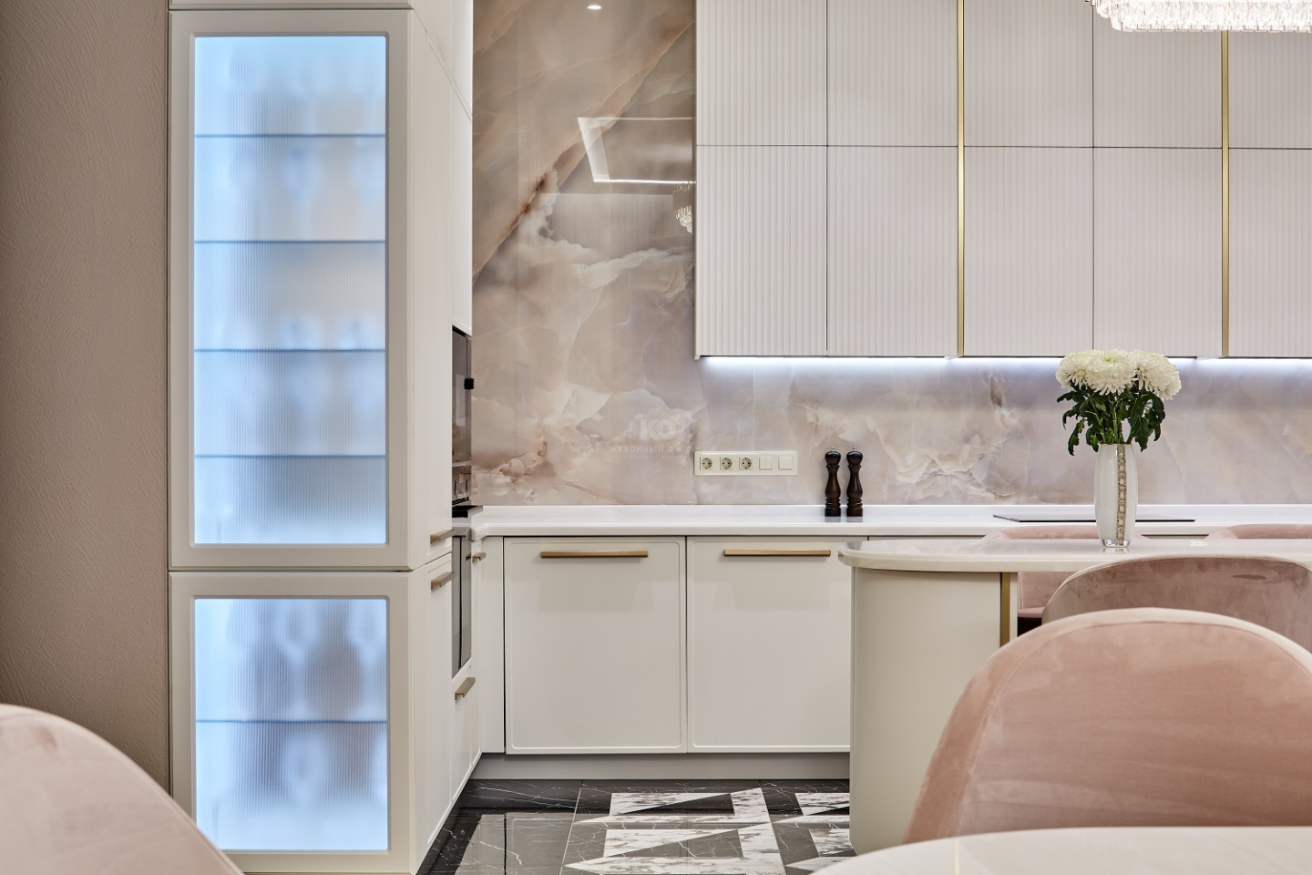 «Джейн» выполнена в три яруса и выстроена П-образно, а овальный остров с радиусными фасадами установлен в центре всей композиции. Одного взгляда на количество мебели достаточно, чтобы понять – на этой кухне нет недостатка в полезном пространстве. Огромное количество ящиков и обилие высоких пеналов позволяет хозяевам с комфортом хранить большой объём продуктов, утвари и мелкой бытовой техники. За многими фасадами скрыты современные выкатные системы хранения и удобные органайзеры. Место для хранения есть и в острове – радиусные элементы являются полноценными фасадами и могут открываться. А для особо красивой посуды предусмотрены два эффектных буфета с матированными стёклами, зеркальными задними стенками и подсветкой!