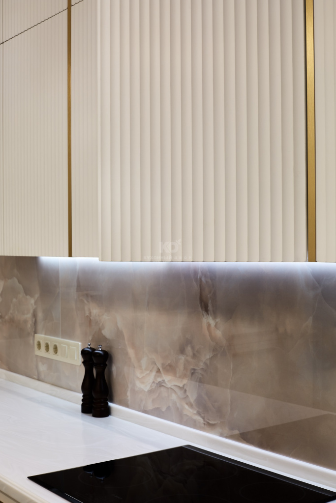 Особое внимание стоит уделить фасадам «Джейн». Они созданы из МДФ с покрытием «Regen Skin», способным самовосстанавливаться после мелких царапин. Покрытие обладает приятной «бархатистой» текстурой и высокоустойчиво к загрязнениям. Прикасаться к поверхностям этой кухни – особое удовольствие, и наиболее яркие тактильные ощущения дарят фасады верхнего яруса в центральной зоне. Они имеют эксклюзивную вертикальную фрезеровку, за которую «Джейн Вертикаль» и получила своё имя.