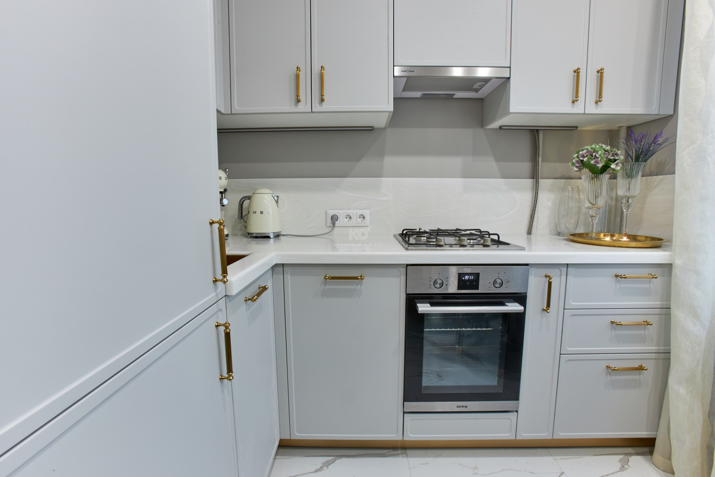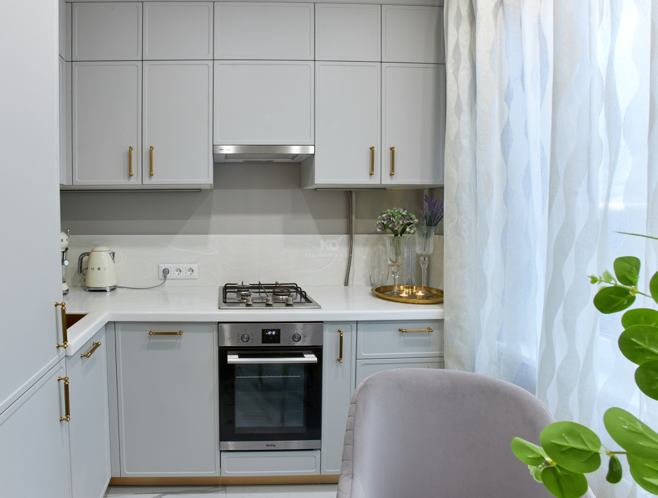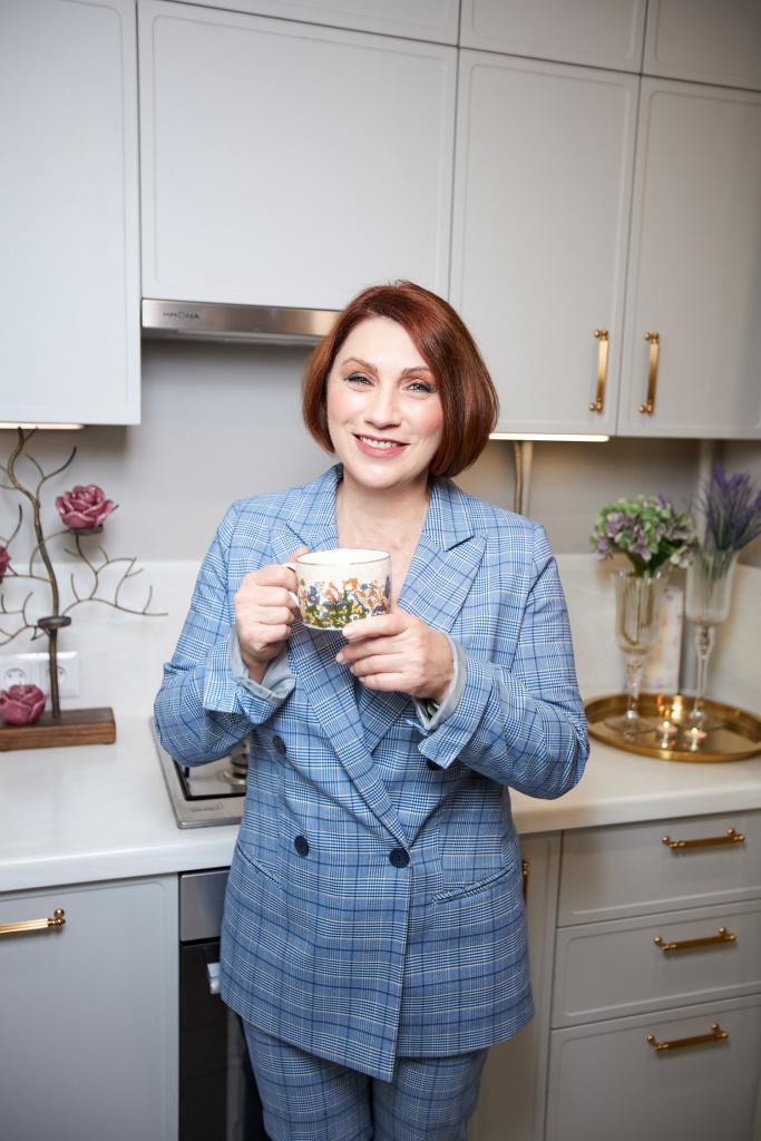 Роза Сябитова позаботилась и о выразительности кухни, выбрав для мойки, фурнитуры и цоколя «золотой» цвет. Элементы выглядят как изящные ювелирные украшения, дополняющие образ невесты. Они превосходно сочетаются с палитрой фасадов, фартука и столешницы «Джейн». Уют, красота, стиль, функциональность и ничего лишнего – вот что такое завидная кухня от КД и Розы Сябитовой!