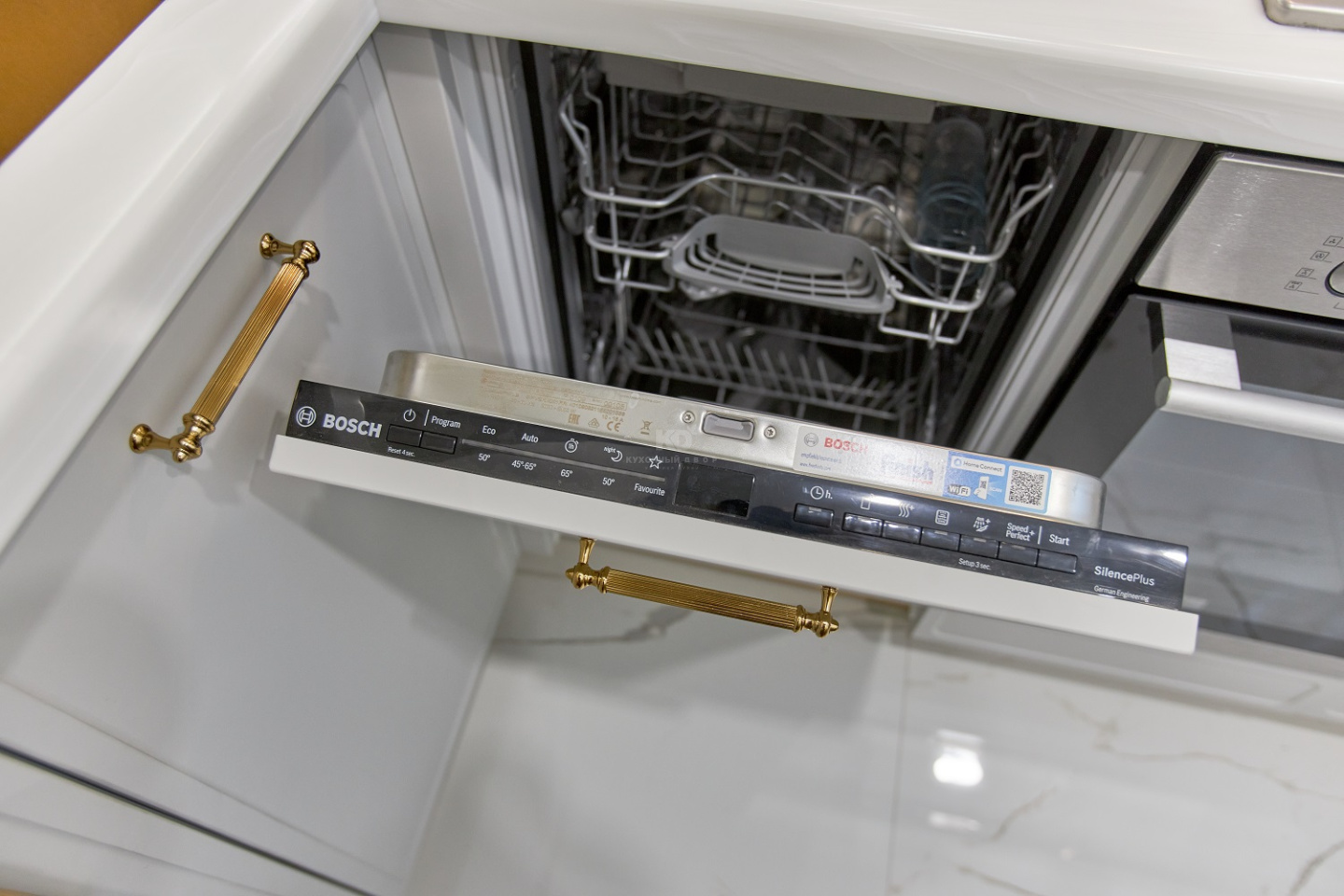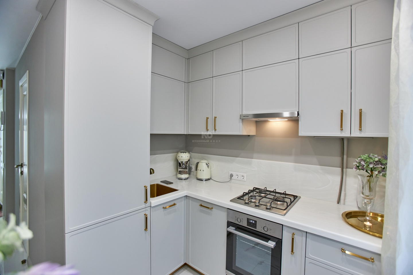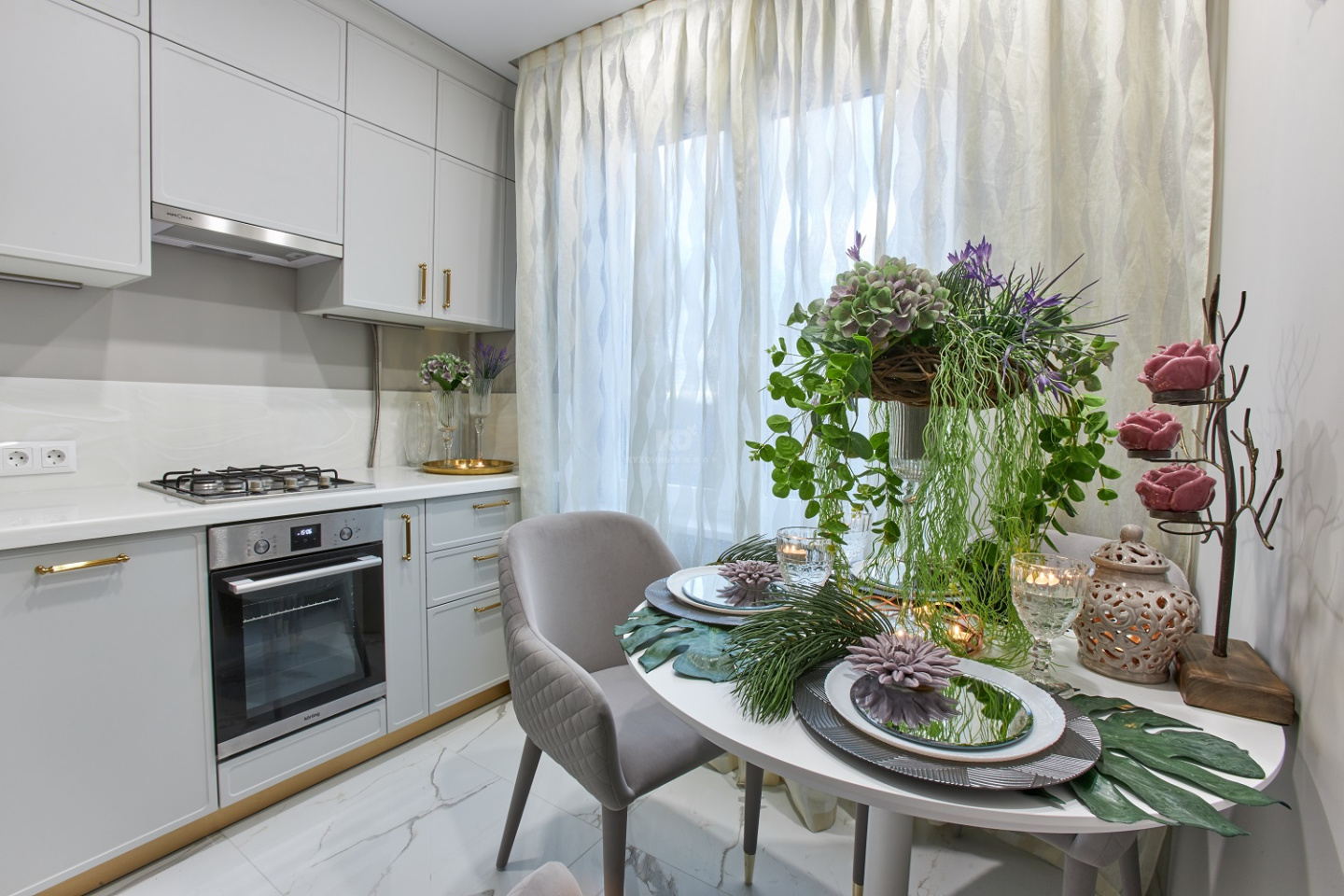 Роза Сябитова позаботилась и о выразительности кухни, выбрав для мойки, фурнитуры и цоколя «золотой» цвет. Элементы выглядят как изящные ювелирные украшения, дополняющие образ невесты. Они превосходно сочетаются с палитрой фасадов, фартука и столешницы «Джейн». Уют, красота, стиль, функциональность и ничего лишнего – вот что такое завидная кухня от КД и Розы Сябитовой!