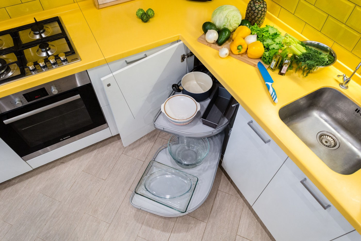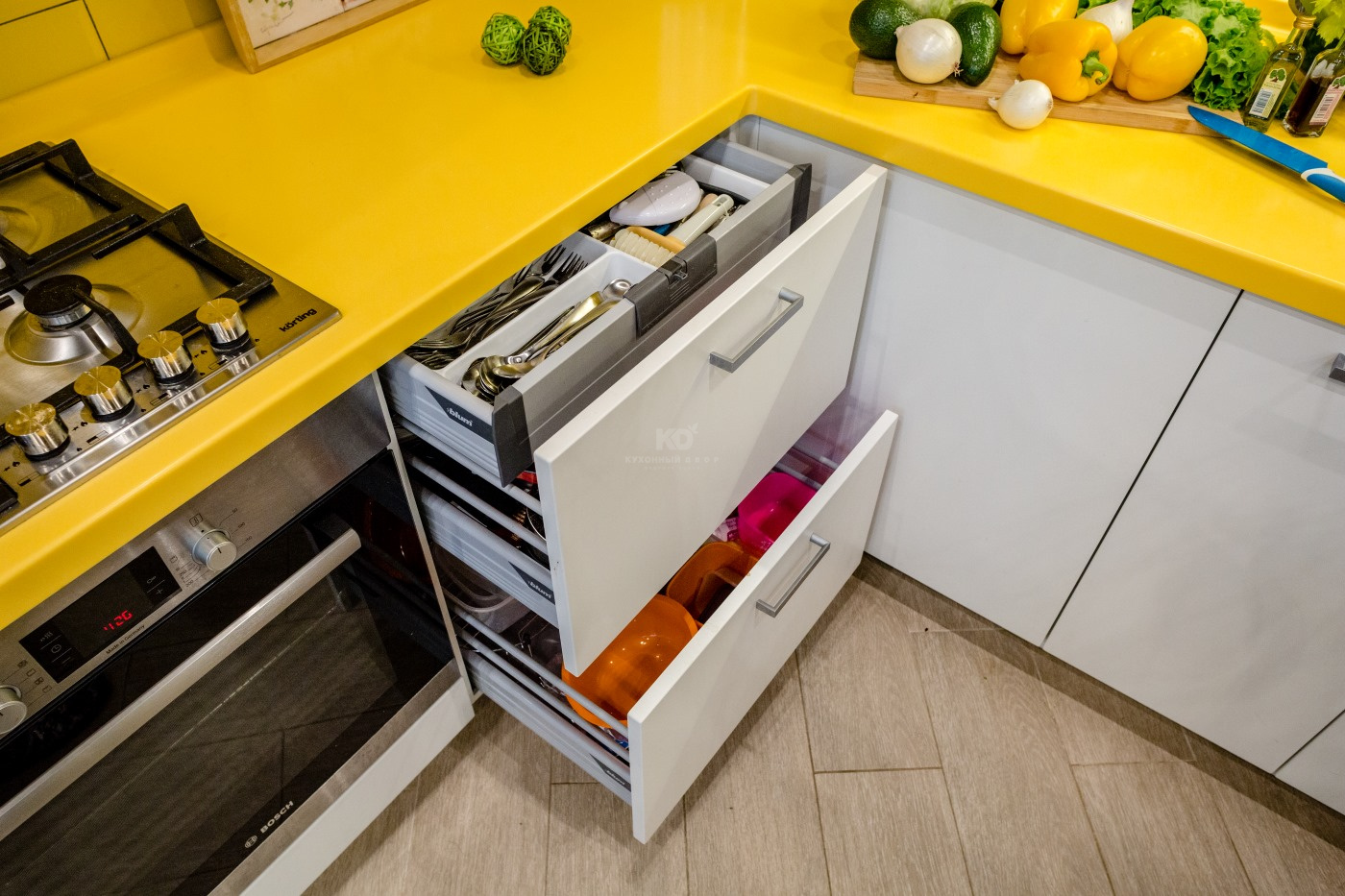 Внутреннее наполнение гарнитура создавалось с акцентом на эргономичность. «Эмму» оснастили сетками, выдвижными ящиками Blum, встраиваемой техникой Bosch и другим полезным оборудованием.